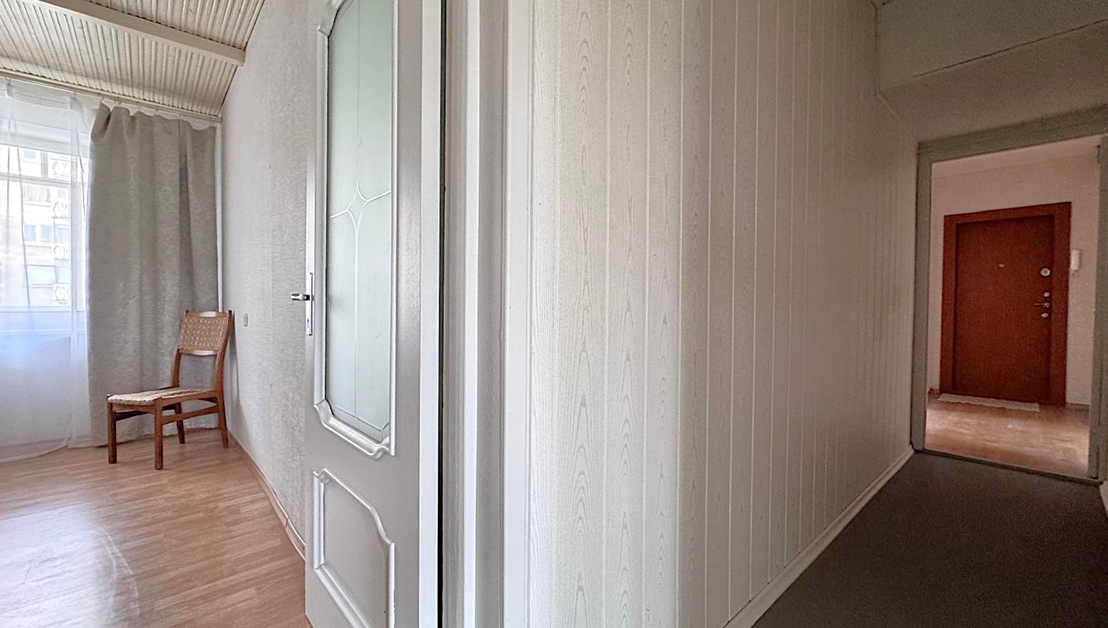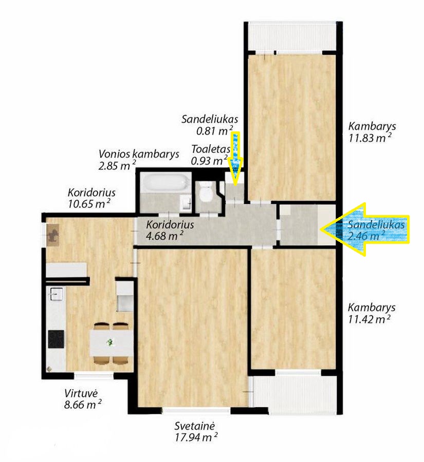 • Trys izoliuoti kambariai, beveik 9 kv. m virtuvė