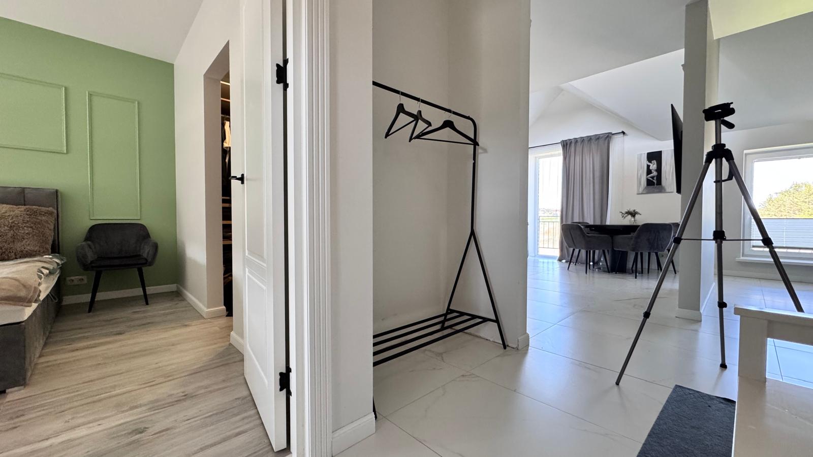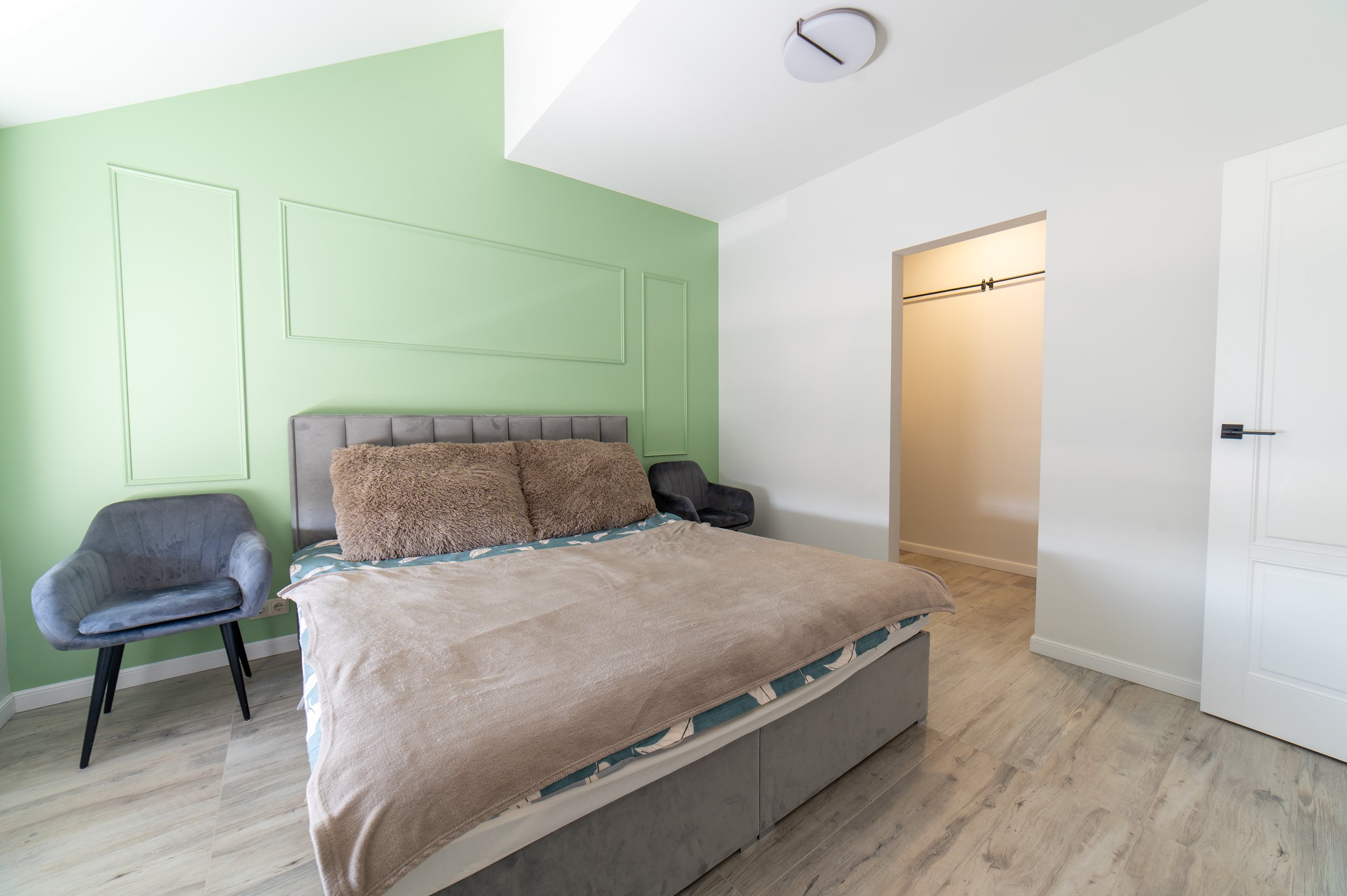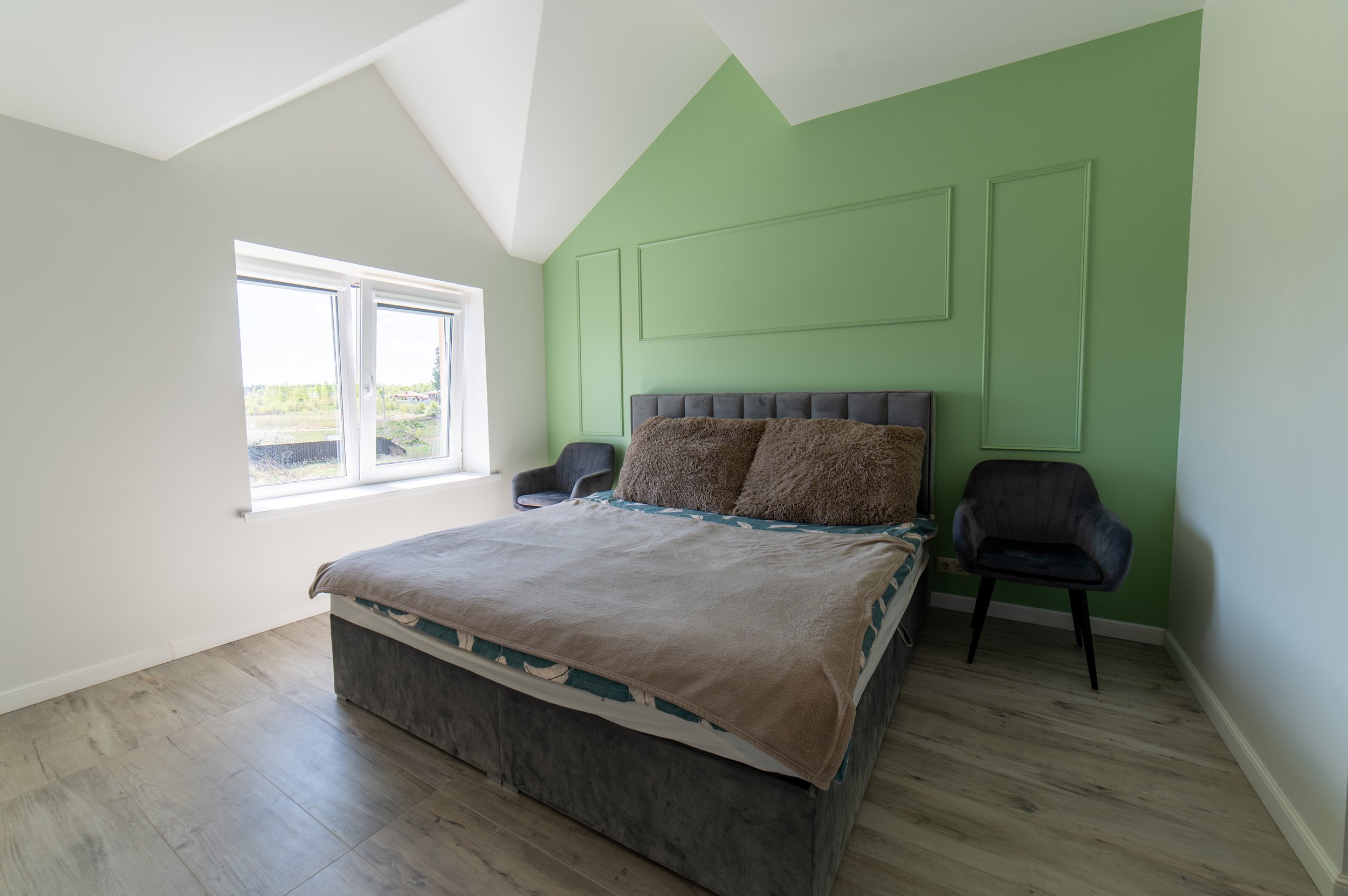 Šalia – ramus miegamasis su atskira garderobine, ideali vieta poilsiui. Greta – šiuolaikiškai įrengtas vonios kambarys, kuriame dominuoja kokybė ir natūralūs tonai.