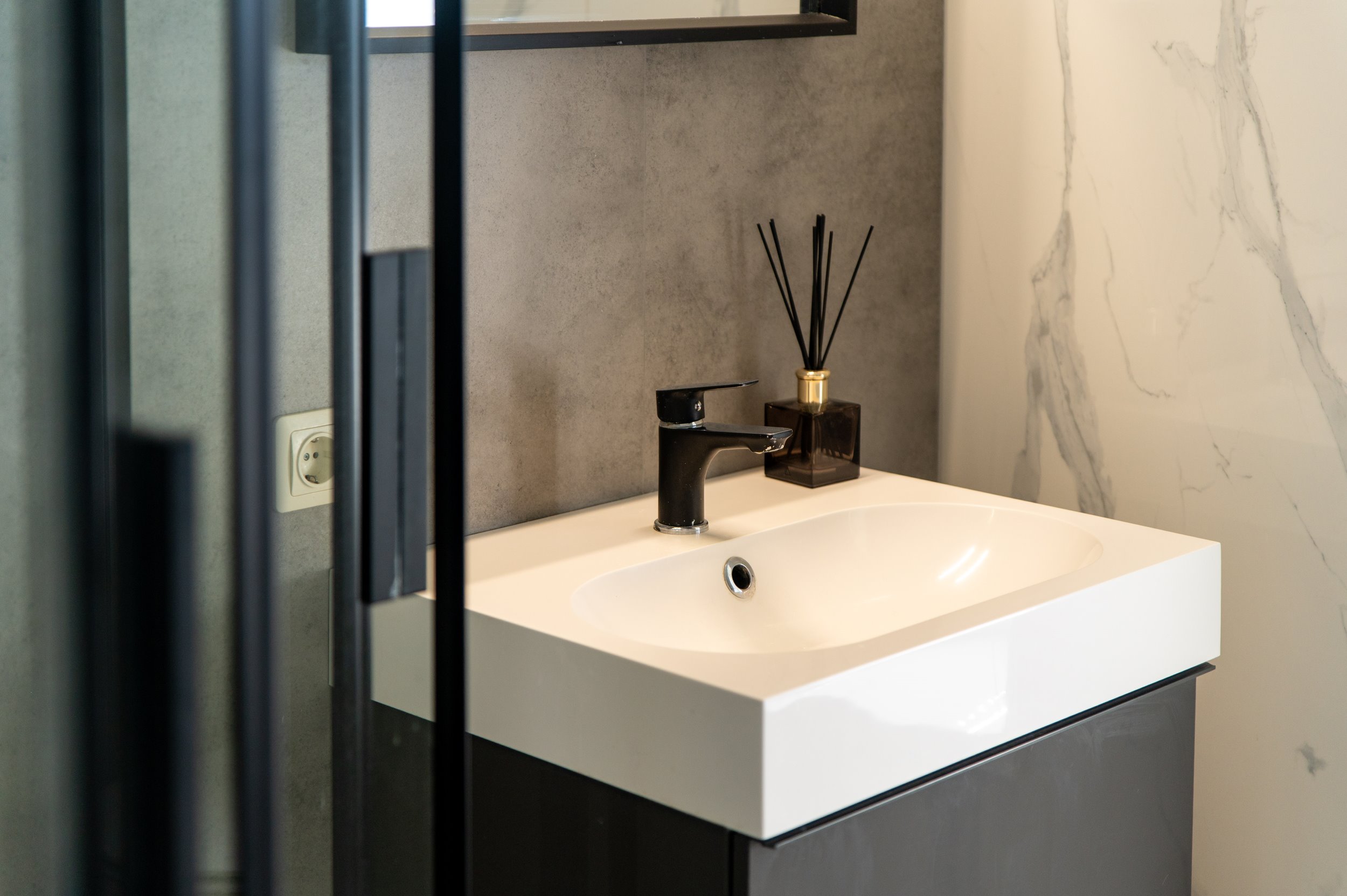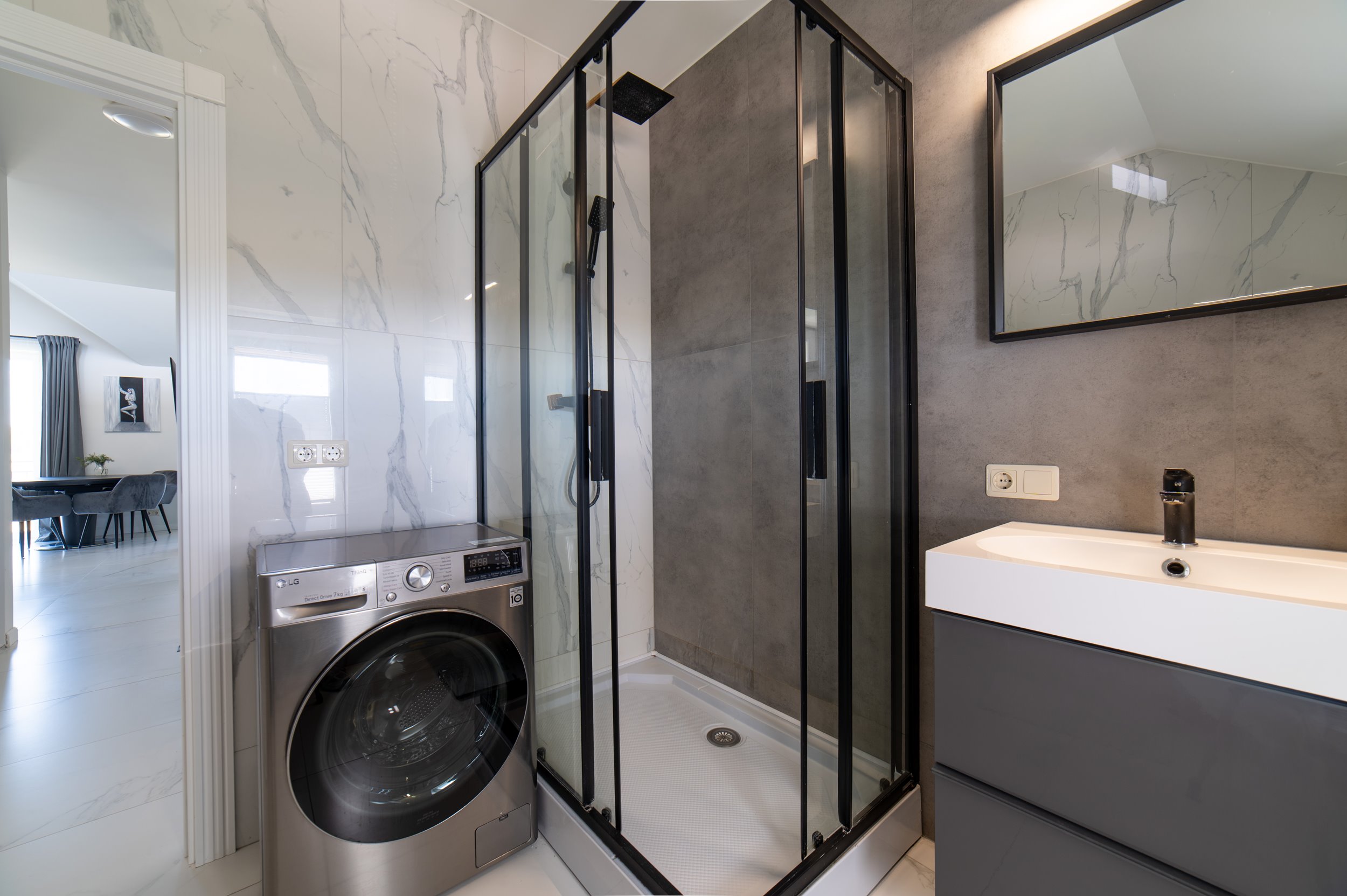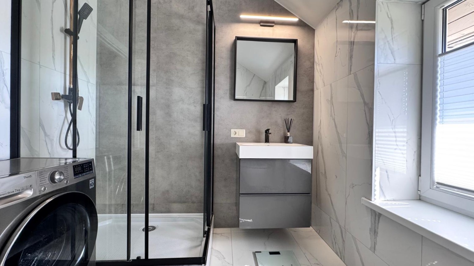 Šalia – ramus miegamasis su atskira garderobine, ideali vieta poilsiui. Greta – šiuolaikiškai įrengtas vonios kambarys, kuriame dominuoja kokybė ir natūralūs tonai.
