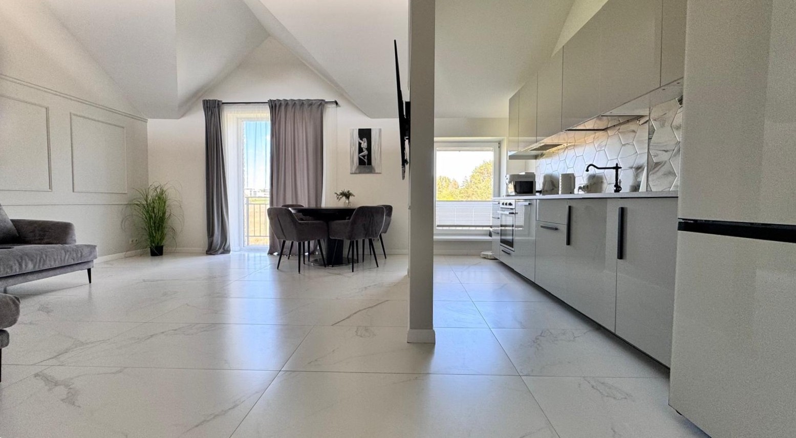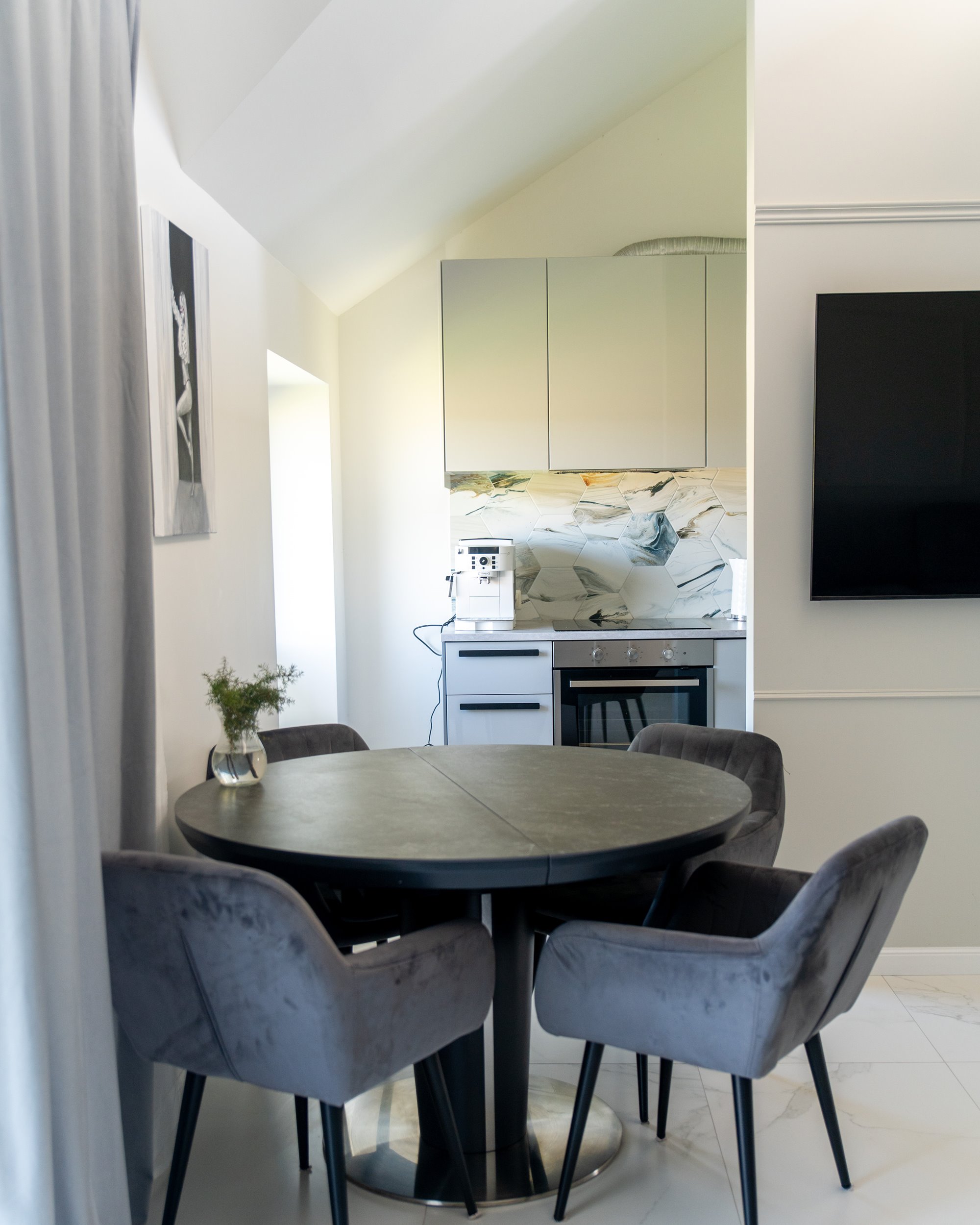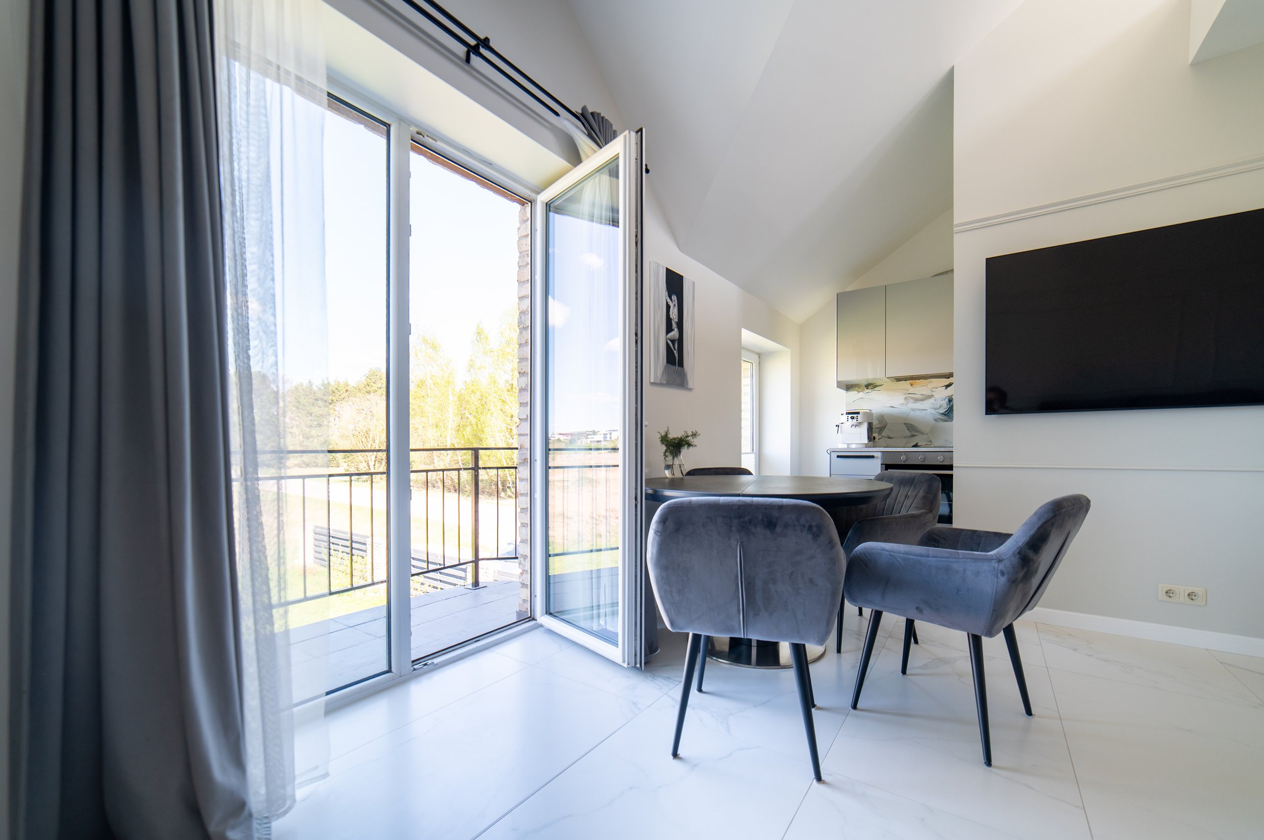 Čia darniai susilieja svetainė, virtuvė ir valgomasis, suprojektuoti kasdieniam patogumui ir jaukiems vakarams. Dideli vitrininiai langai įleidžia gausybę natūralios šviesos, o išėjimas į balkoną leidžia mėgautis rytine kava ar ramiais vakarais su vaizdu į žalumą.