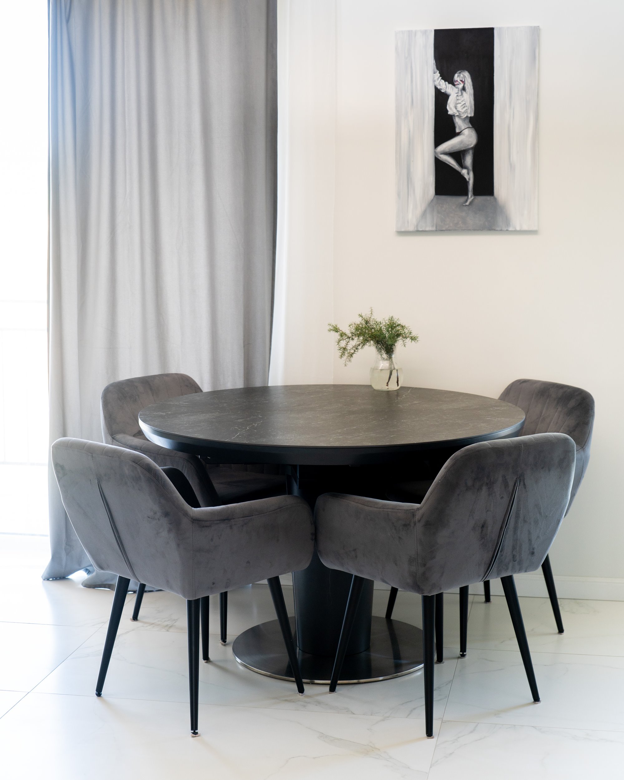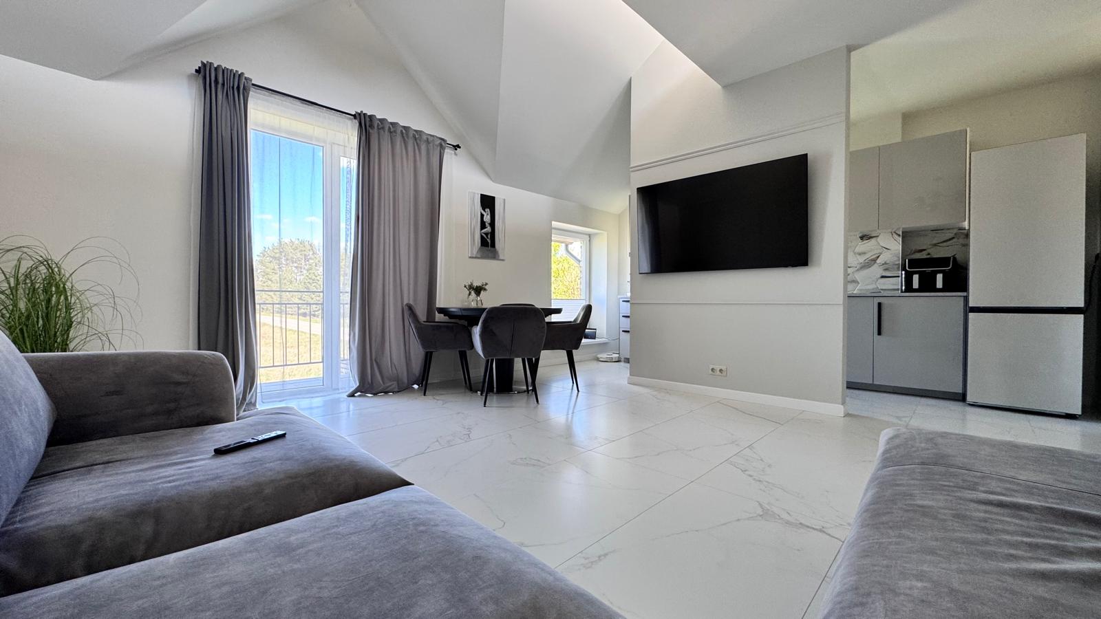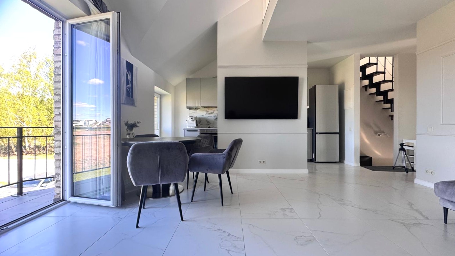 Čia darniai susilieja svetainė, virtuvė ir valgomasis, suprojektuoti kasdieniam patogumui ir jaukiems vakarams. Dideli vitrininiai langai įleidžia gausybę natūralios šviesos, o išėjimas į balkoną leidžia mėgautis rytine kava ar ramiais vakarais su vaizdu į žalumą.