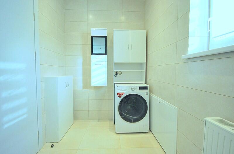 Kitchen with dining room, one bedroom, cozy living room. Comfortable bath with shower cabin in one space with WC. There is a separate sanitary room with a laundry room and space for things or outdoor furniture. A spacious built-in wardrobe in the bedroom and a multi-functional wardrobe in the hall.