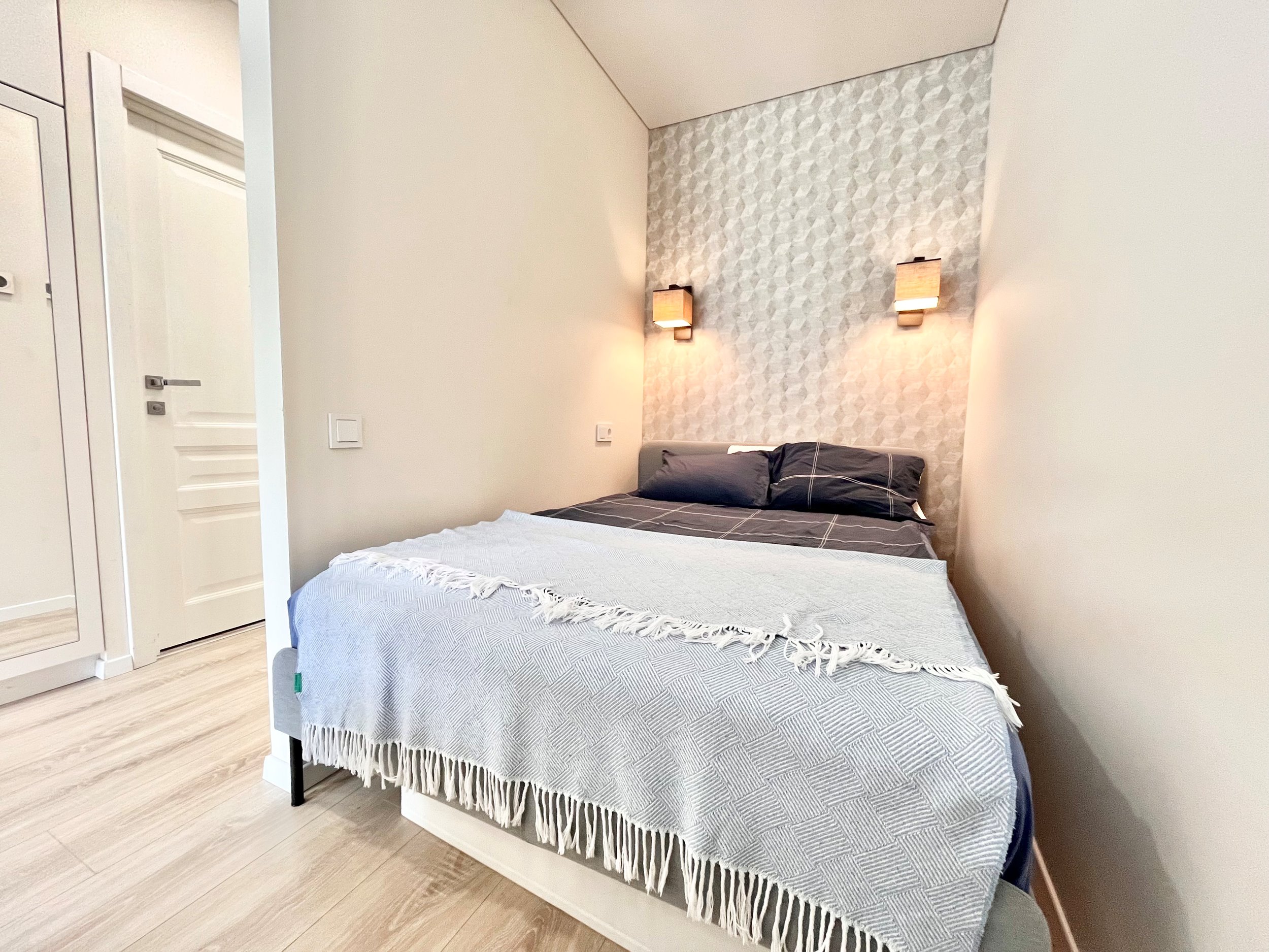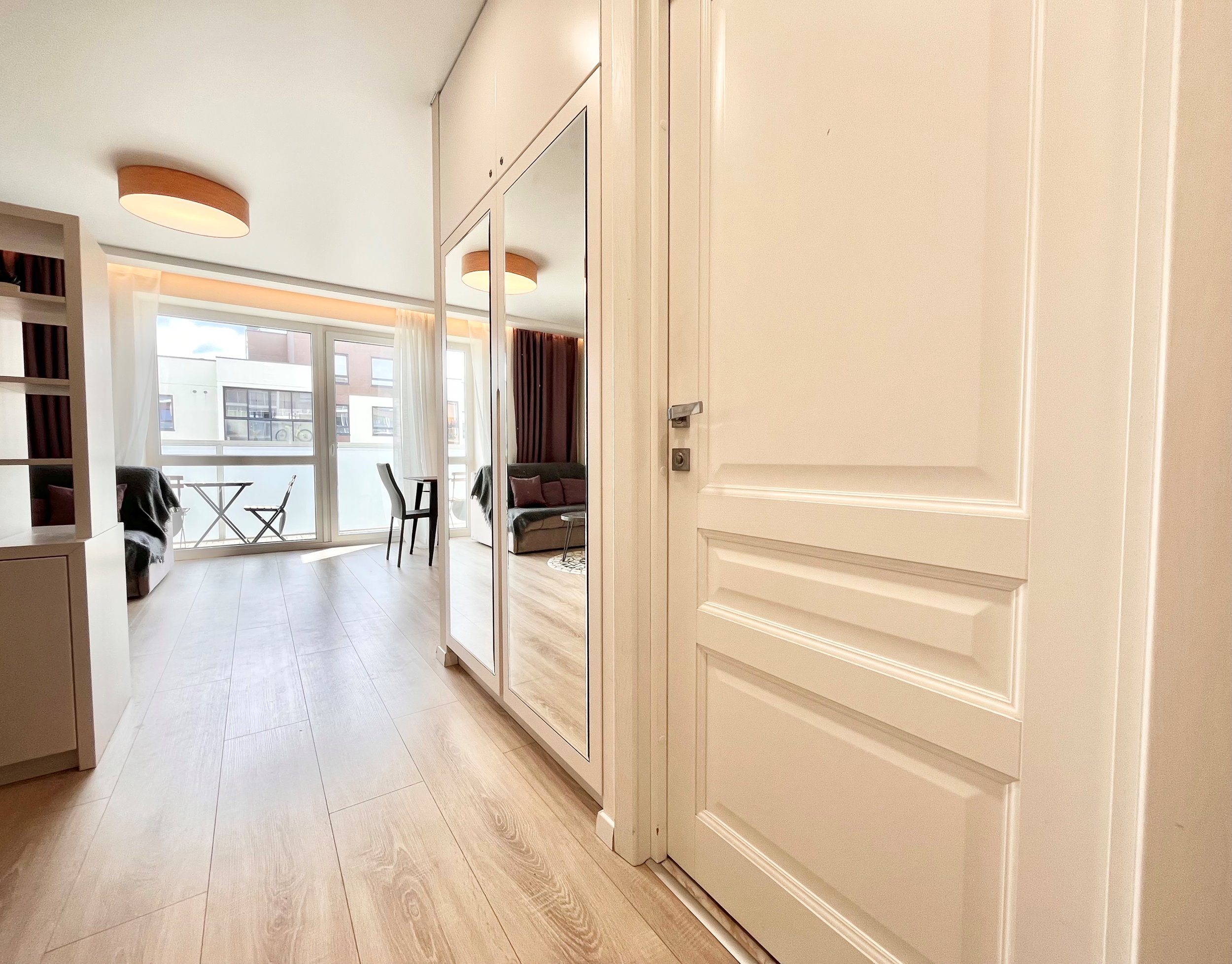 Jaukus ir šiuolaikiškas 1,5 kambario butas su erdviu balkonu ir galimybe išsinuomoti parkavimo vietą Išnuomojamas modernus, funkcionaliai išplanuotas 35 kv. m butas 4-ame aukšte iš 6, naujos statybos (2017 m.) name su liftu.