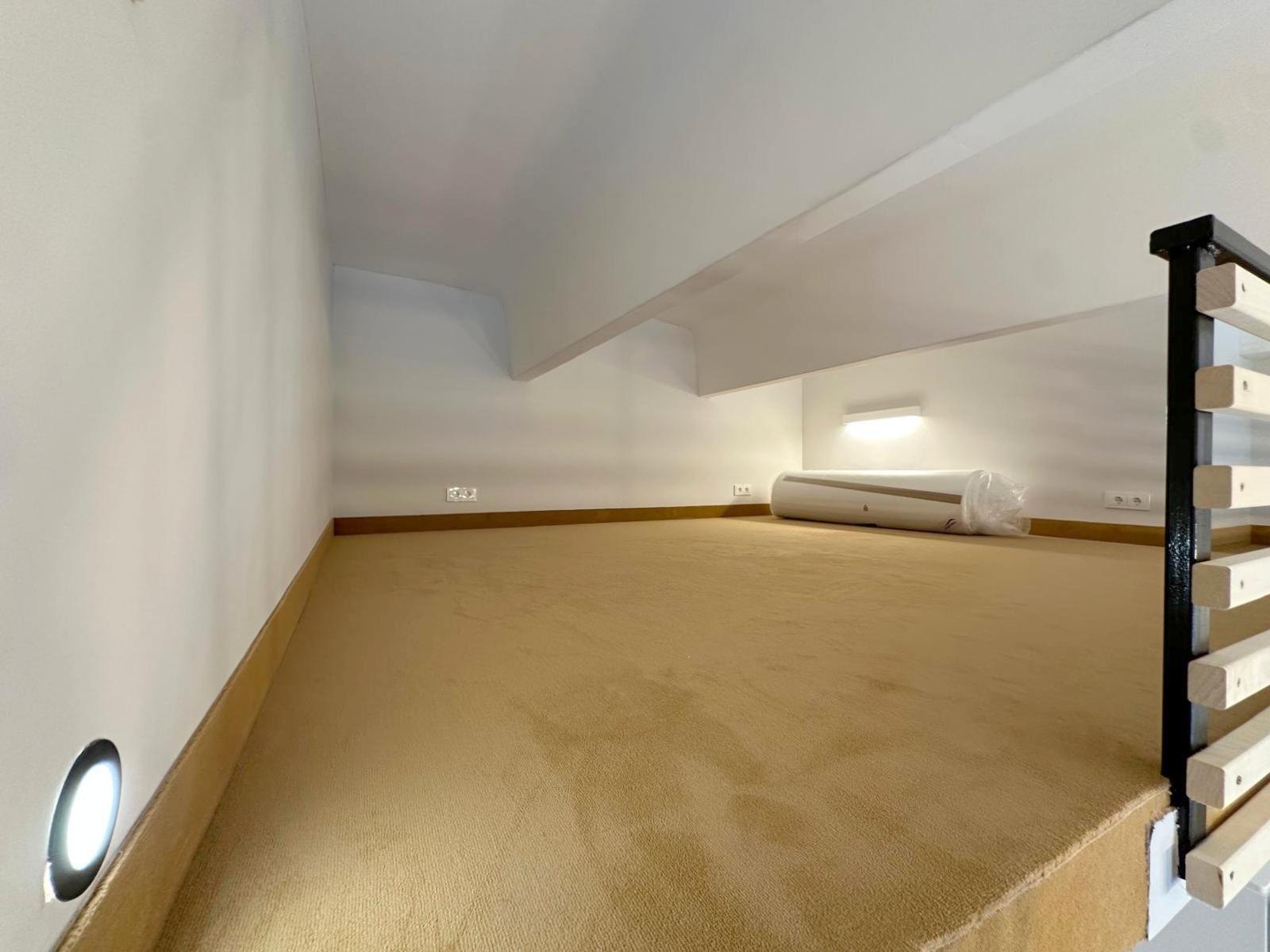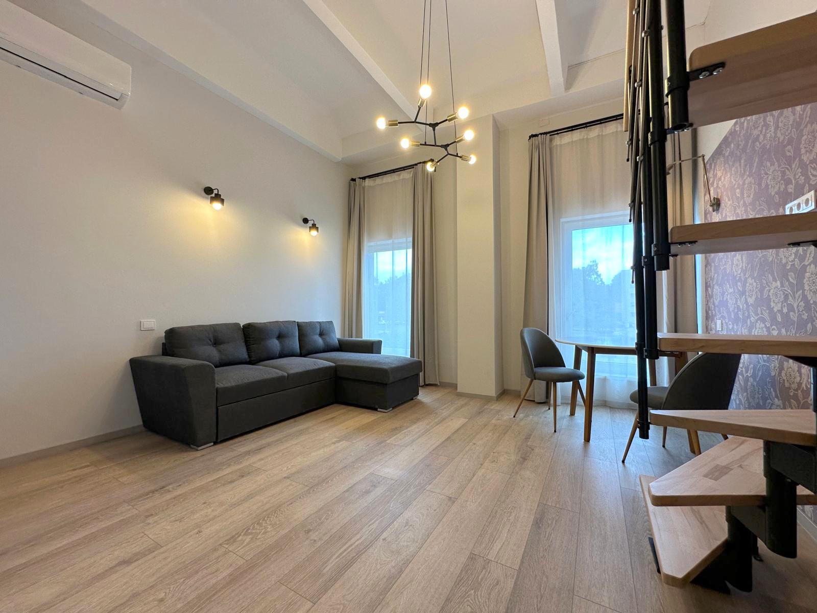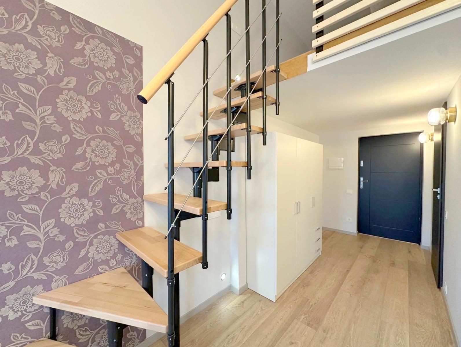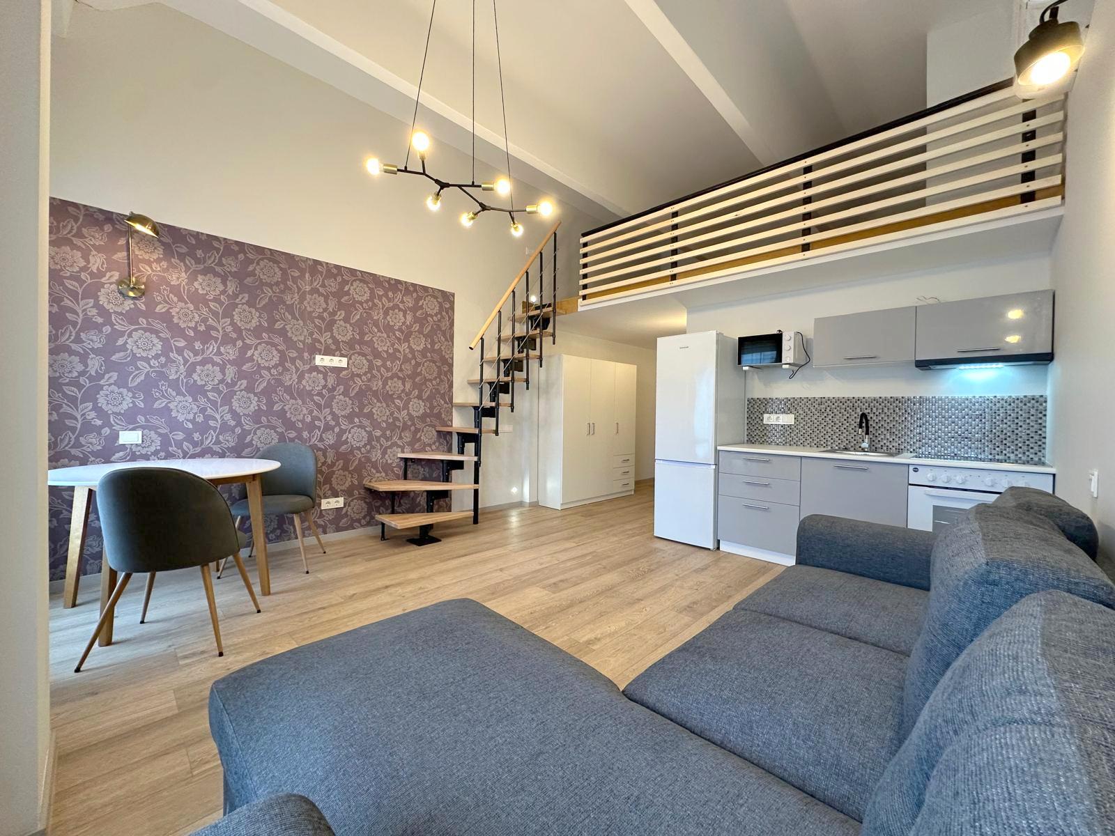 • Loftas per du aukštus – pirmame aukšte erdvi svetainė sujungta su virtuve, antrame – atskiras miegamasis;