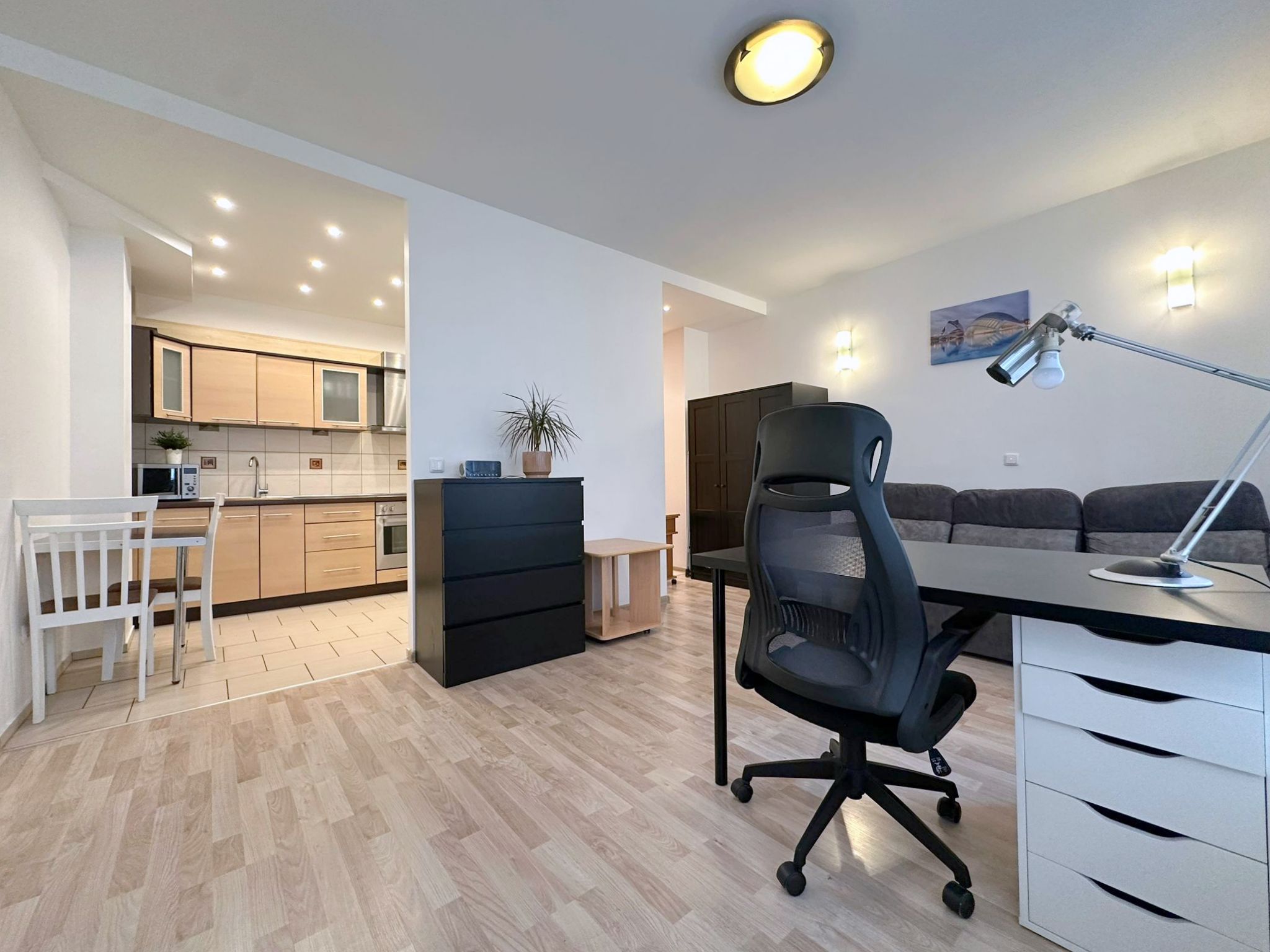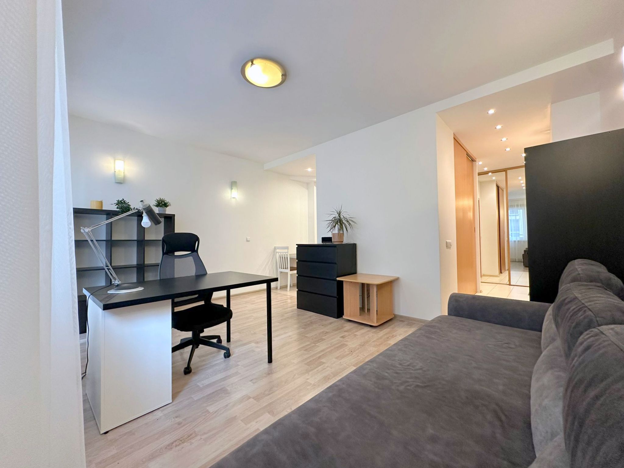 Bute visi reikalingi baldai, lyginimo lenta, džiovykla skalbiniams džiauti, skalbimo mašina,elektrinė viryklė ir kita buitinė technika. Iš vio 3 spintos, todėl tikrai turėsite kur susidėti daiktus.