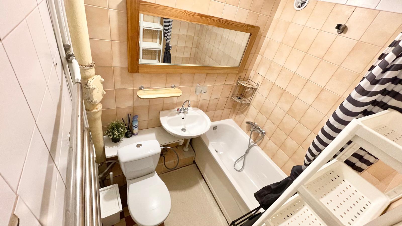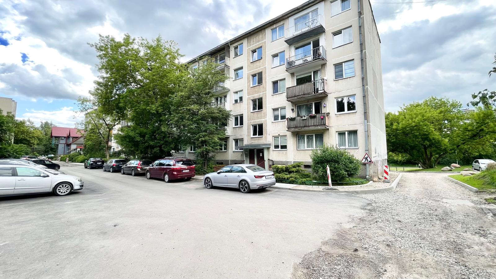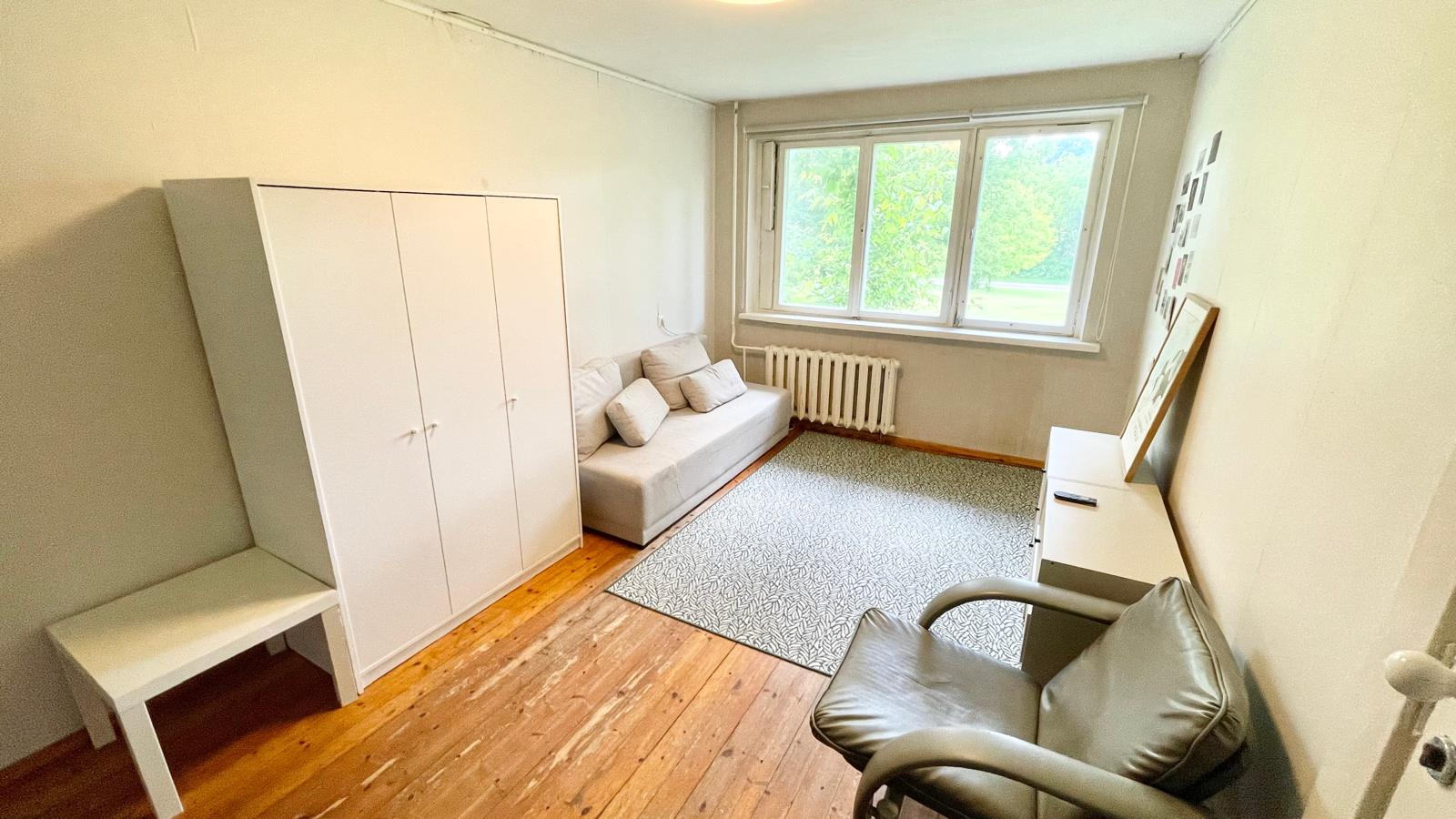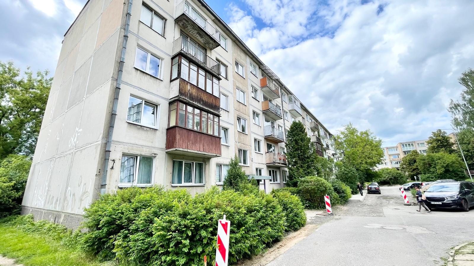 - Išplanavimas: trys kambariai (vienas pereinamas), atskira virtuvė, bendras vonios ir WC kambarys