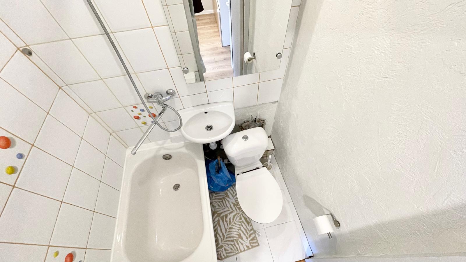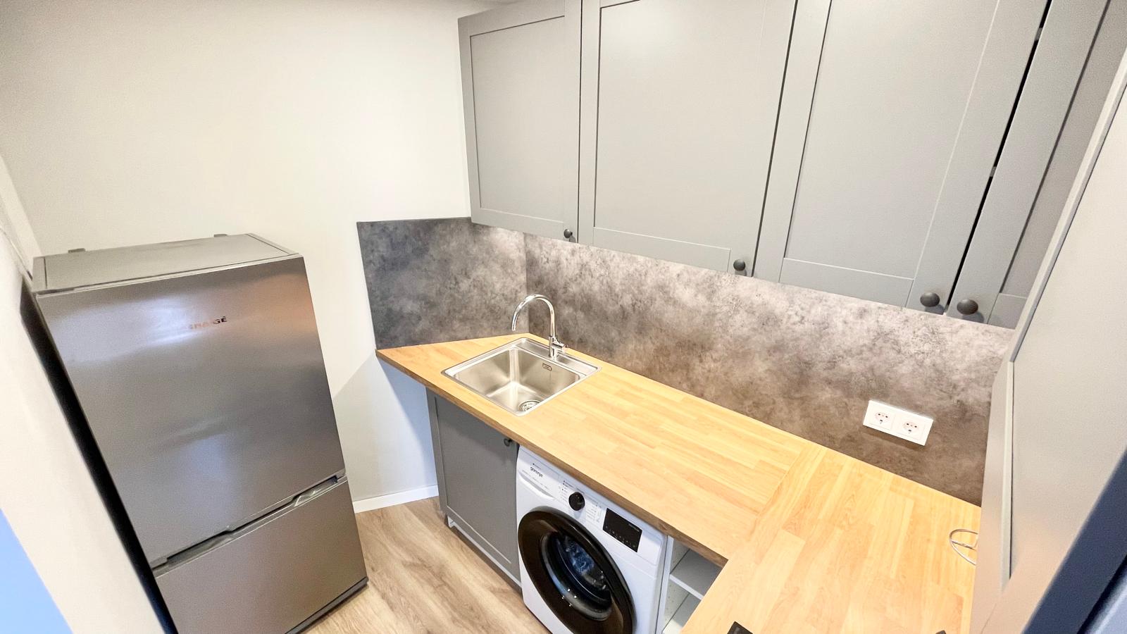 Bute yra visi reikalingiausi baldai: skalbimo mašina, kaitlentė, šaldytuvas su šaldikliu, t.t.