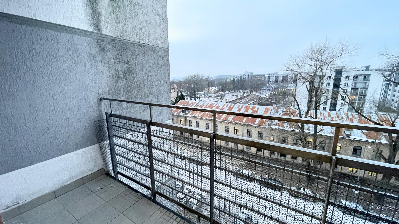 Išplanavimas: virtuvė sujungta su kambariu, miegamasis atskirai, tualetas ir dušas kartu.Bute yra du balkonai