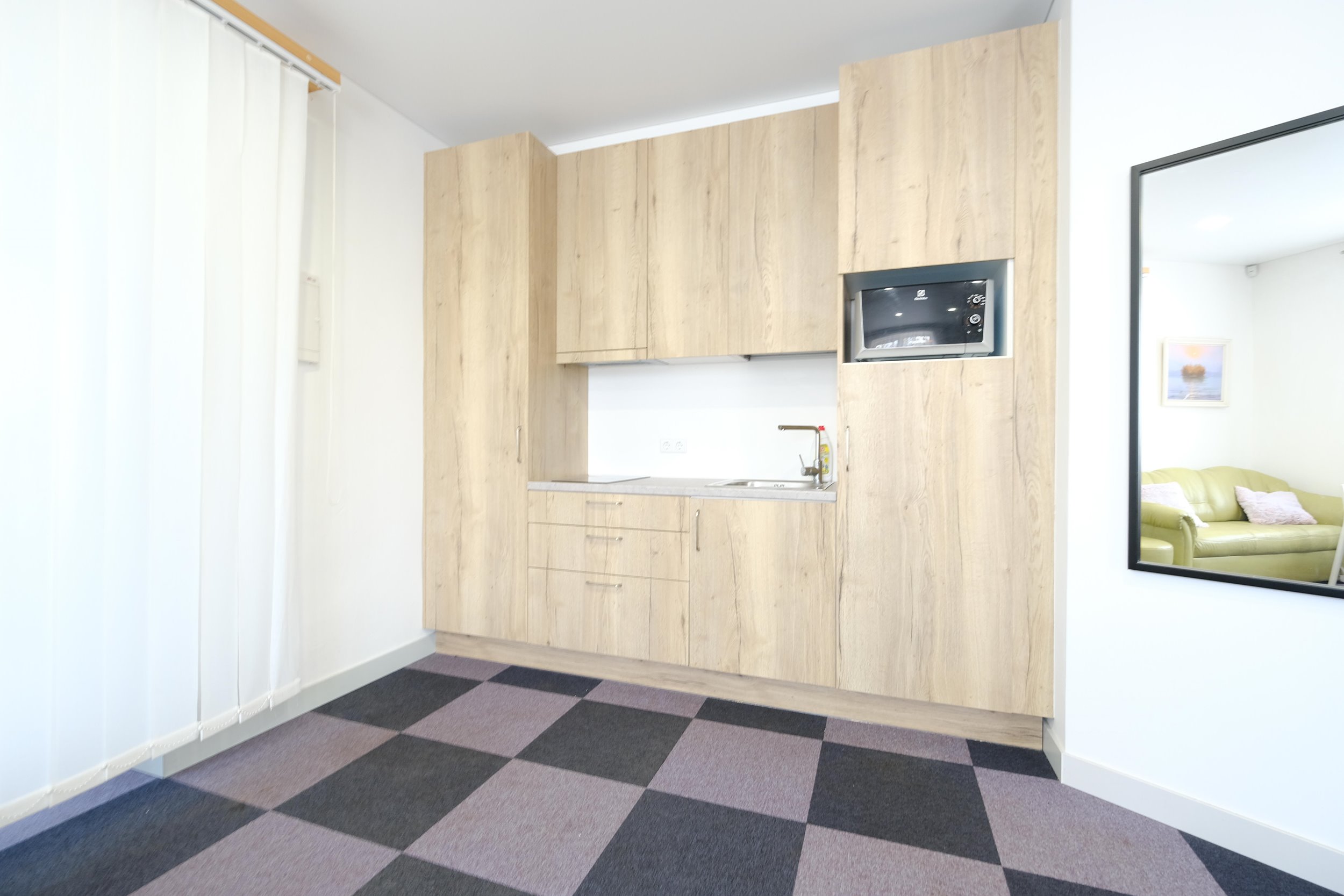 Bute yra visi reikalingi baldai (šaldytuvas, viryklė, skalbimo mašina, šaldiklis ).