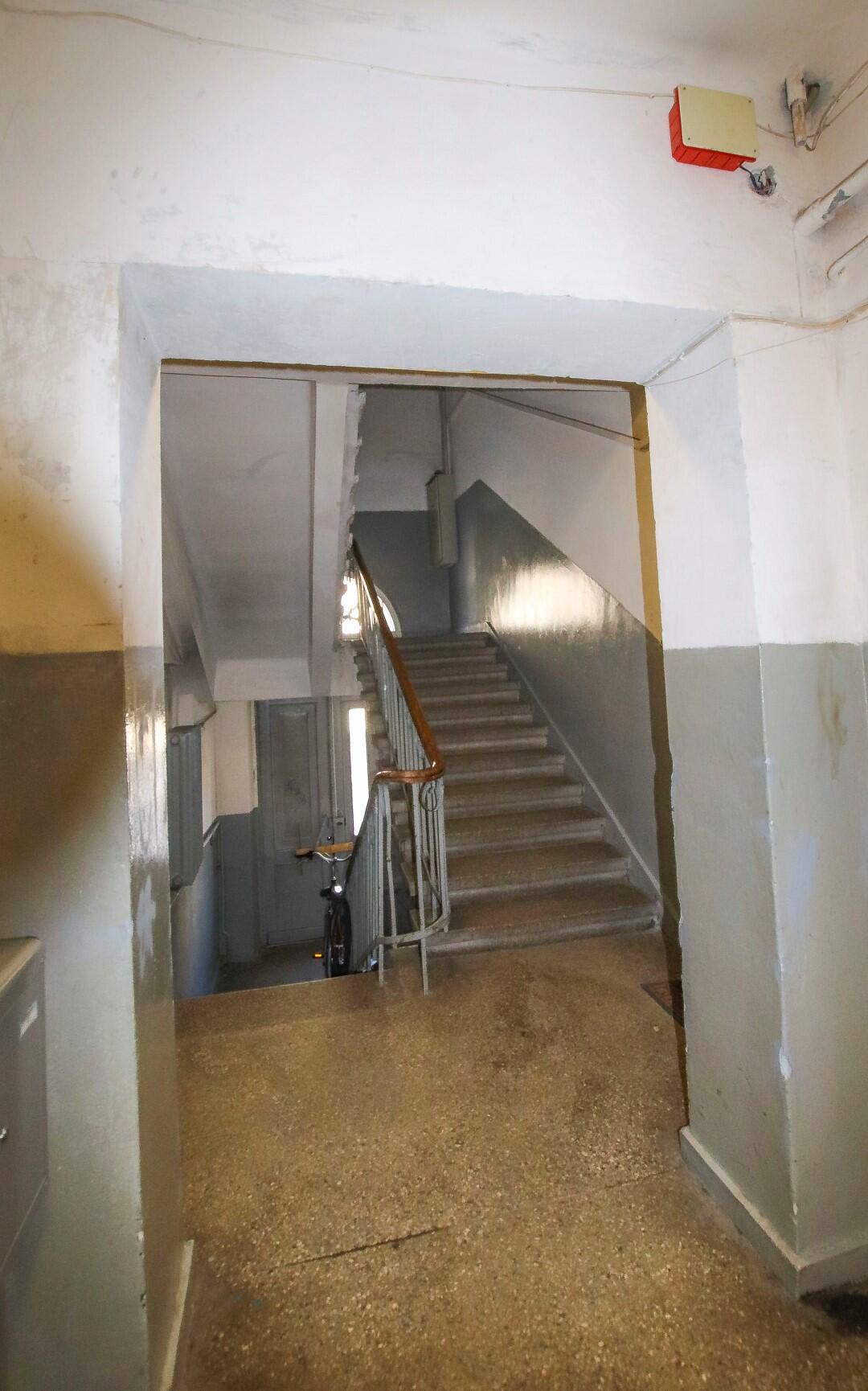 Tvarkinga laiptinė su kodine spyna, uždaras kiemas su šlagbaumu.