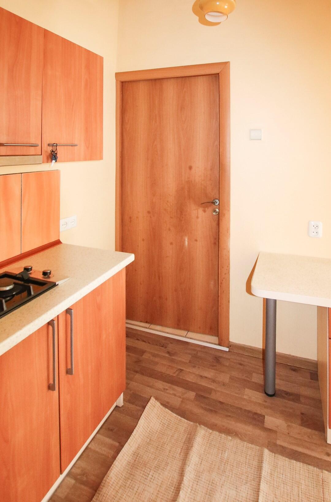 Butą sudaro kambarys su virtuvės zona ir sanmazgas. Sanmazge yra išvestas vanduo ir kanalizacija skalbimo mašinos pajungimui.