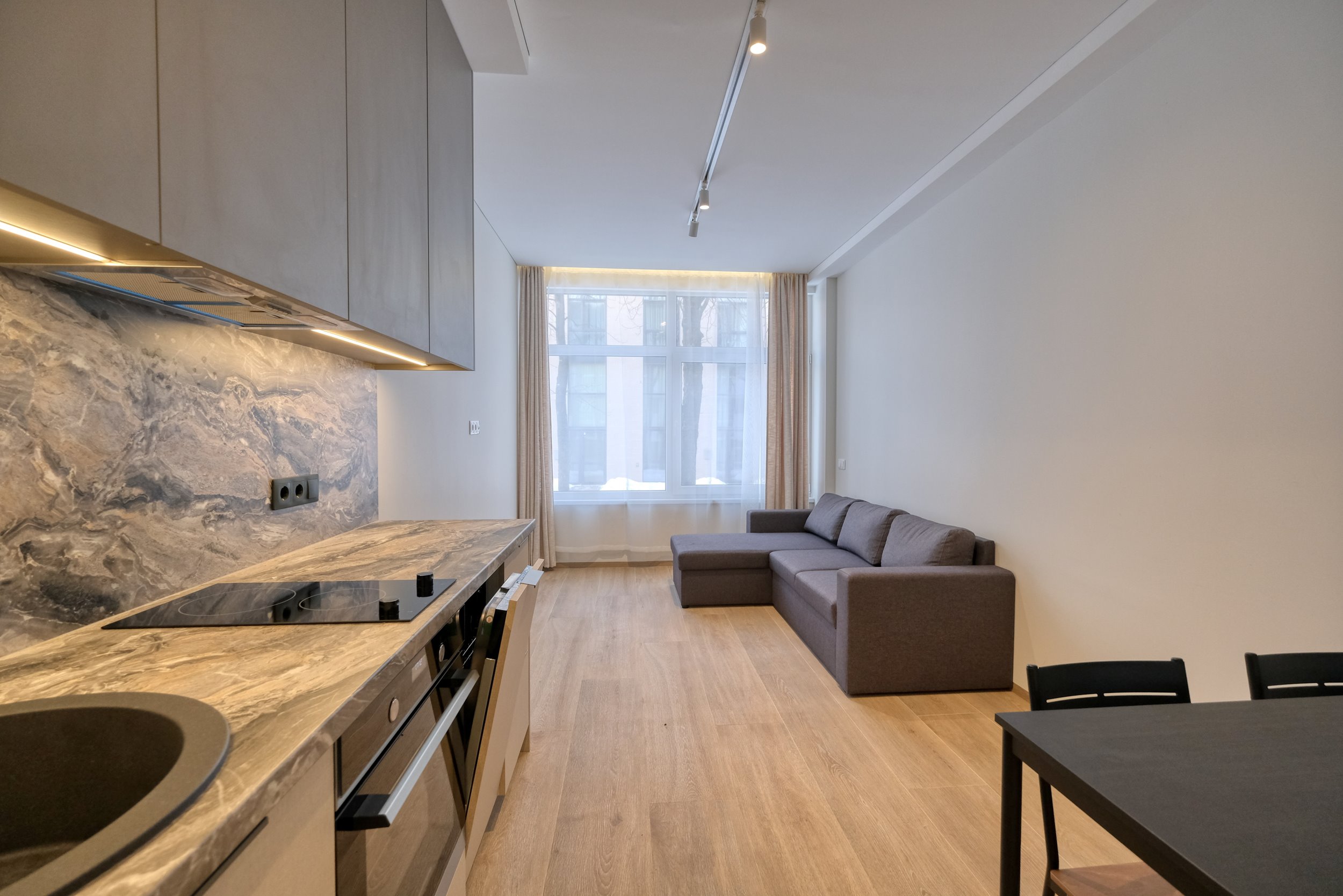 - Svetainė sujungta kartu su virtuvės zona;