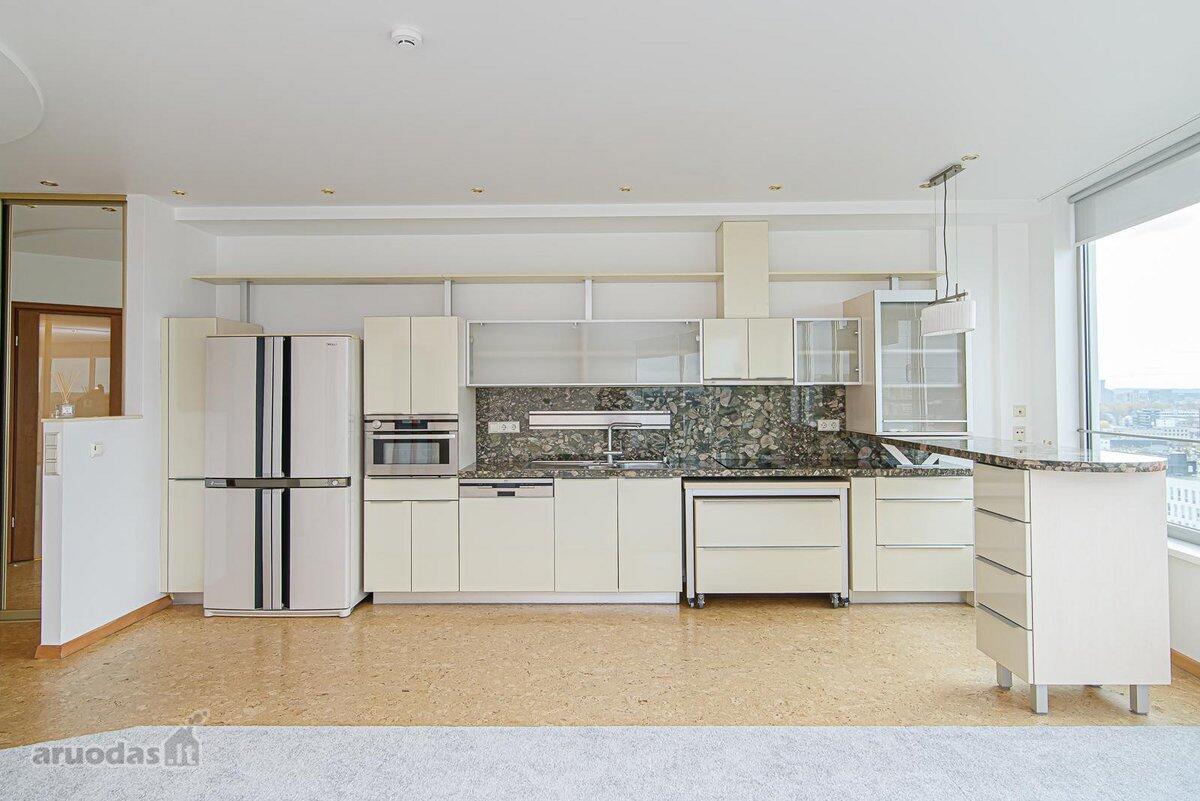 skalbimo mašina, džiovinimo mašina, indaplovė, kondicionierius, dideliu amerikietišku šaldytuvu, orkaite ir k.t. Yra valgomasis stalas transformeris. Visi virtuvės baldai gaminti pagal specialų užsakymą, butas įrengtas dizainerės tik iš kokybiškų medžiagų.