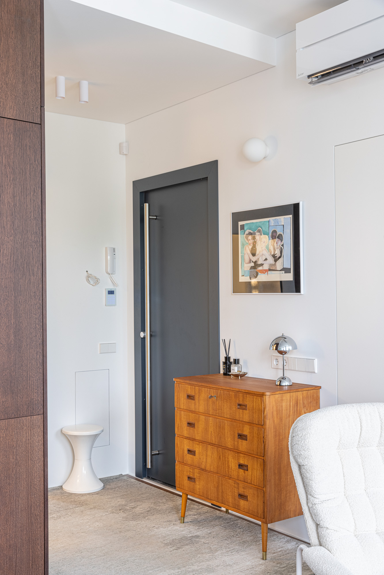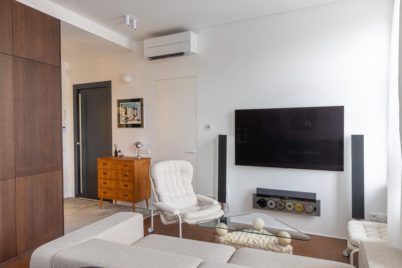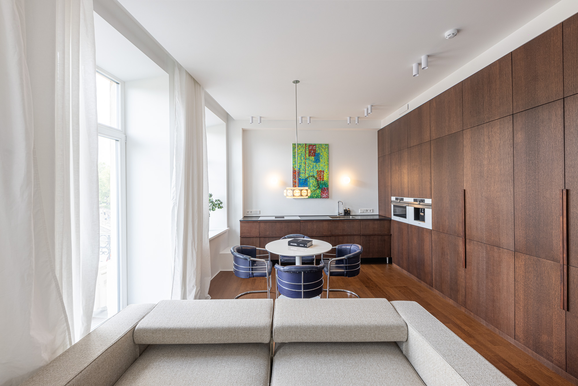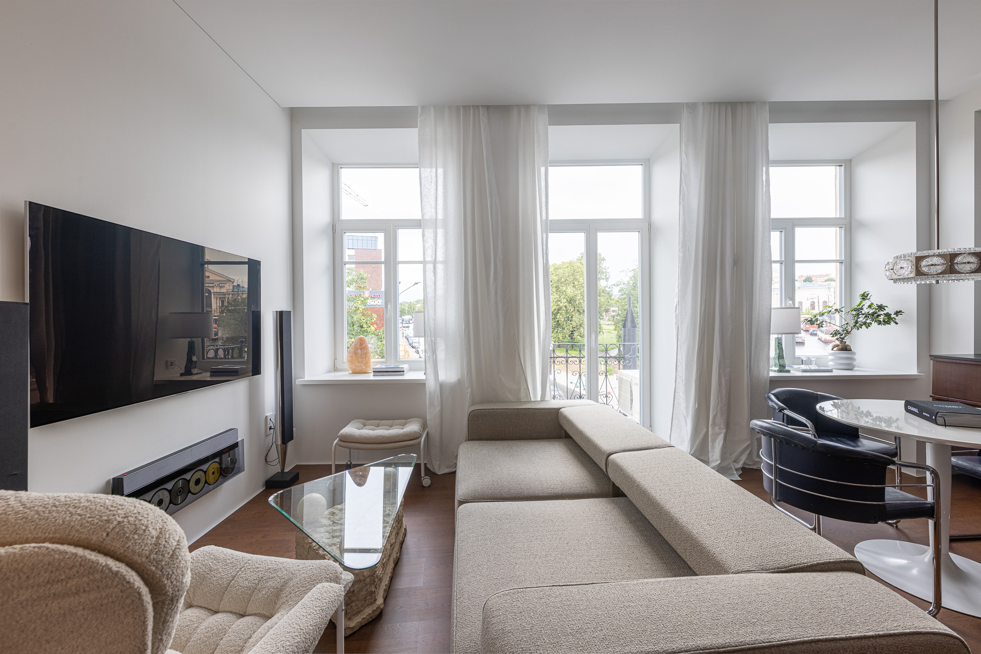 Bute sutvirtintos perdangos, naujai apšiltintos sienos, sudėti mediniai dviejų kamerų langai su aliuminio apkaustais išorėje. Gatvės triukšmo beveik negirdėti. Visame bute sumontuotas Uponor grindinis šildymas, papildomai šildymui ir vėsinimui sudėti Mitsubishi kondicionieriai, oro kokybei - rekuperacinė sistema. Pakeista nauja kanalizacija, bei elektros instaliacija. Grindys iš natūralaus ąžuolo parketlenčių, vonioje - full body terazzo plytelės. Baldai bute iš natūralaus medžio bei lukšto. Sudėta kokybiška ir patikima santechnika Laufen + Kartell, Tres, Viega, Reginox, Hansgrohe. Virtuvėje orkaitė bei įmontuojamas kavos aparatas Siemens, kaitlentė su garų surinkėju Elica, indaplovė, skalbimo mašina su džiovinimo funkcija 2in1, Electrolux, šaldytuvas - Bosch. Baldai bei interjero detalės tokių žinomų vardu kaip B&B Italia, Scapa, Kartell, Carl Fagerlund by Orrefors. Papildomai paliekami du LG OLED televizoriai bei Bang&Olufsen garso sistemos. Staliukai iš onikso ir travertino.