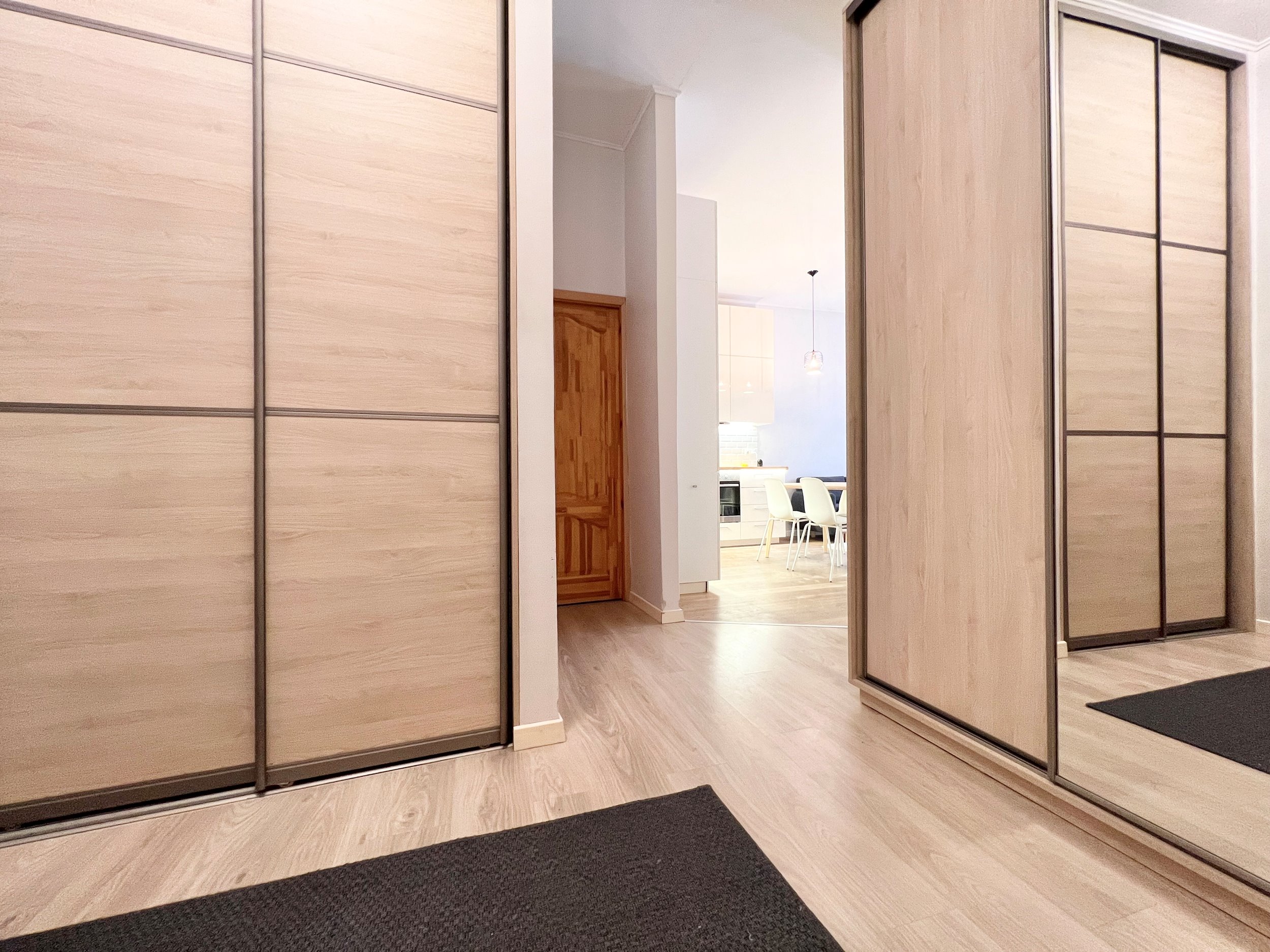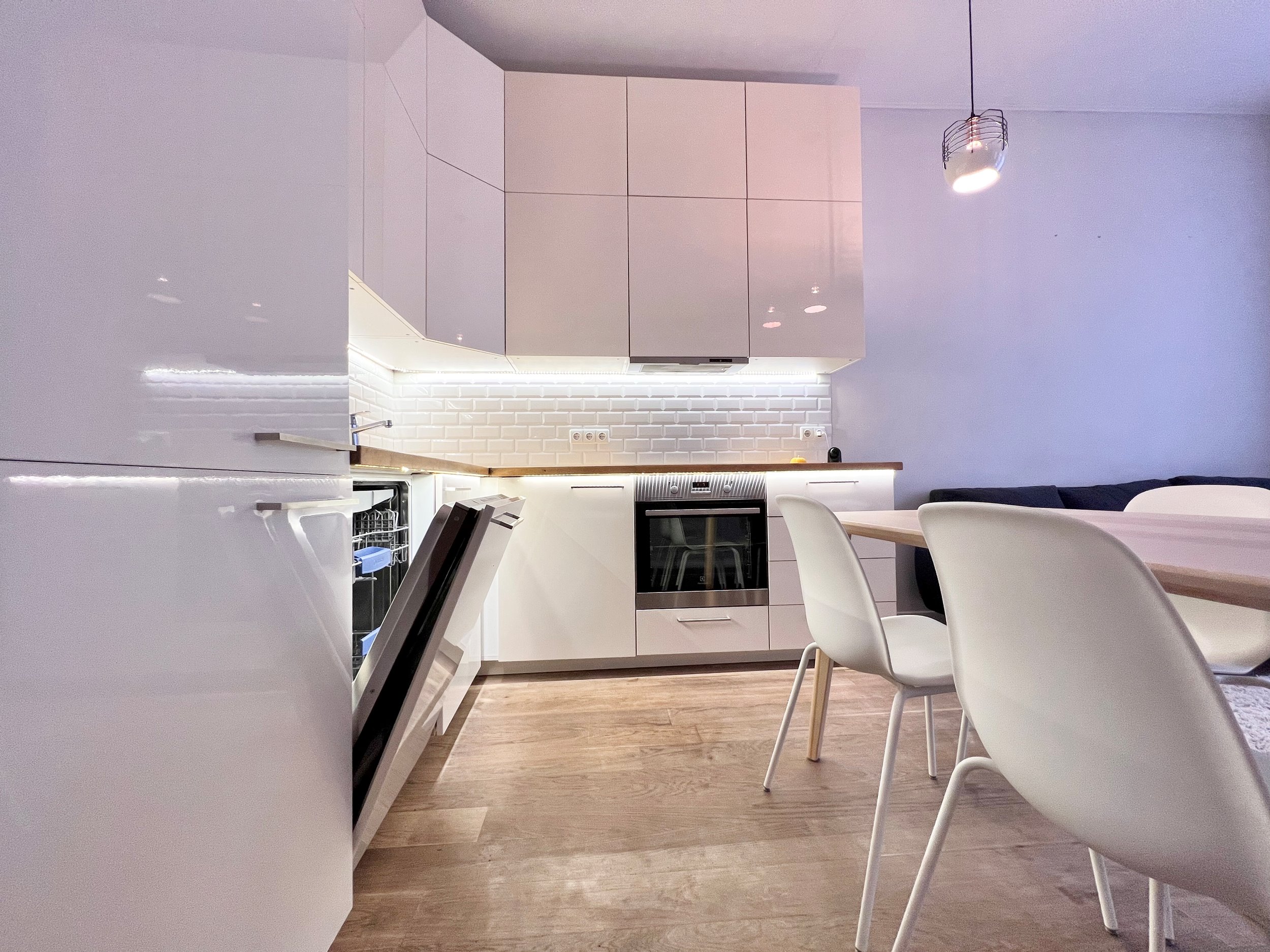 - Virtuvės baldai su visa reikalinga buitine technika (šaldytuvu, virykle, orkaite, indaplove, skalbimo mašina).