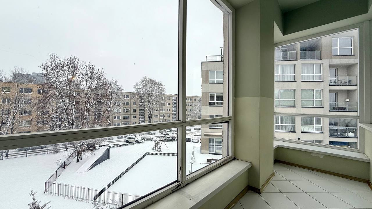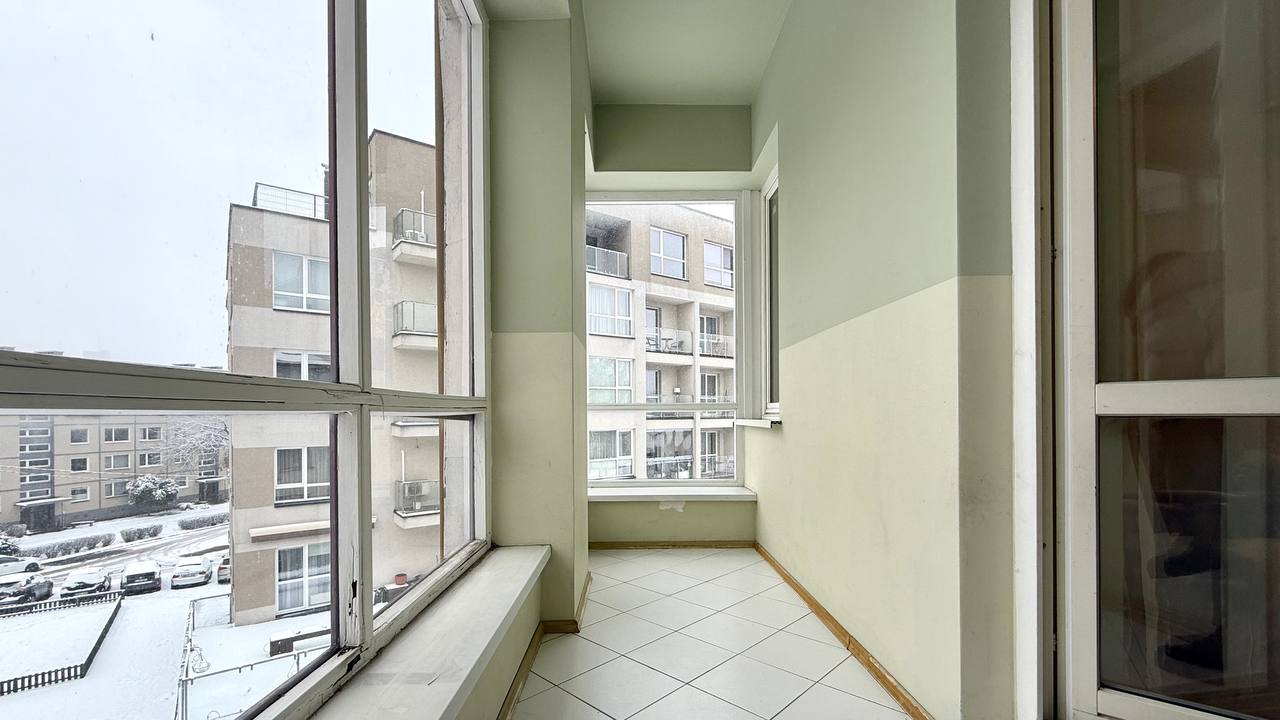 -Erdvi svetainė su stiklintu balkonu, kuriame galima mėgautis rytine kava