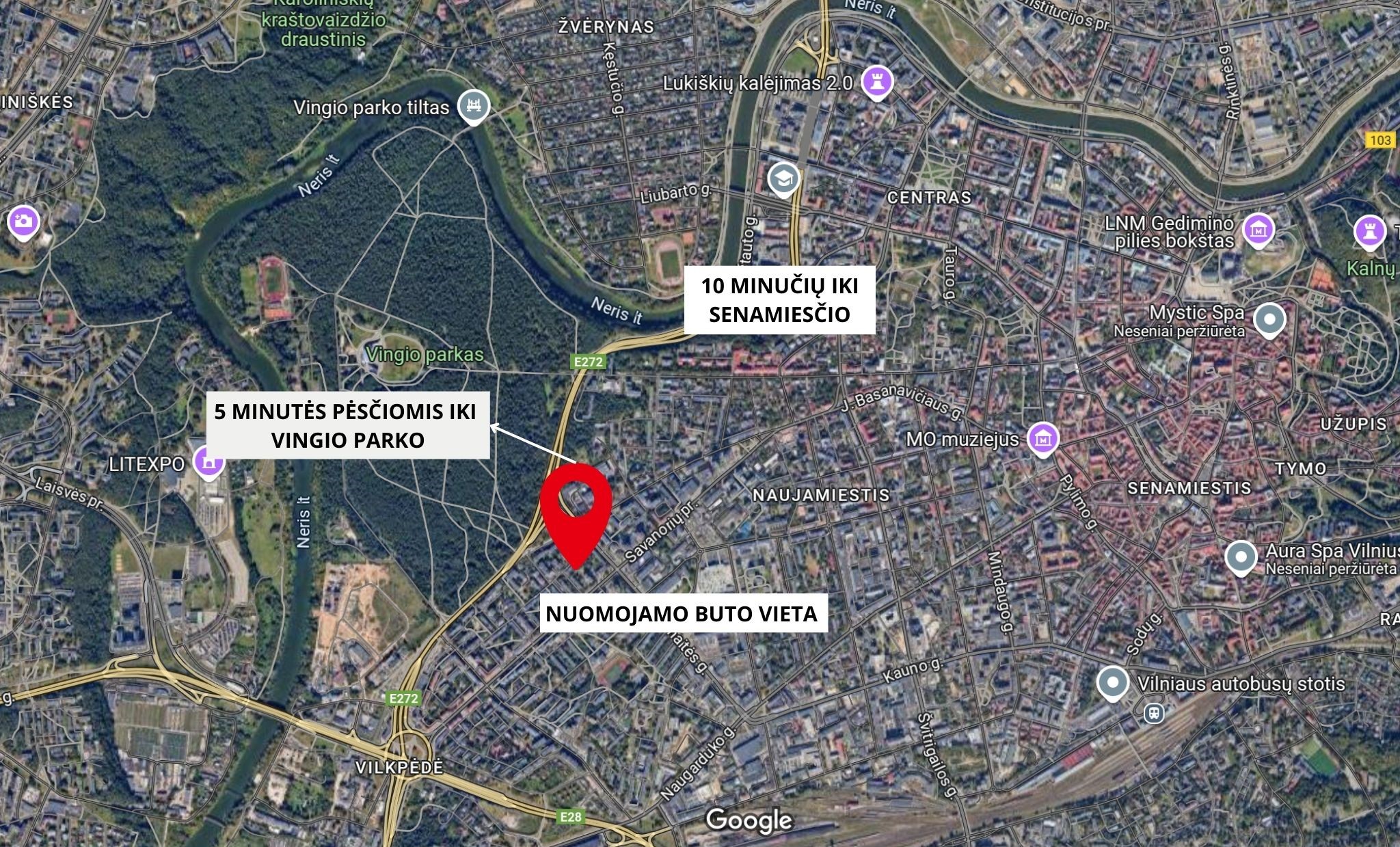 -Patogus susiekimas su visomis miesto dalimis tiek mašina, tiek viešuoju transportu, tiek pėsčiomis