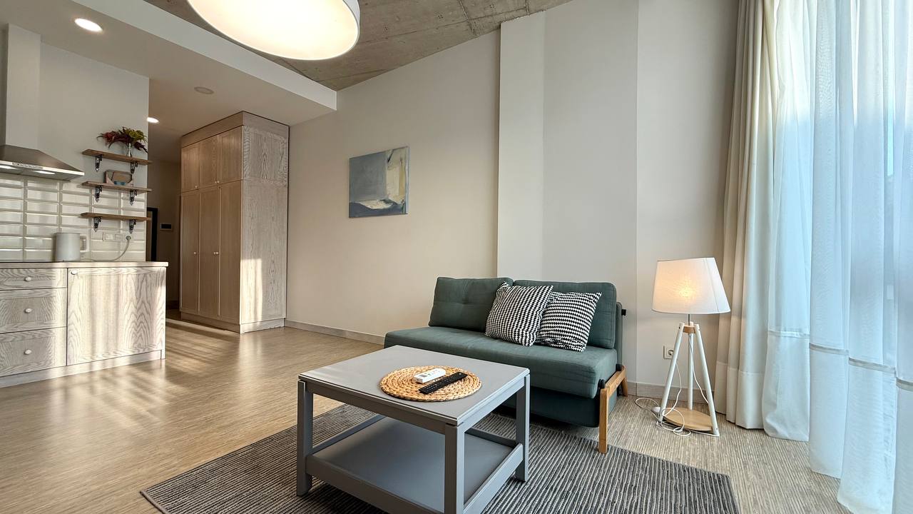 Svetainėje – valgomoji zona, patogi sofa ir atskirta miegamoji vieta