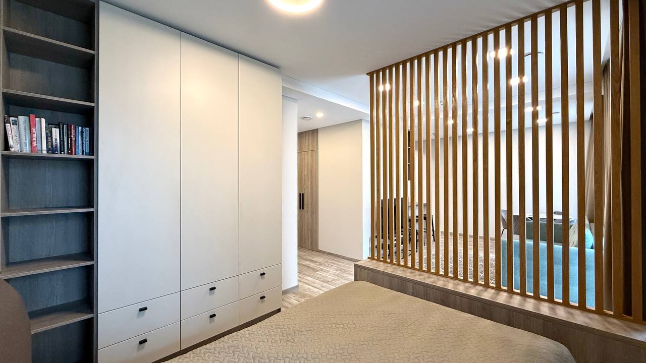 -Miegamasis atskirtas nuo svetainės minimalistinė pertvara