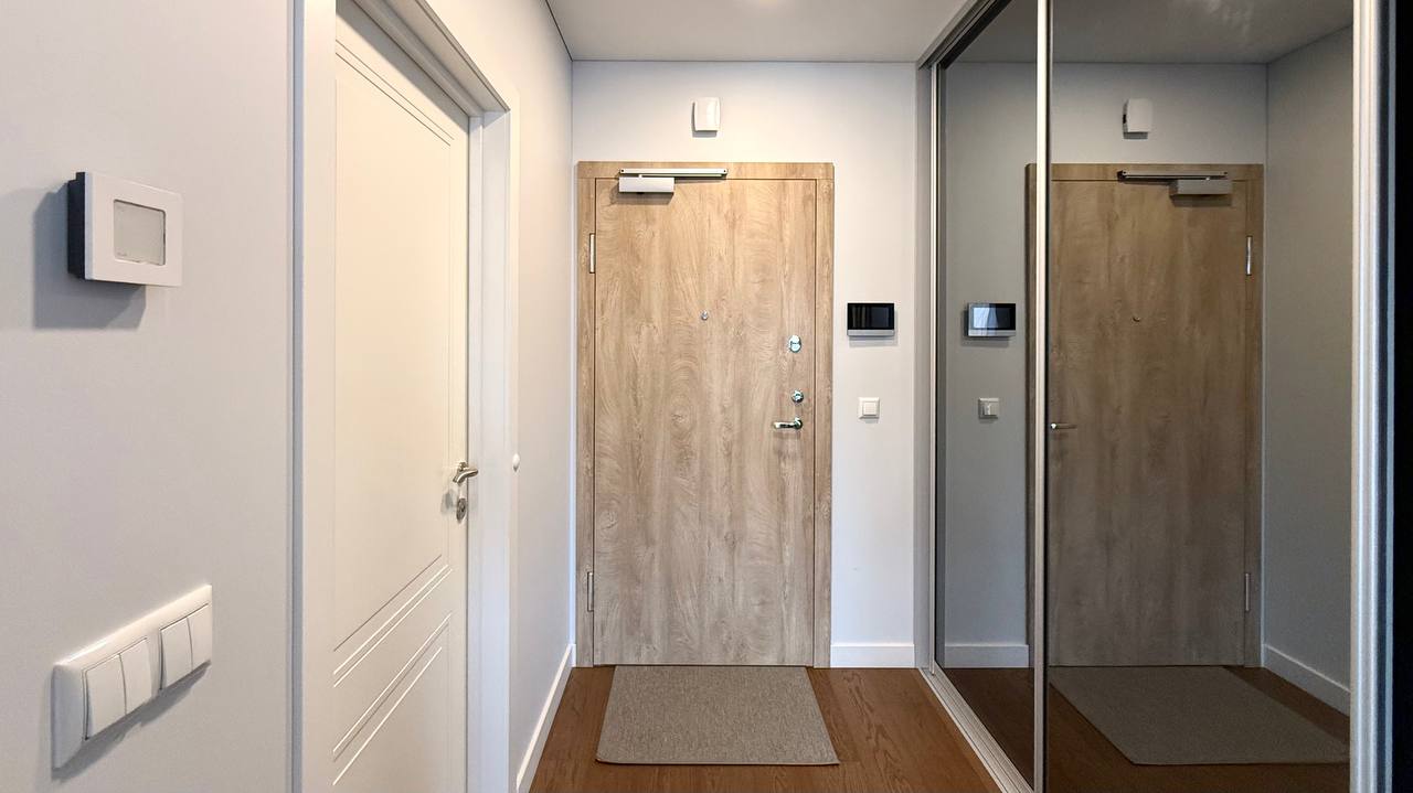 -Prieškambaryje įrengta erdvi sieninė spinta ir taip pat talpios spintos miegamajame