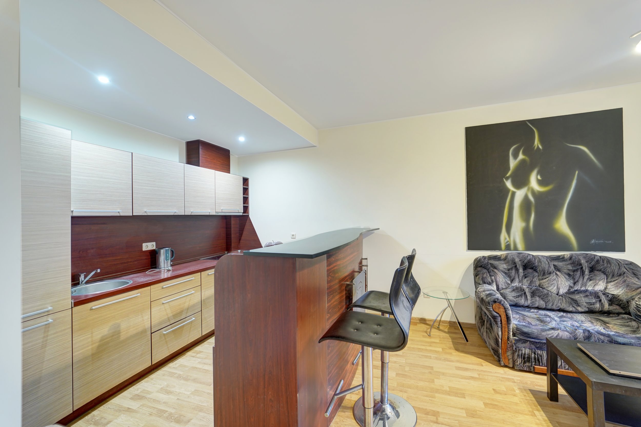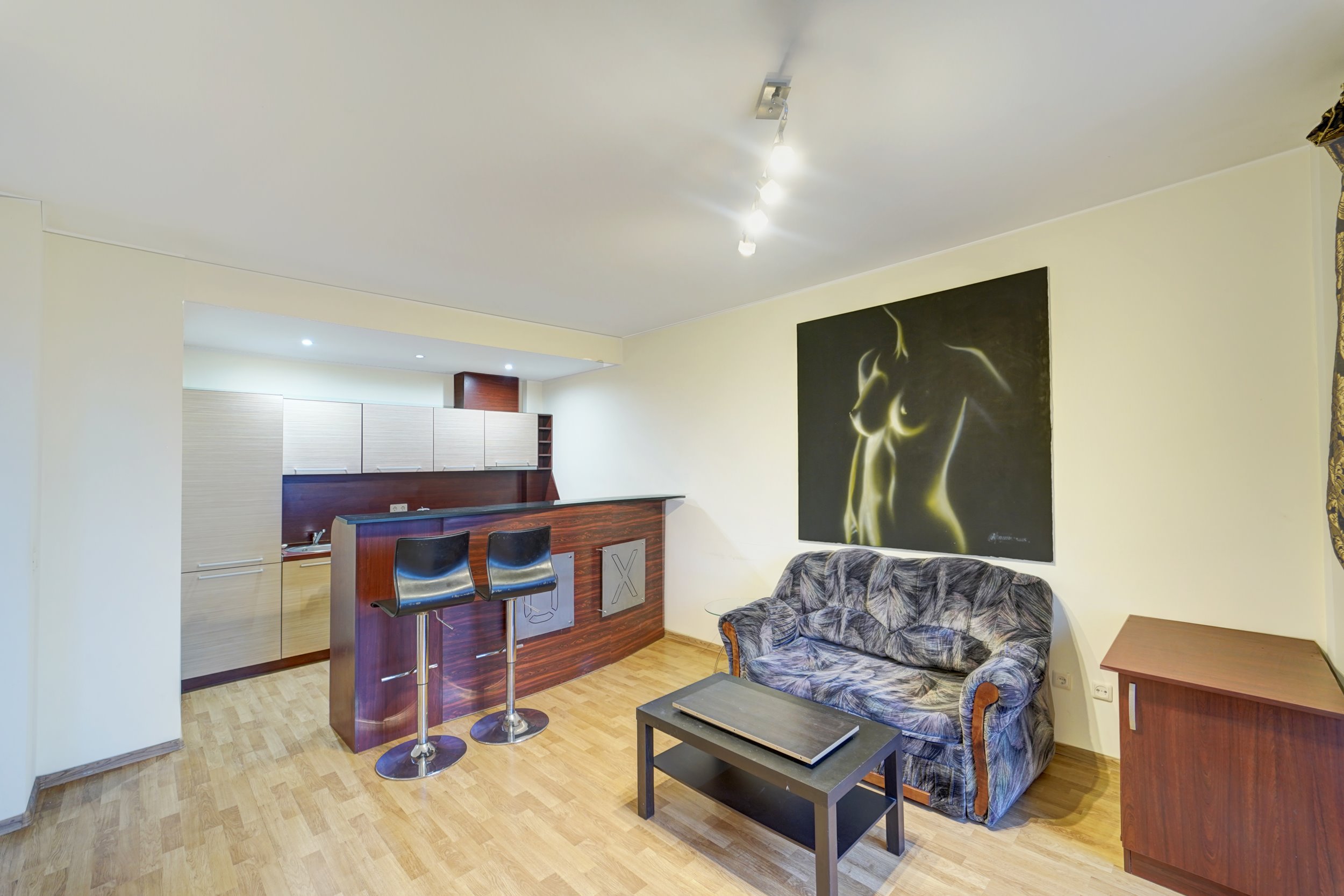 -- Erdvi svetainė su virtuve ir valgomuojam skirta zona;