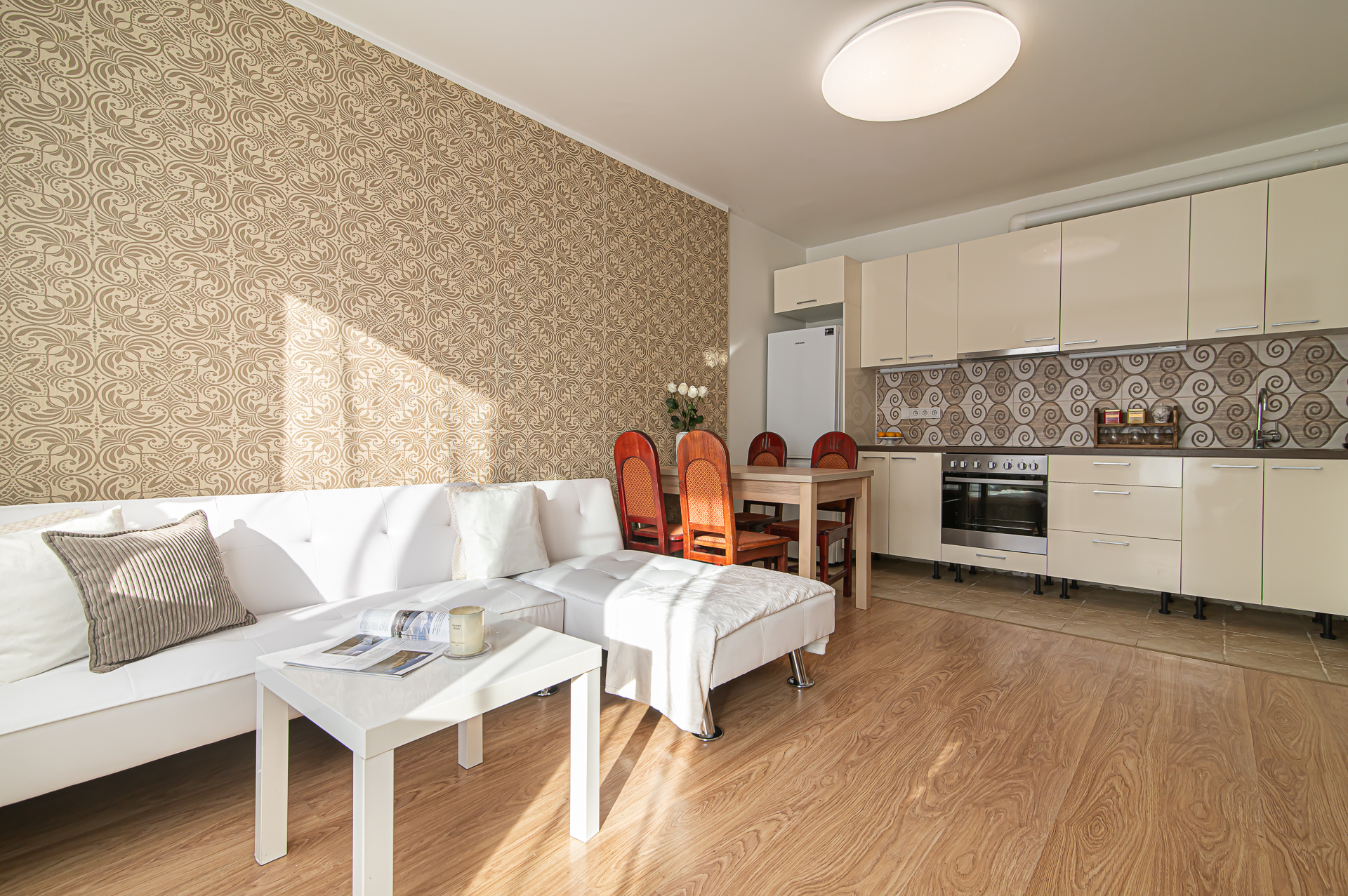 Saulėta ir stilinga svetainė su integruota virtuve – 17,92 kv. m;