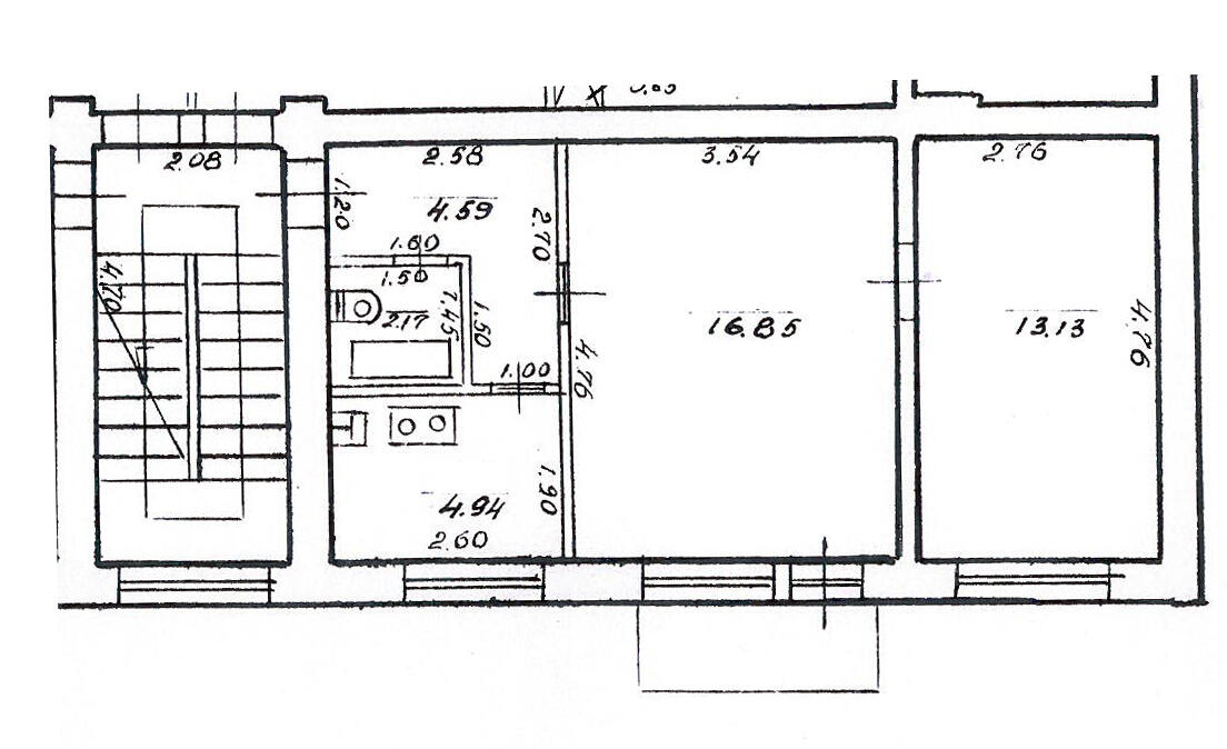 Išdėstymas: virtuvė, vonia, pereinamas kambarys, kitas kambarys ir balkonas. Taip pat butui priklauso rūsys.