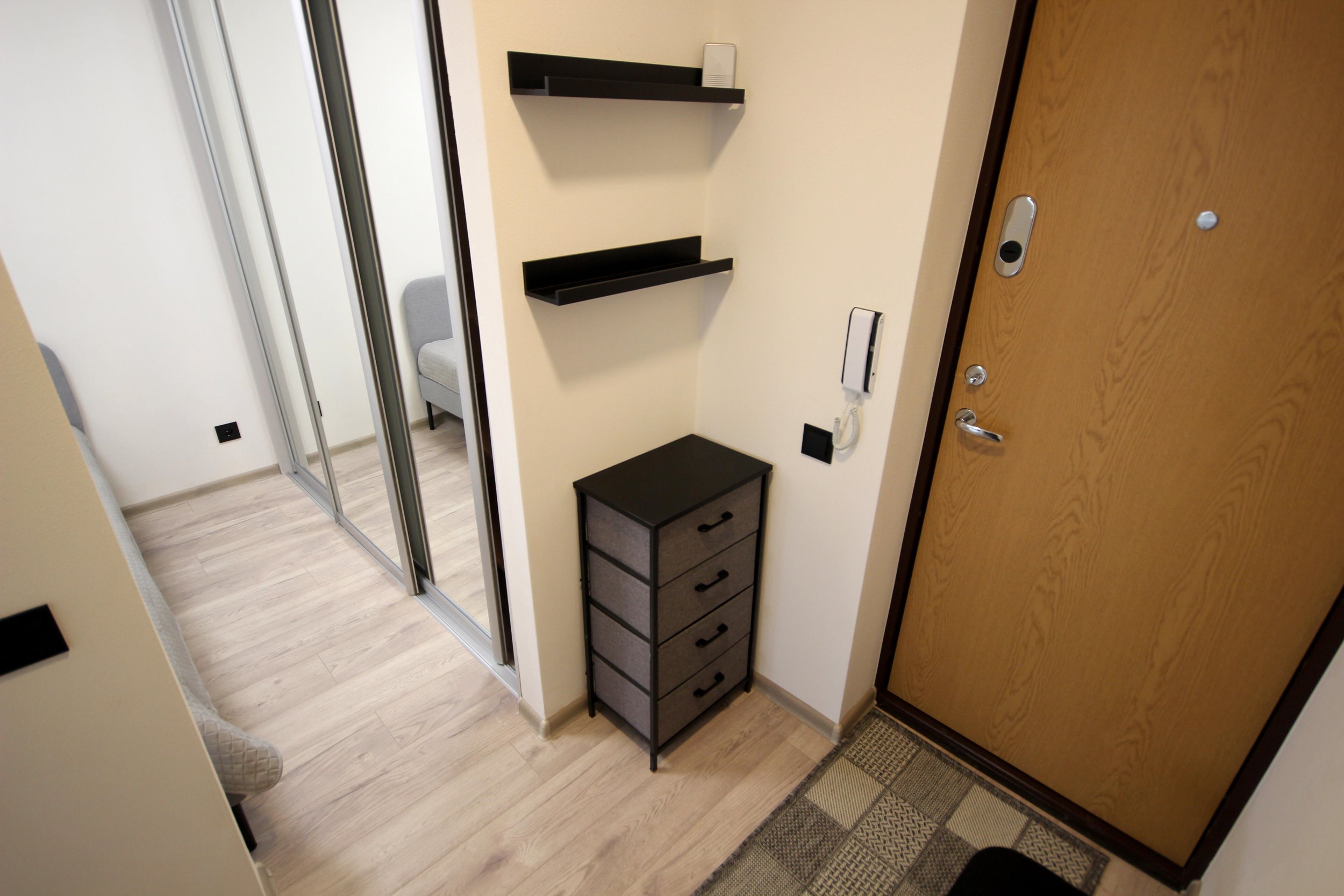 Tvarkinga erdvi laiptinė, liftas, kodinės laiptinės durys, domofonas.