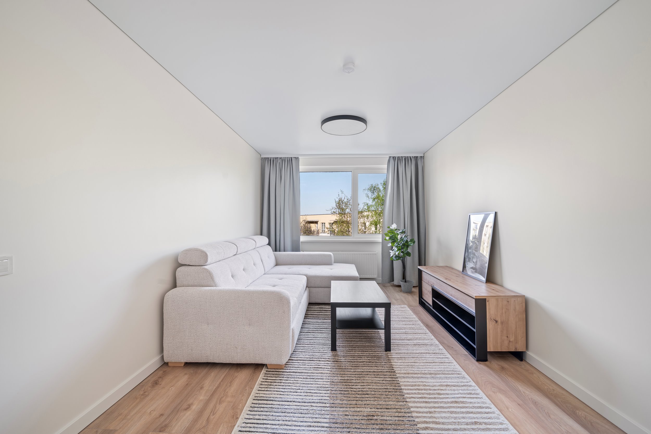 - SVETAINĖ APSTATYTA BALDAIS (Naujas kampas su miegamojo funkcija ir patalinės dėže, tv staliukas, žurnalinis staliukas, kilimas, užuolaidos)