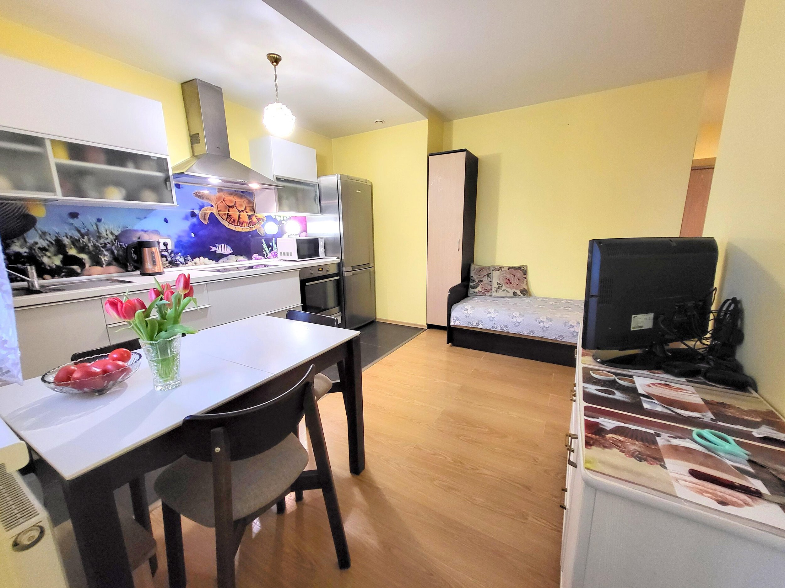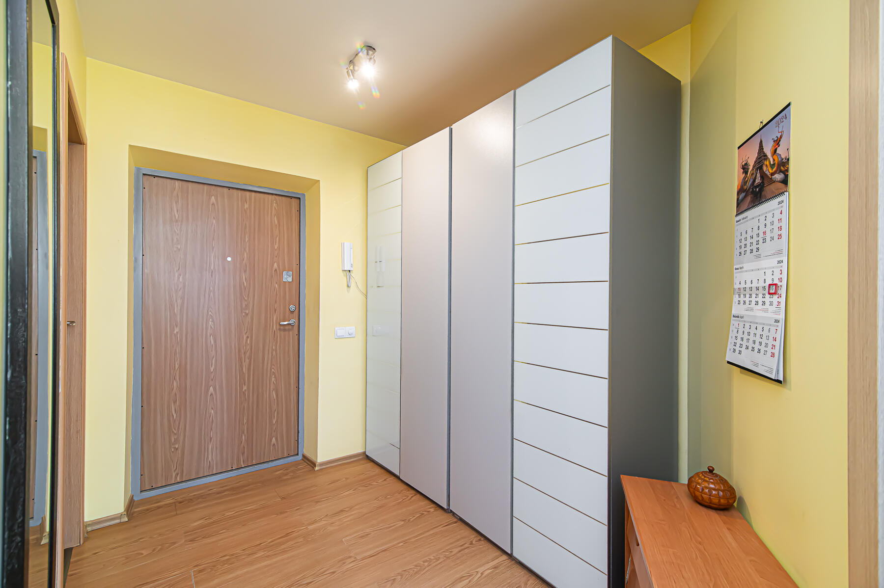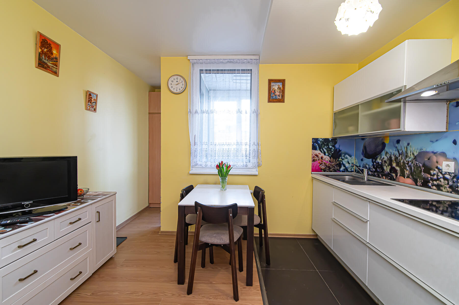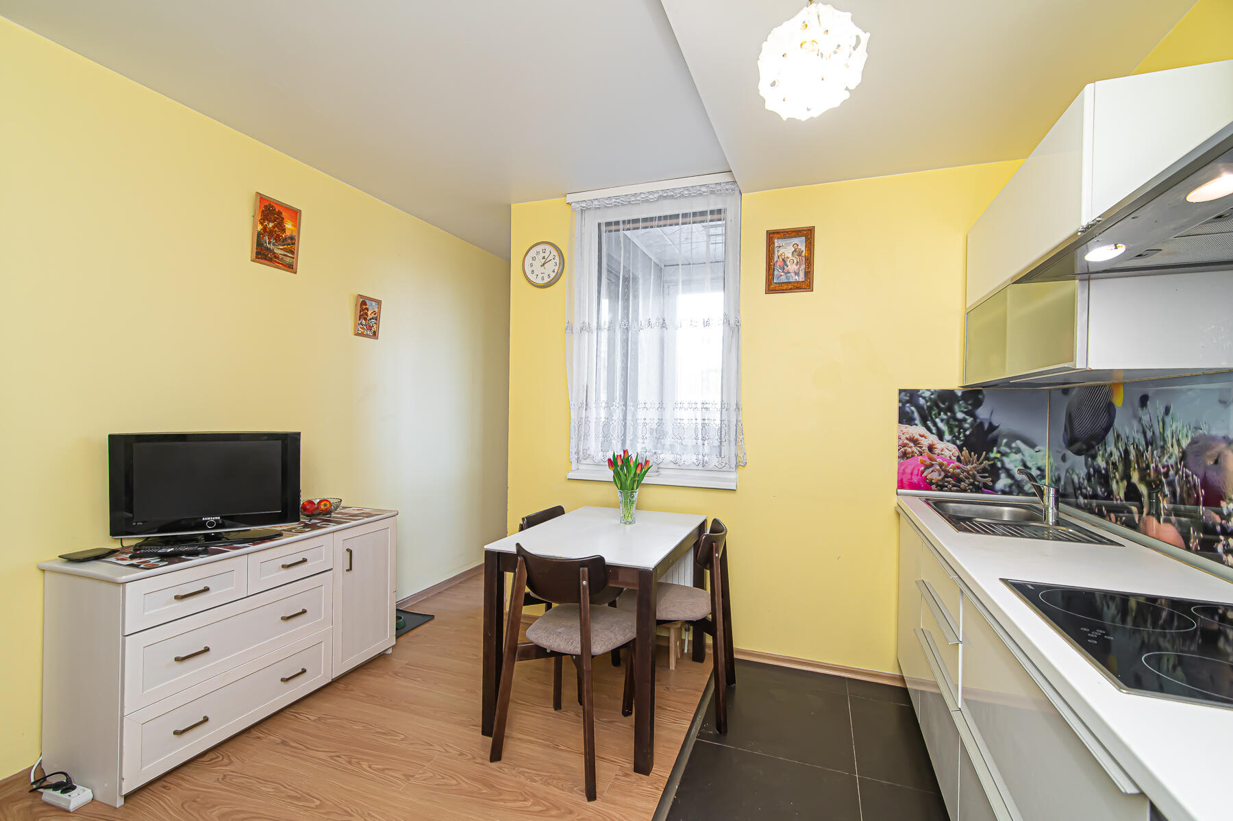 Butas parduodamas SU VIRTUVĖS KOMPLEKTU SU INTEGRUOTA BUITINE TECHNIKA, ŠALDYTUVU, SKALBIMO MAŠINA, VISAIS NUOTRAUKOSE MATOMAIS BALDAIS.