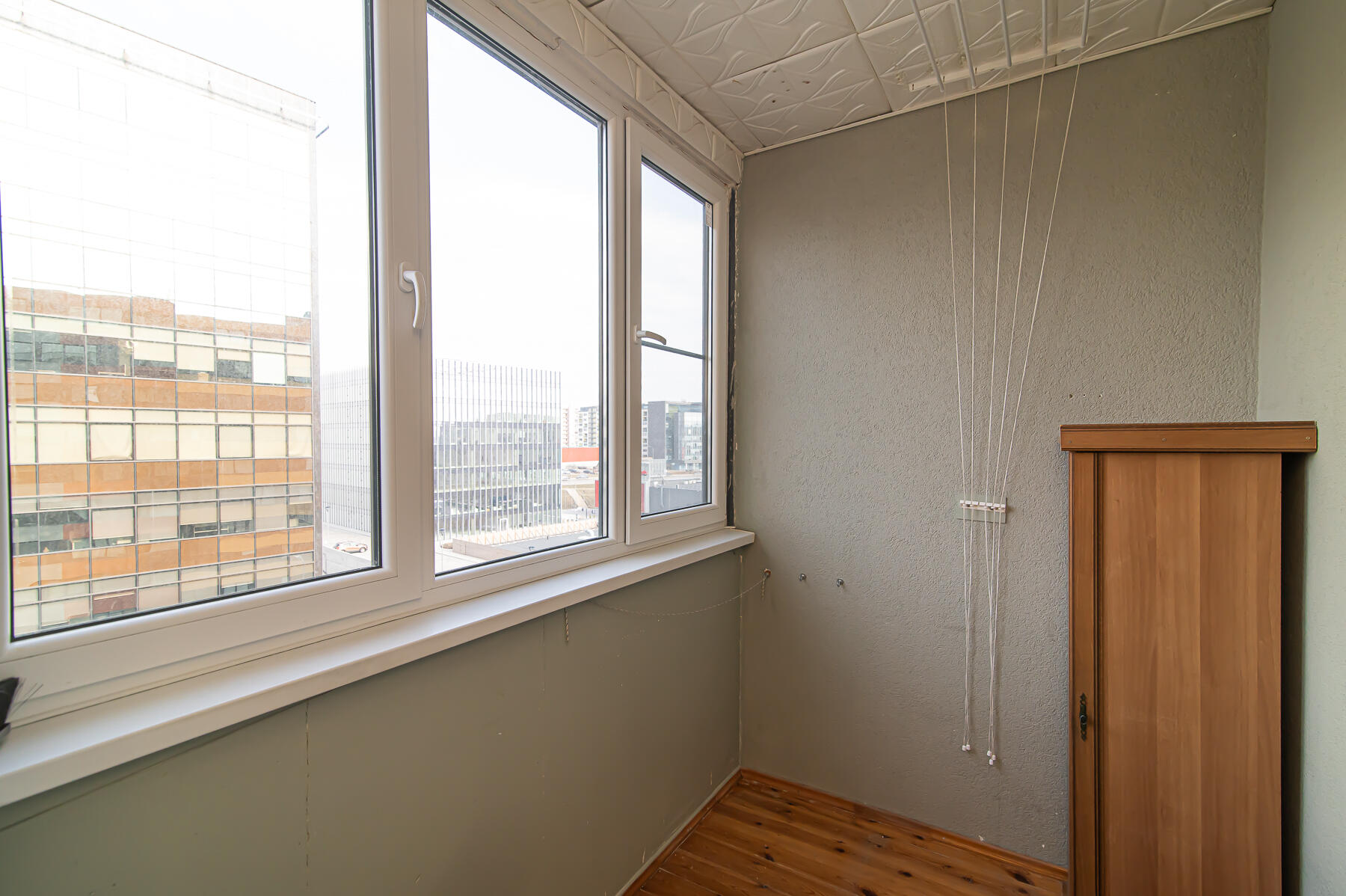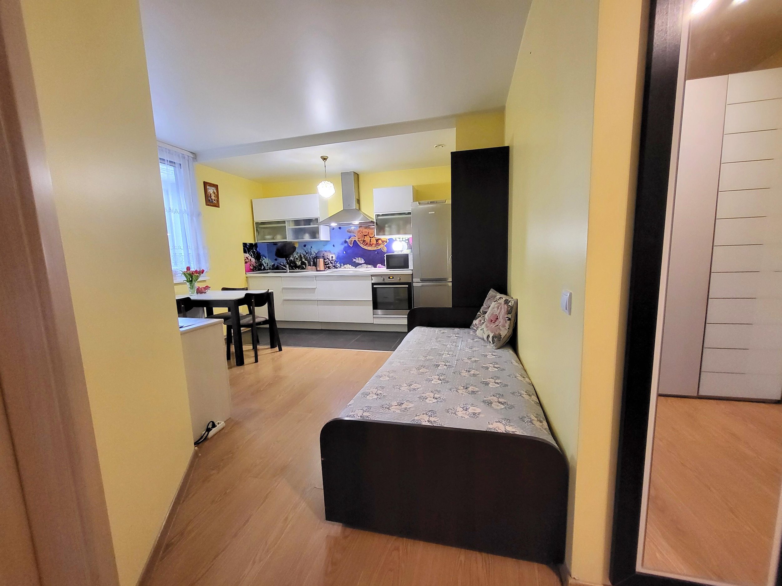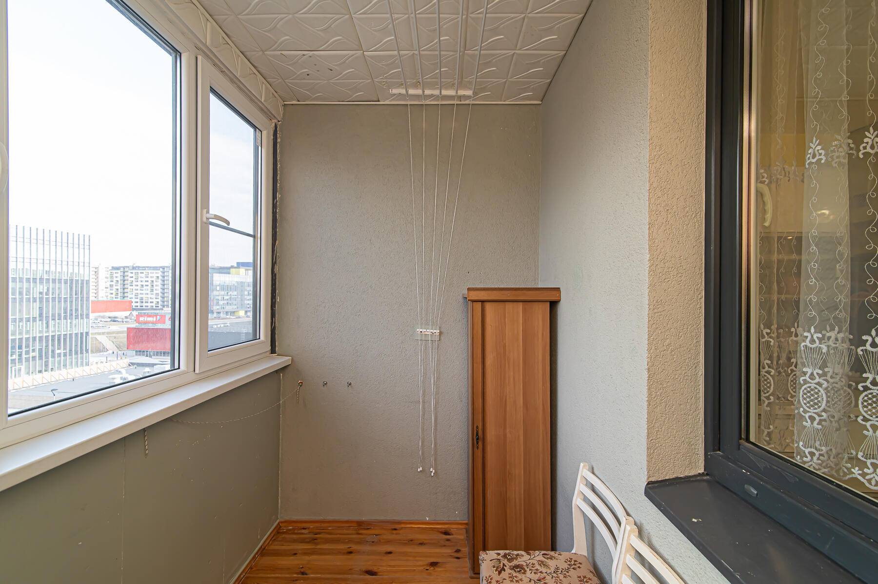 - Išplanavimas: Kambarys su virtuve, atskiras didelis kambarys, erdvus vonios kambarys su wc, koridorius, įstiklintas balkonas.