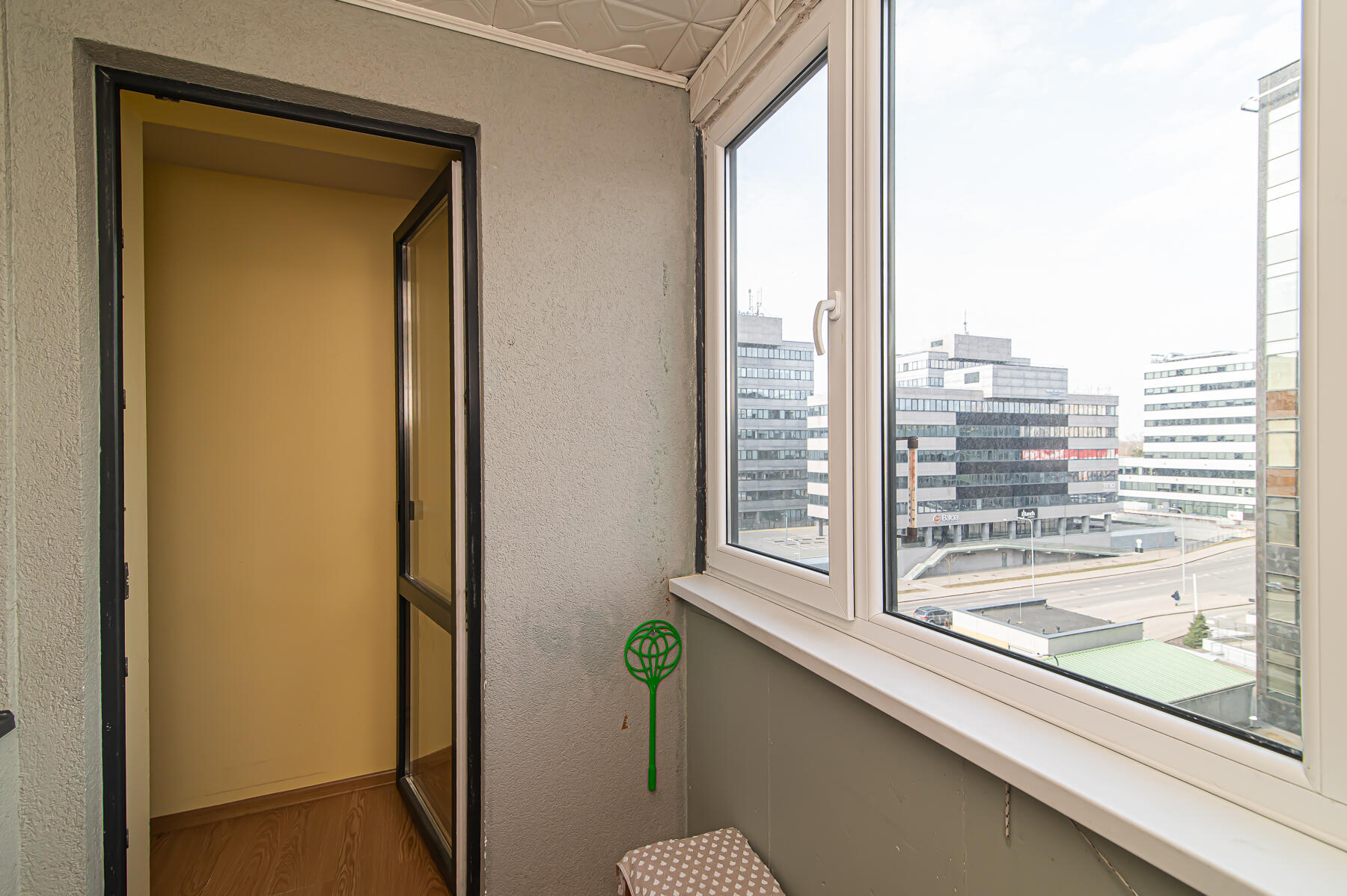 - Langai: plastikinis su stiklo paketais. Į rytų pusę.