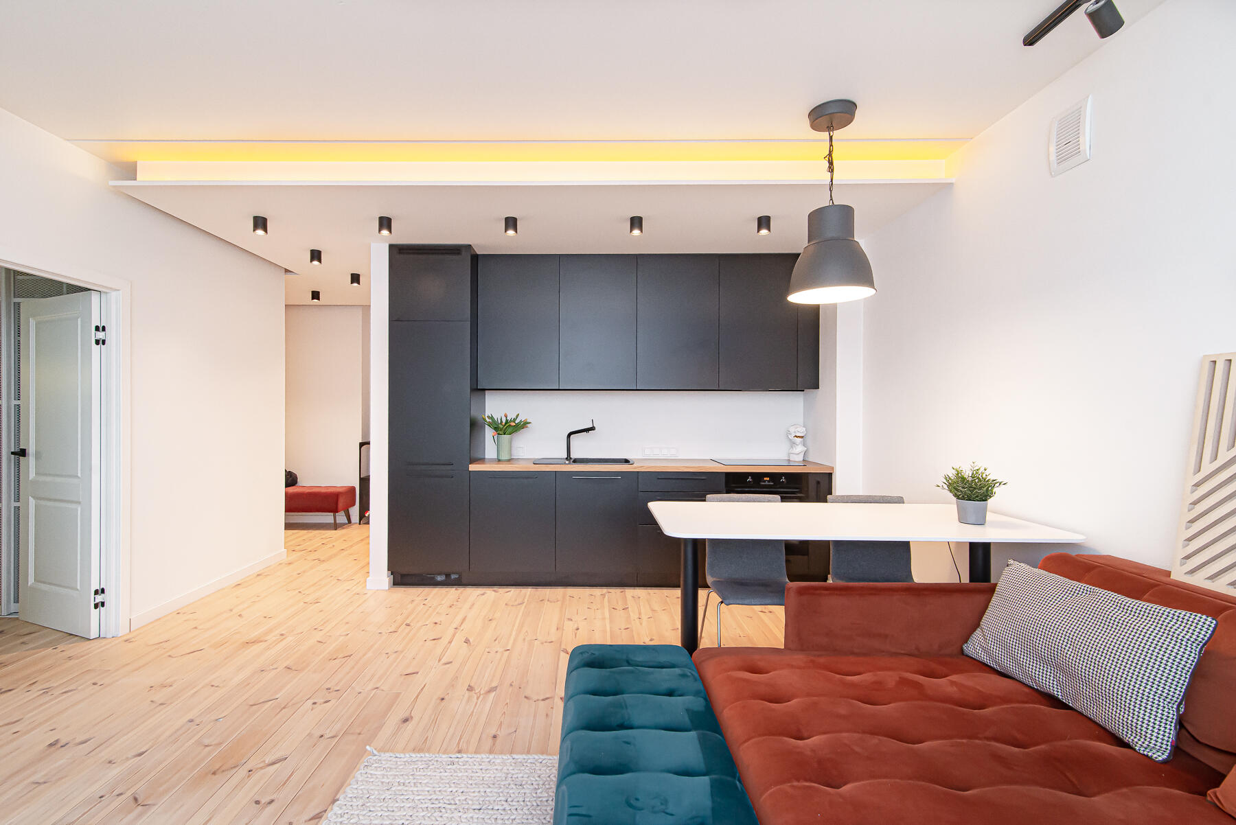 -- Svetainė bendroje erdvėje su virtuve ir valgomuoju;