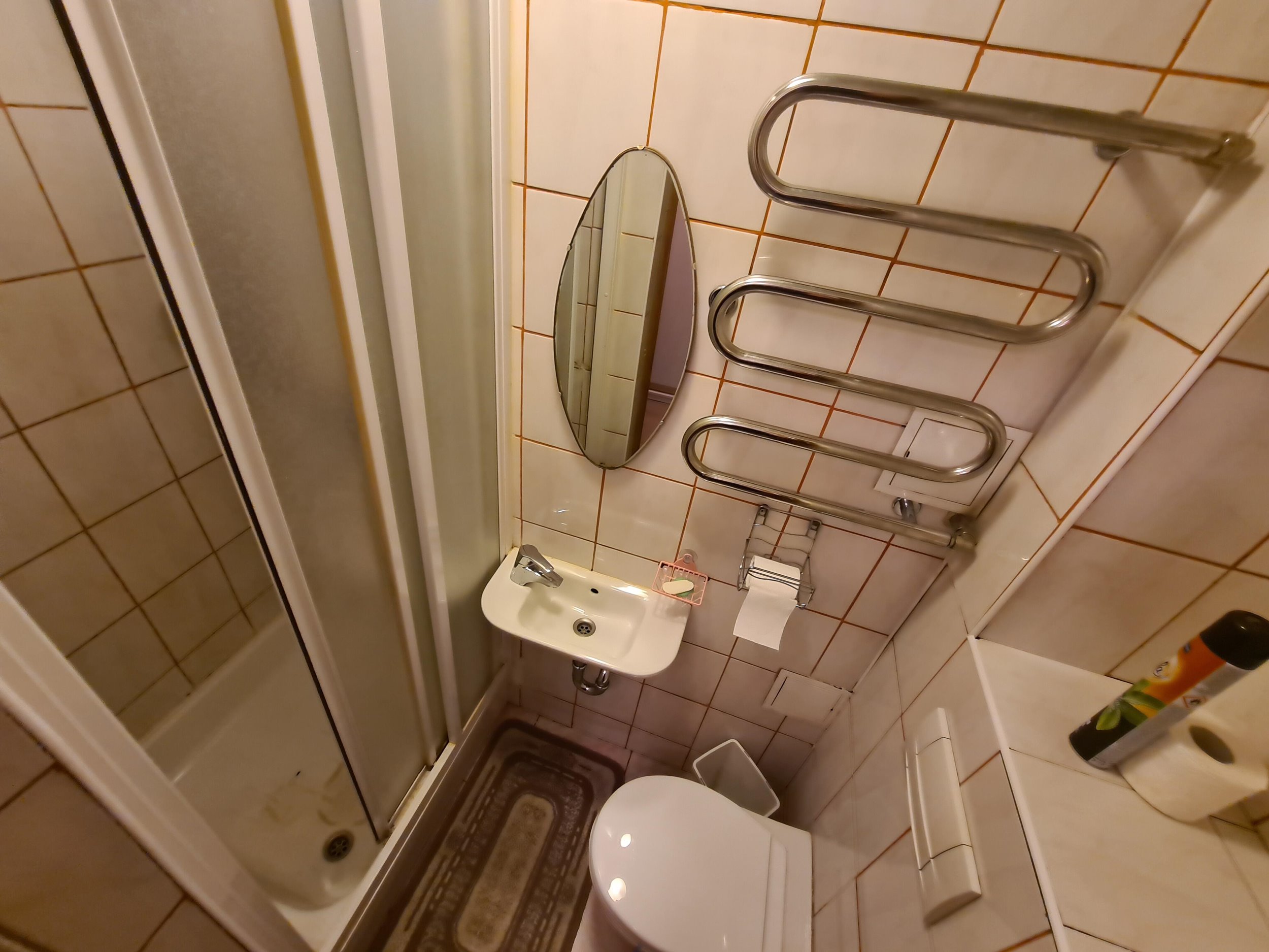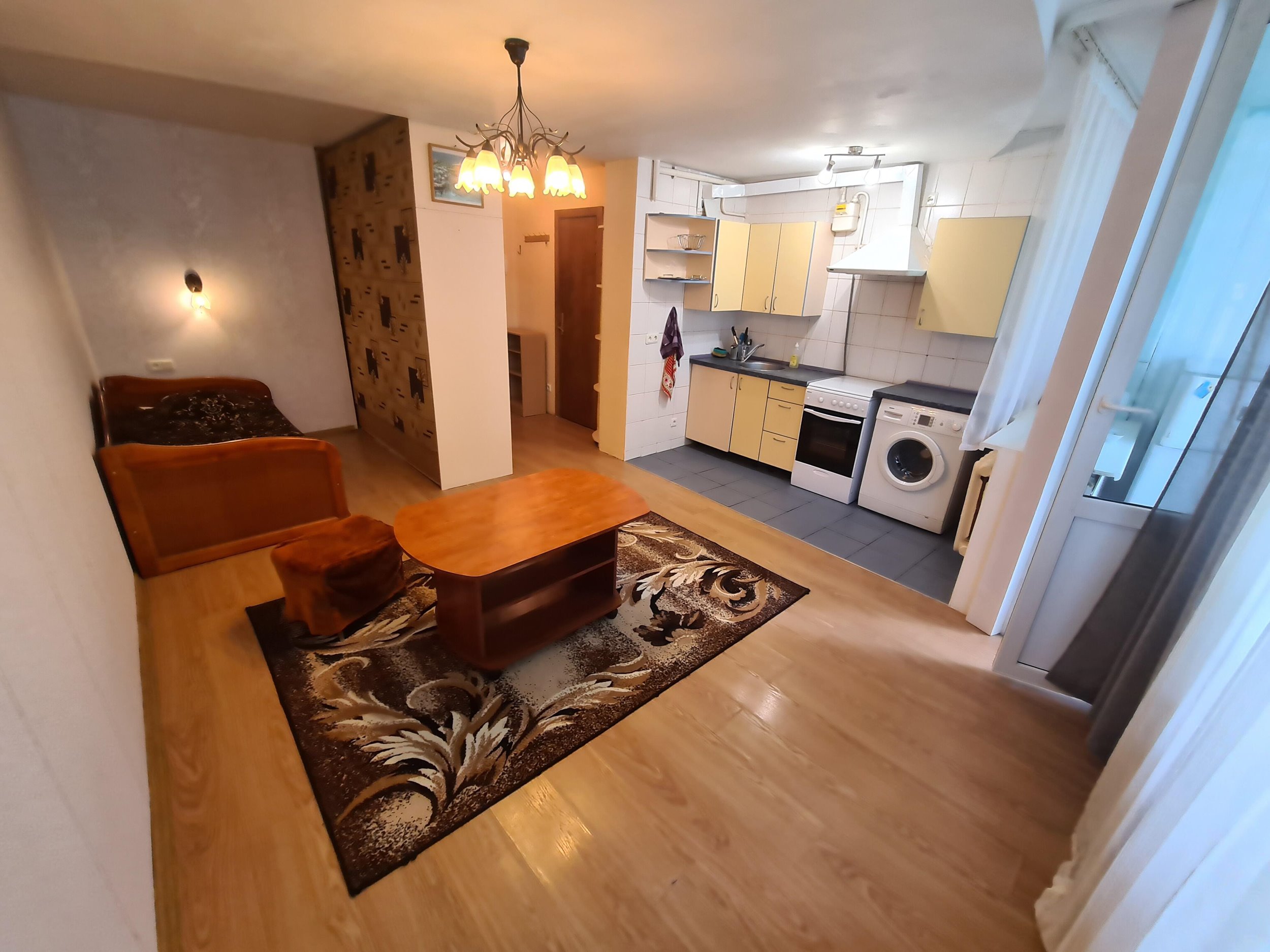 Išplanavimas: miegamasis kambarys kartu su virtuve, tualetas ir dušas kartu, balkonas.