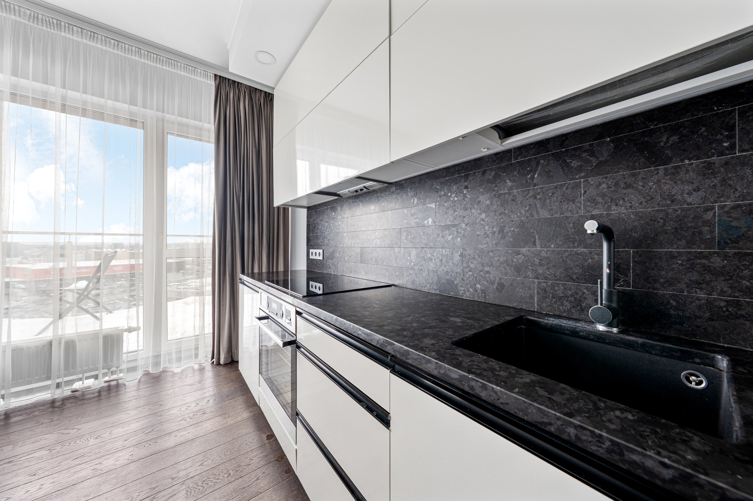 • Virtuvės stalviršis ir sienelė pagaminta iš granito plokštės
