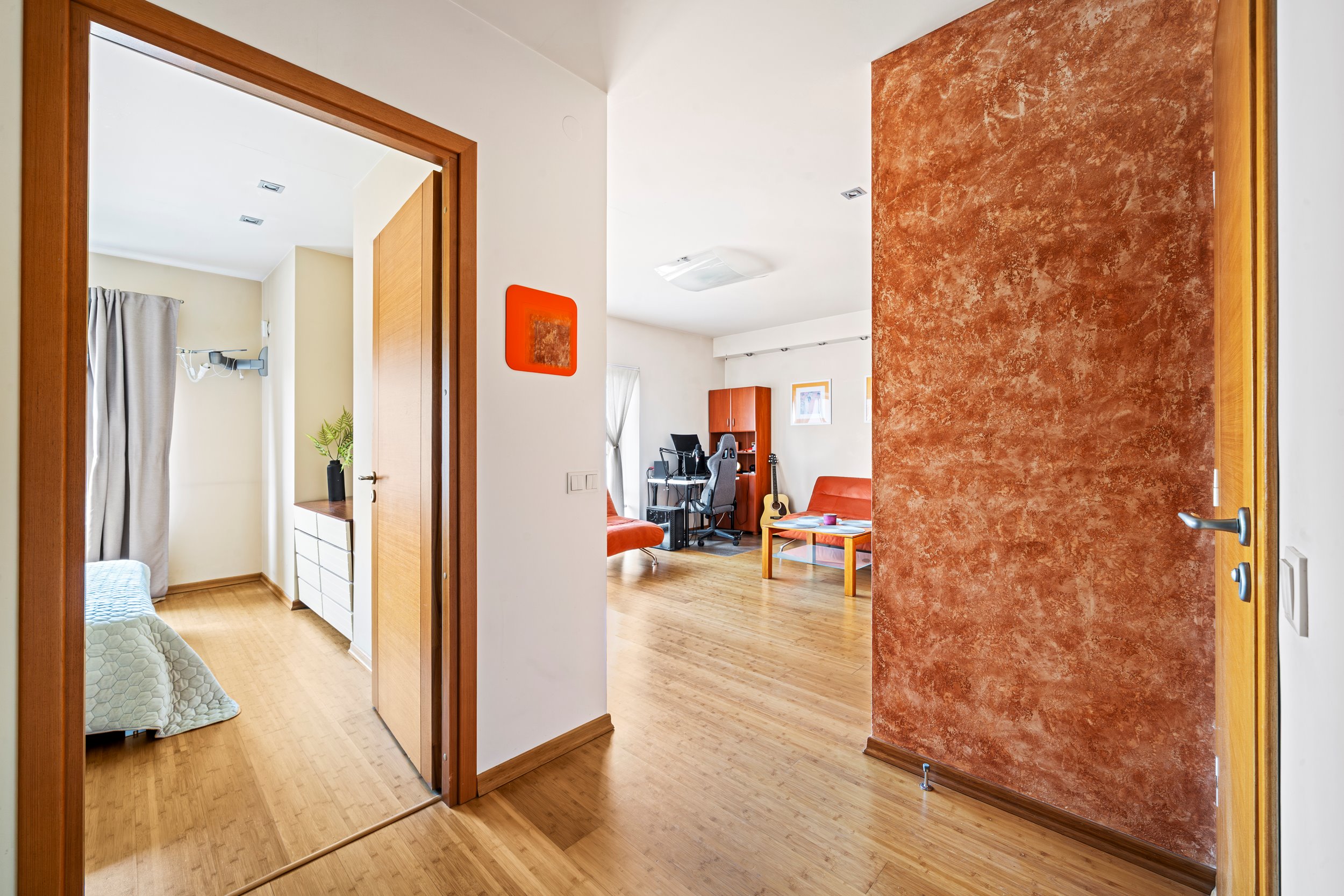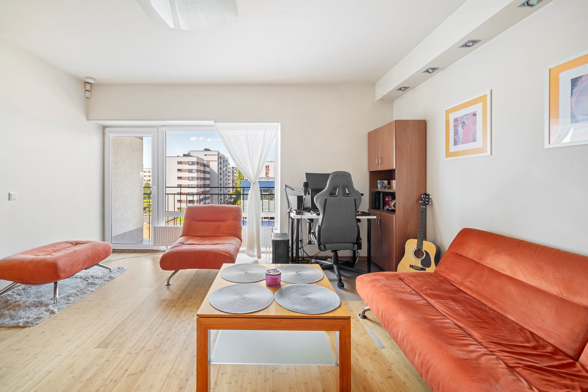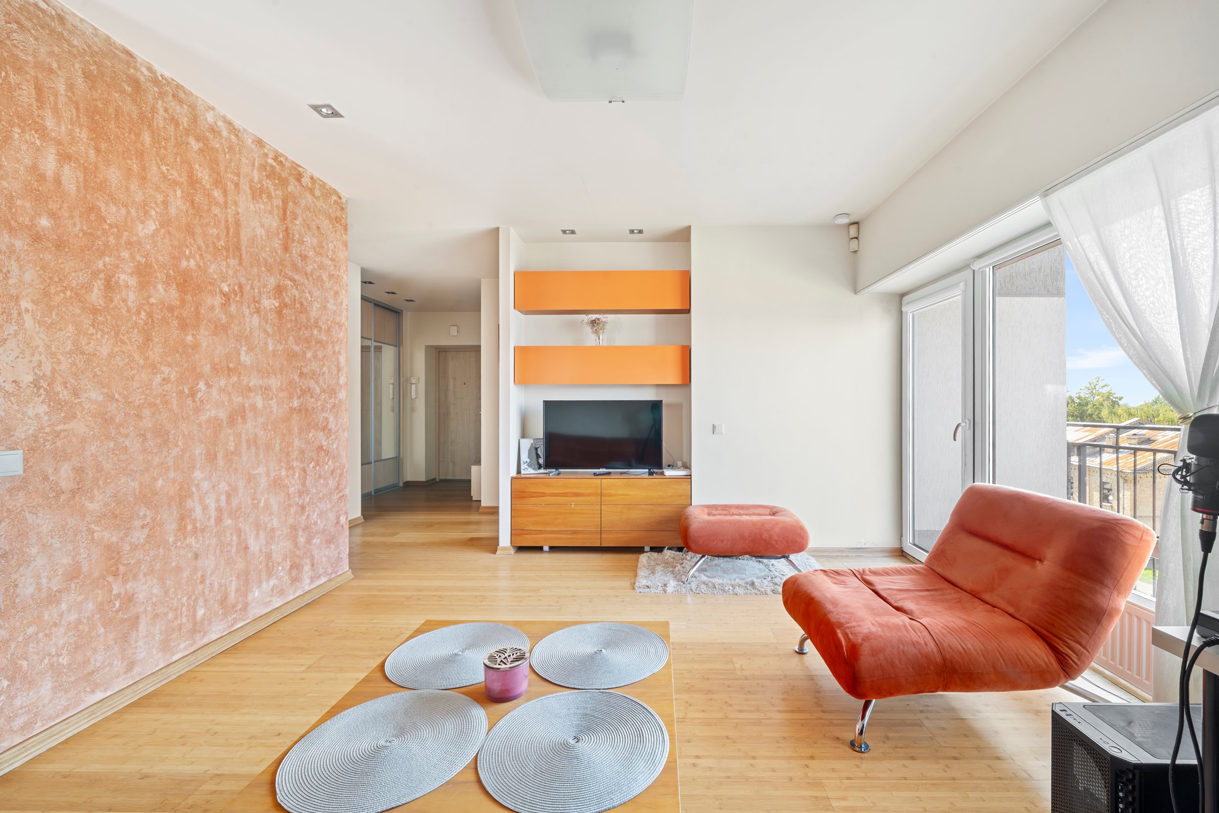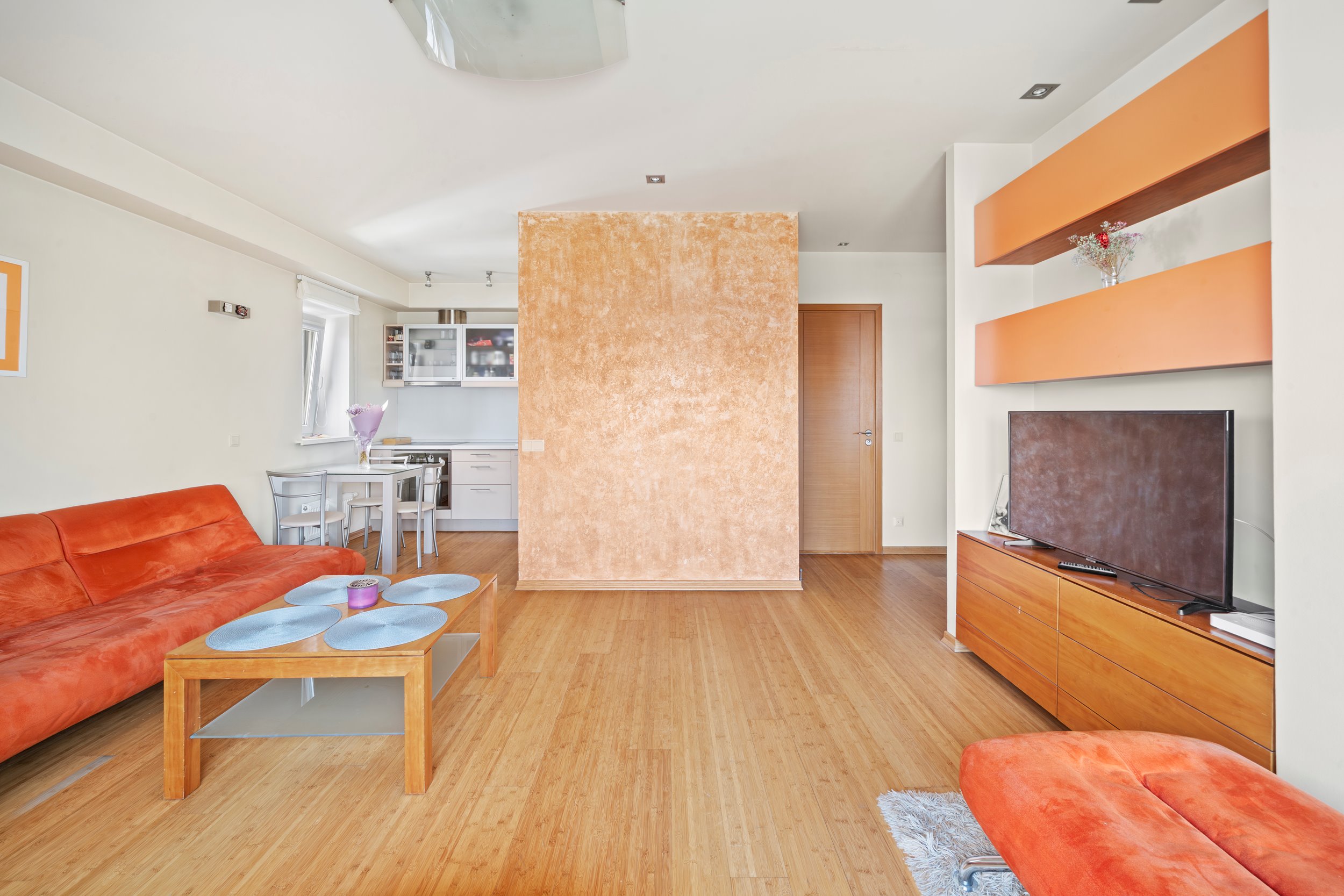 Patogus išplanavimas – erdvi svetainė sujungta su virtuve, miegamasis, tualetas ir dušas kartu, balkonas.