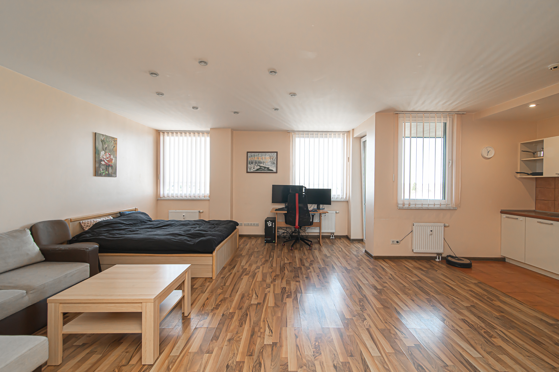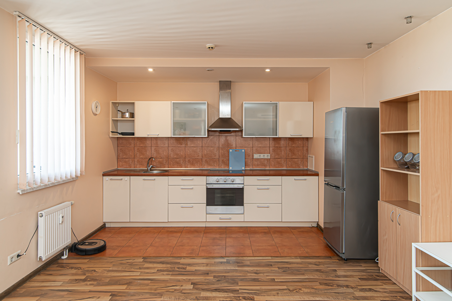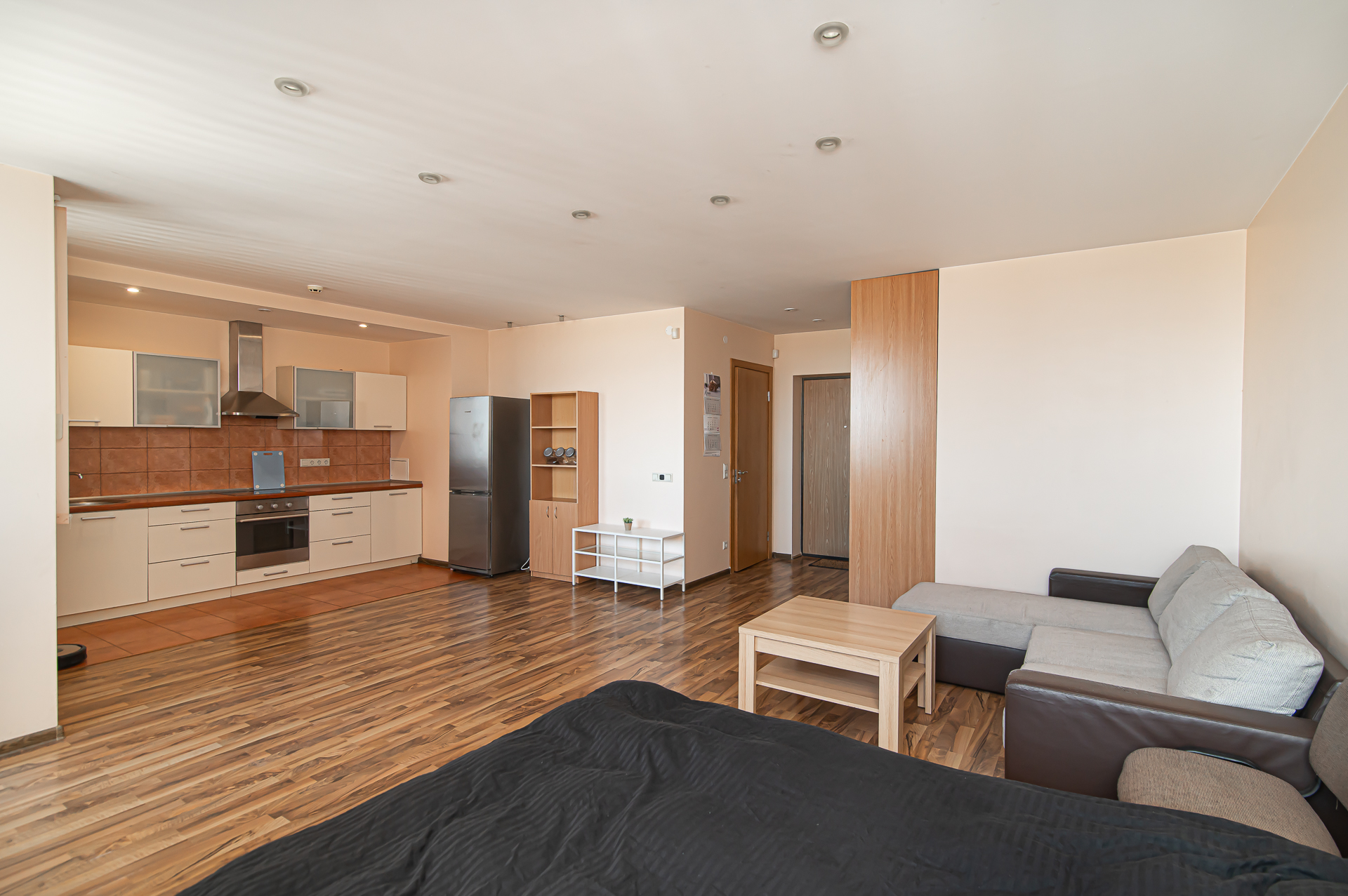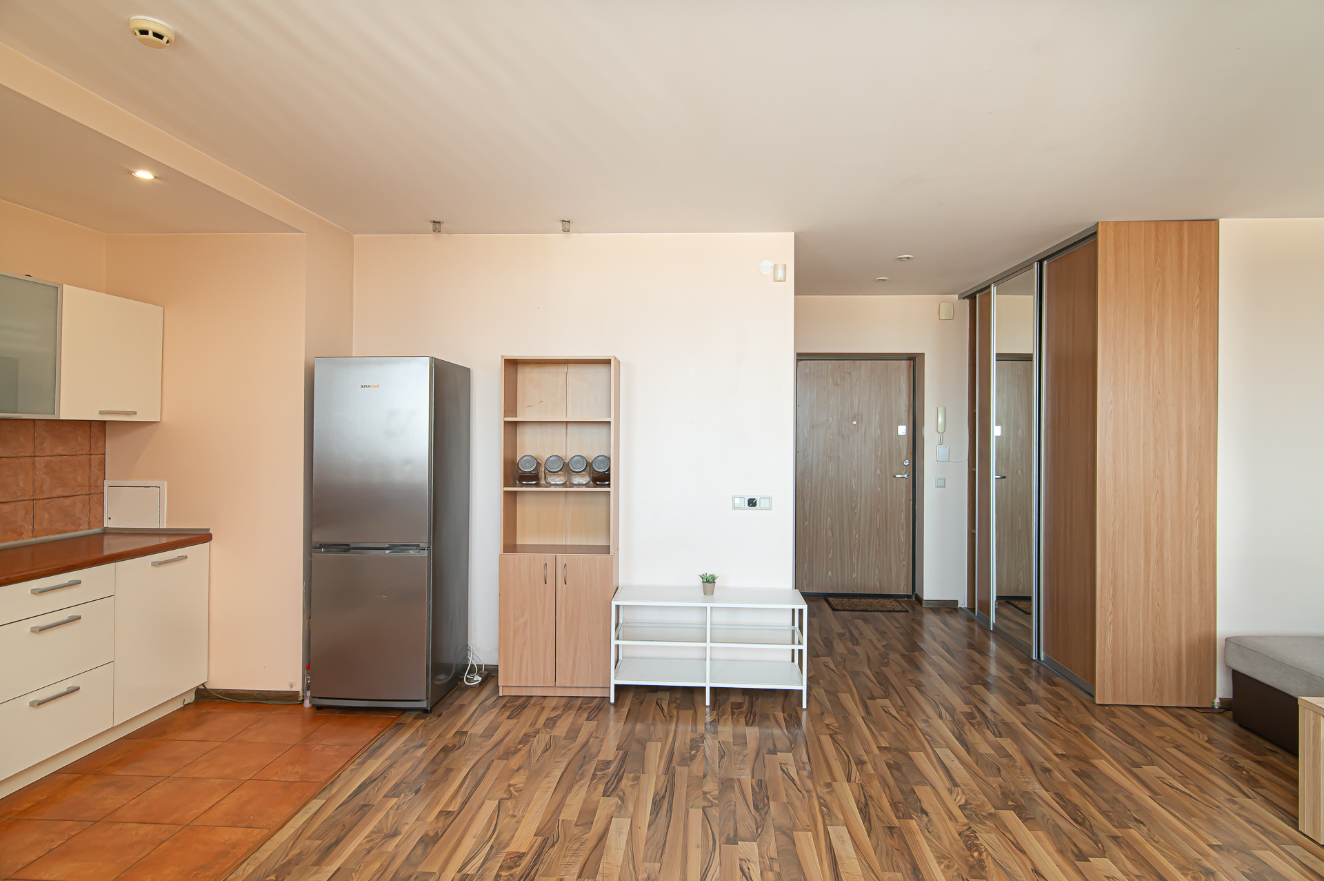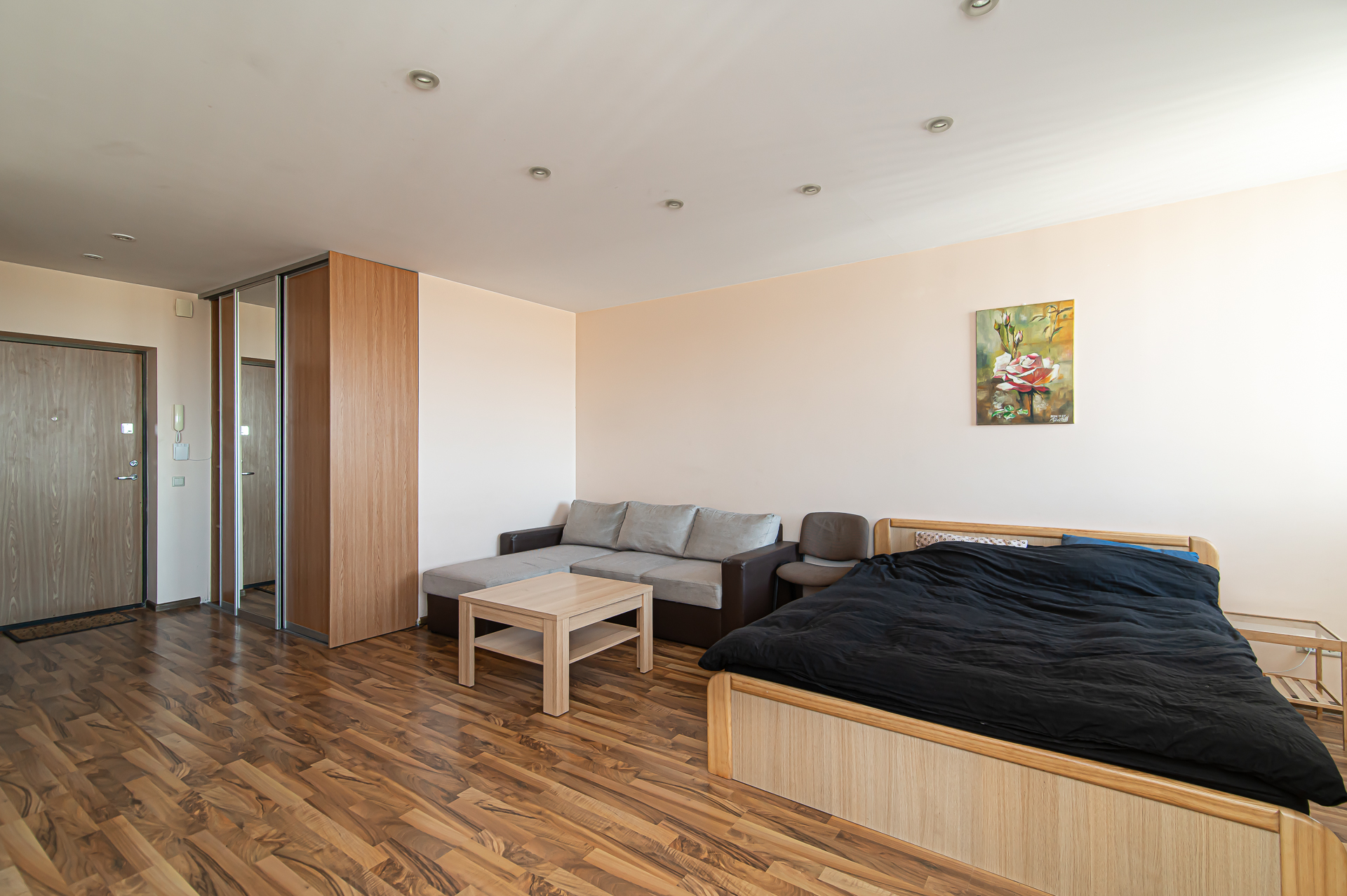 - Išplanavimas: studijos tipo butas, kambarys kartu su virtuve, erdvus vonios kambarys su wc, balkonas. (butas lengvai perplanuojamas į dviejų kambarių butą).