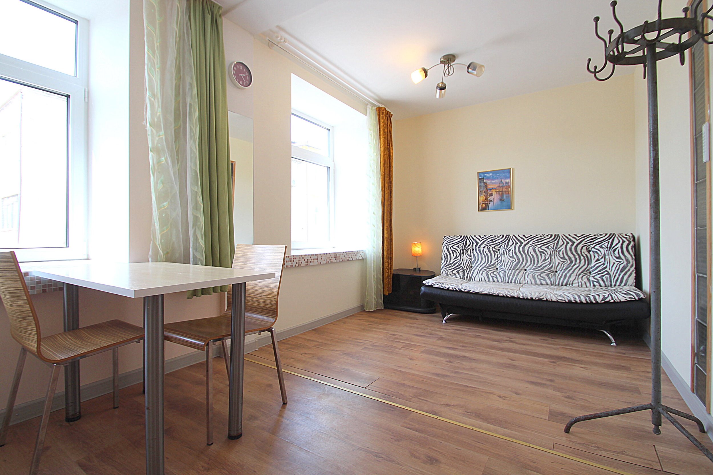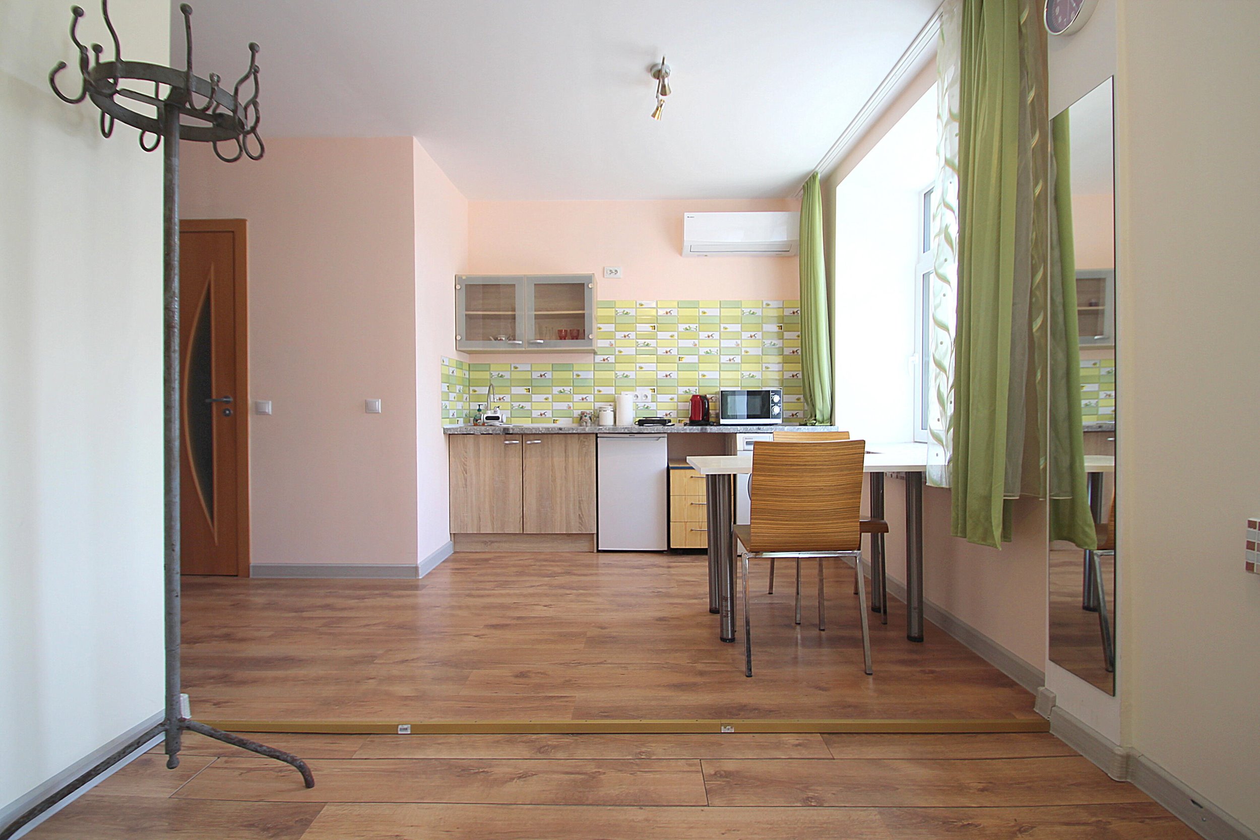 Buto išplanavimas: kambarys kartu su virtuve, atskira miegama zona, dušas kartu su WC.