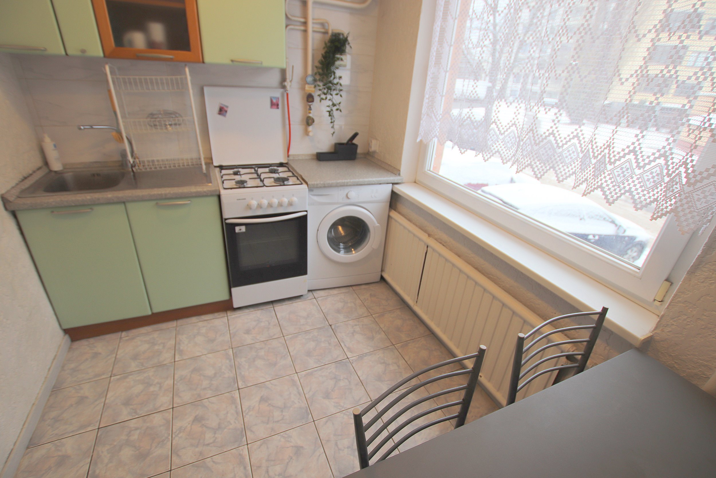 Butas su atskira virtuve, 2 atskirais kambariais ir pereinamuoju kambariu, vonia ir tualetu atskirai. Yra įstiklintas balkonas. Žiemos komunaliniai (su šildymu) ~120 €/mėn.