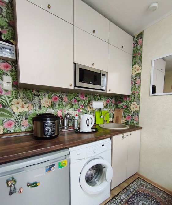 Įrengta virtuvėlė pagal individualų užsakymą su reikalinga buitine technika.