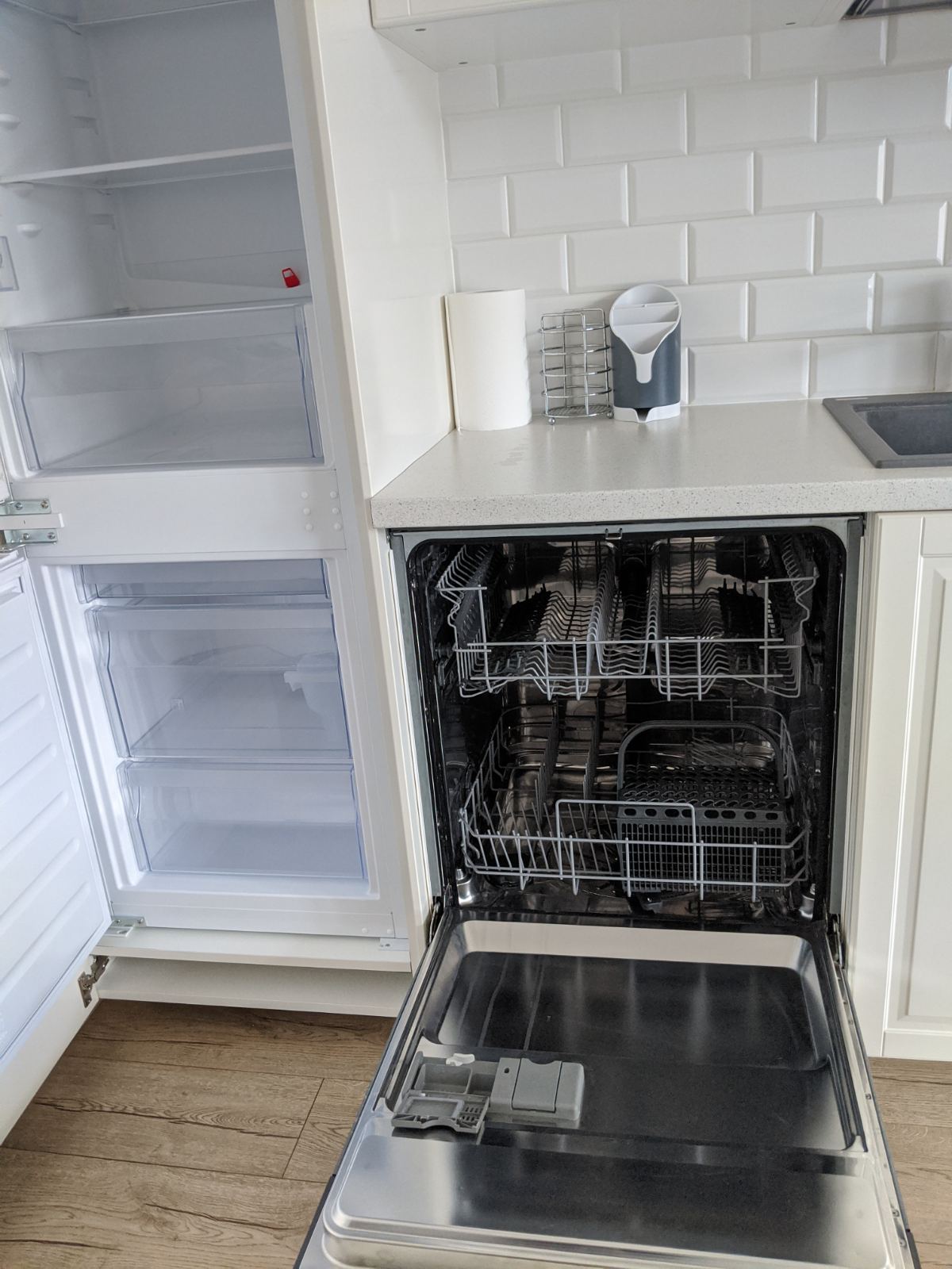 Virtuvė su visa reikalinga buitine technika, įskaitant indaplovę