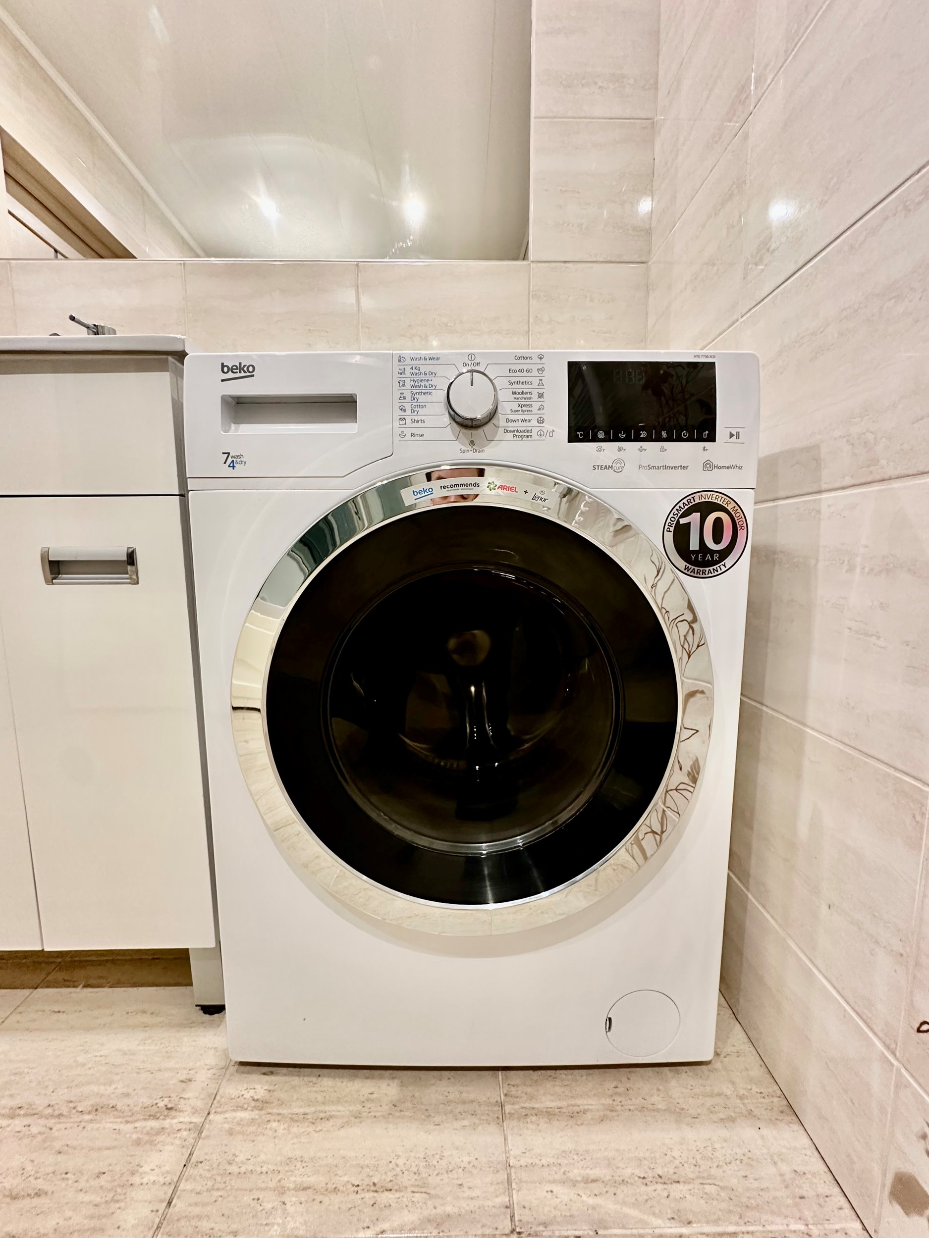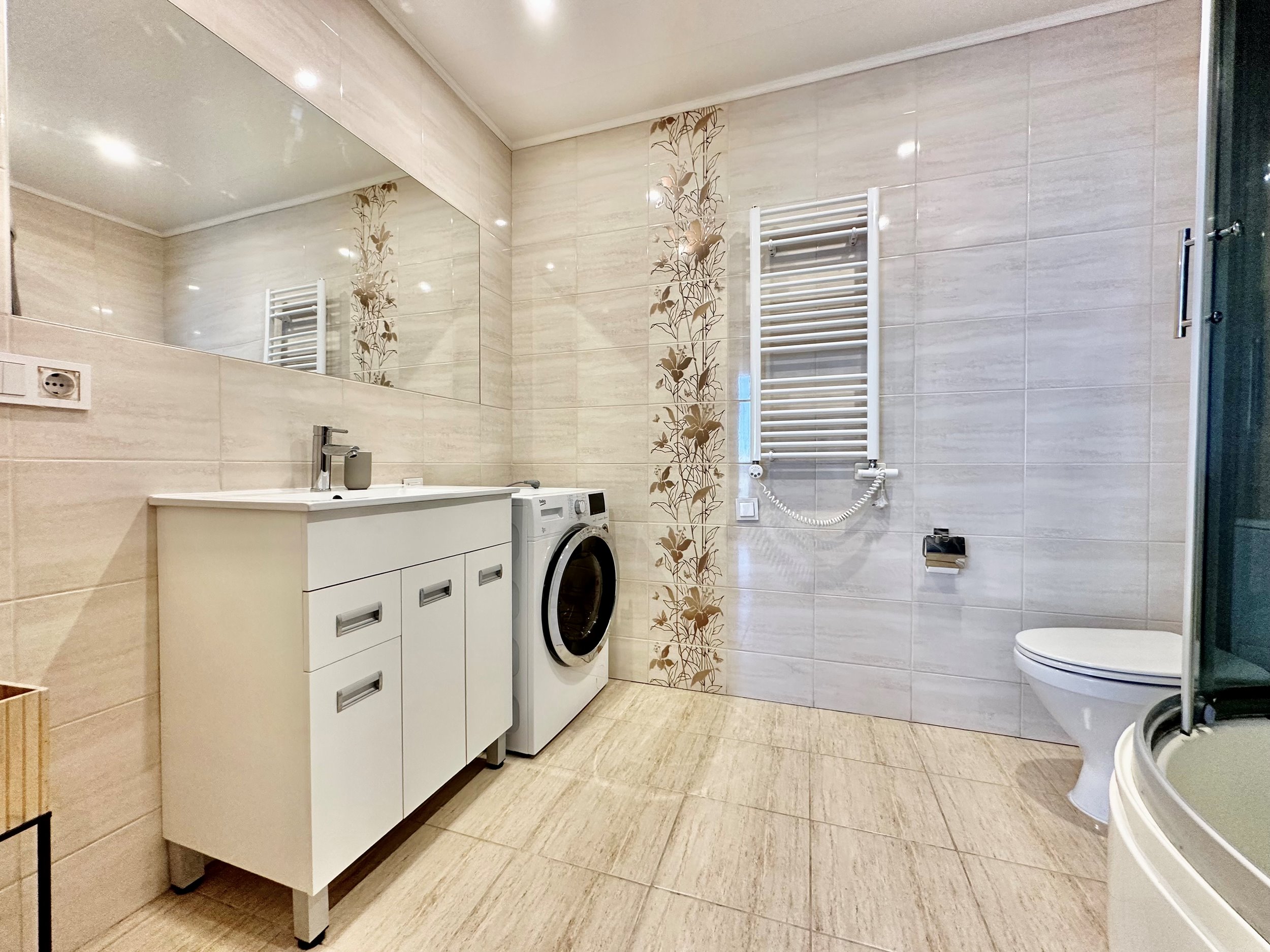 Bute yra visi reikalingiausi baldai: skalbimo mašina su džiovykle, šaldytuvas su šaldikliu, kaitlentė ir t.t.