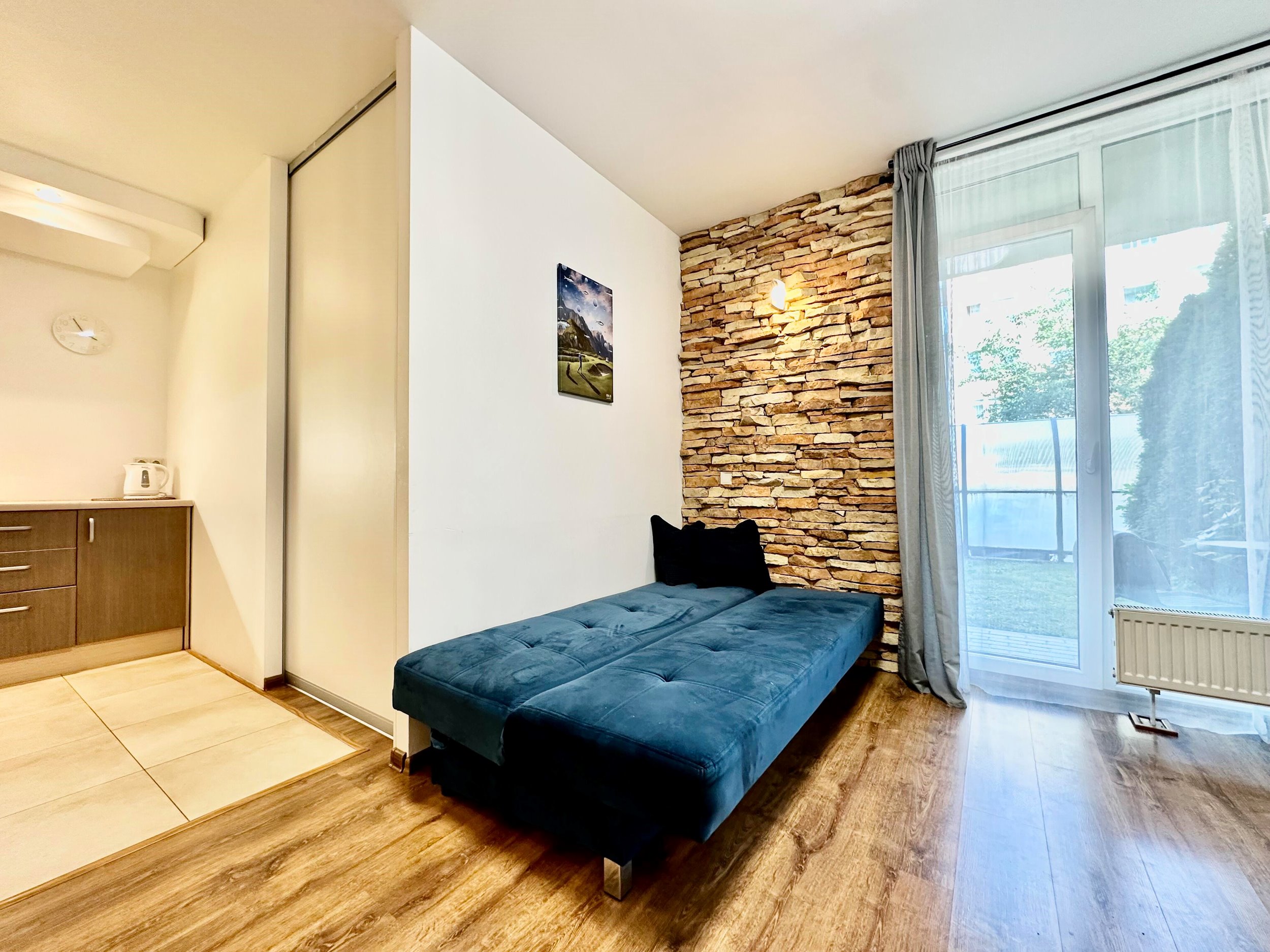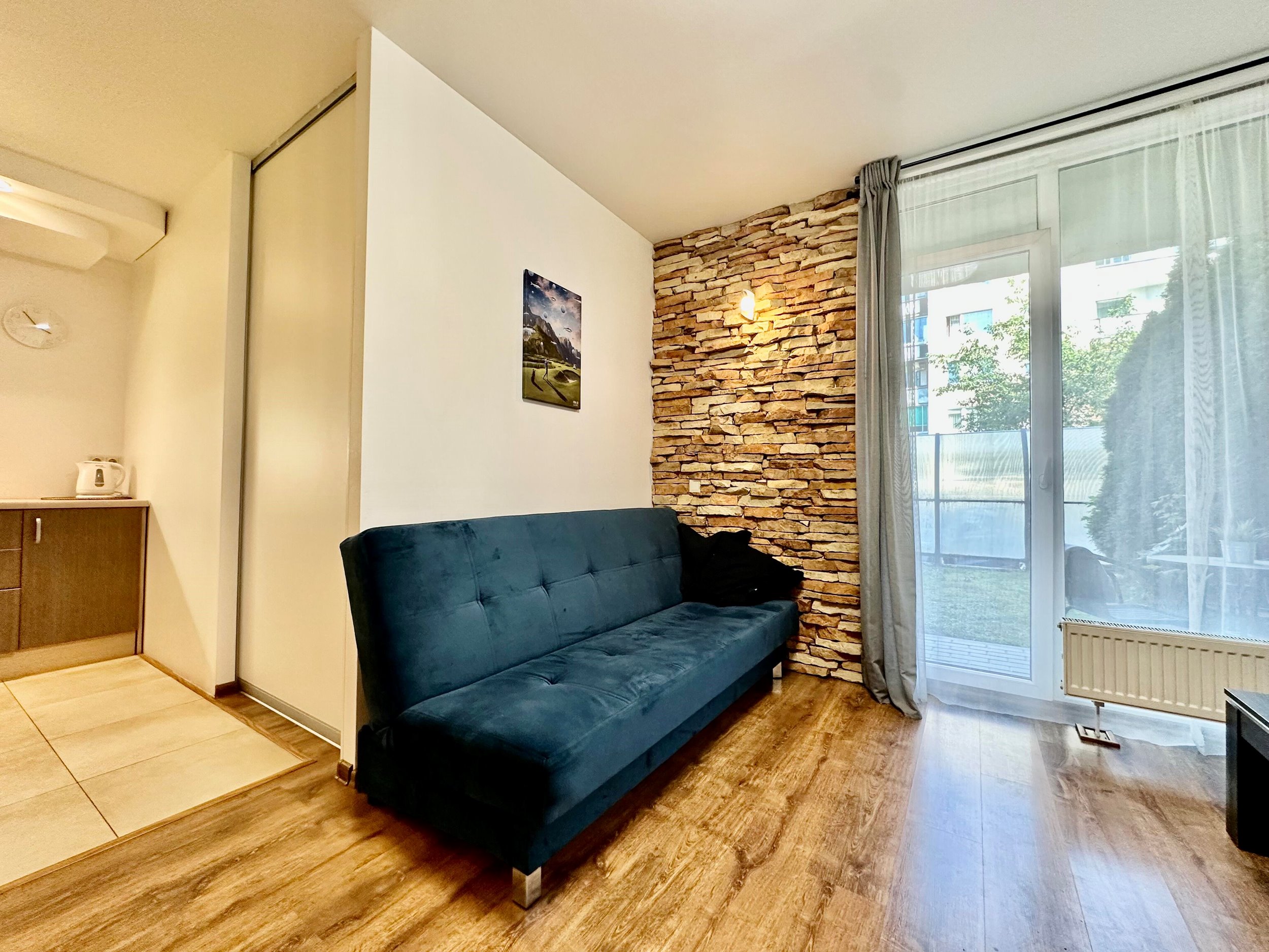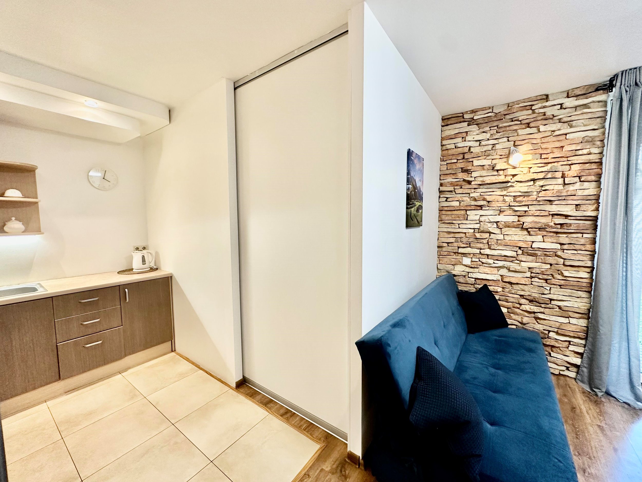 Išplanavimas: svetainė, miegamasis, virtuvė, terasa - kiemelis, tualetas ir vonia.