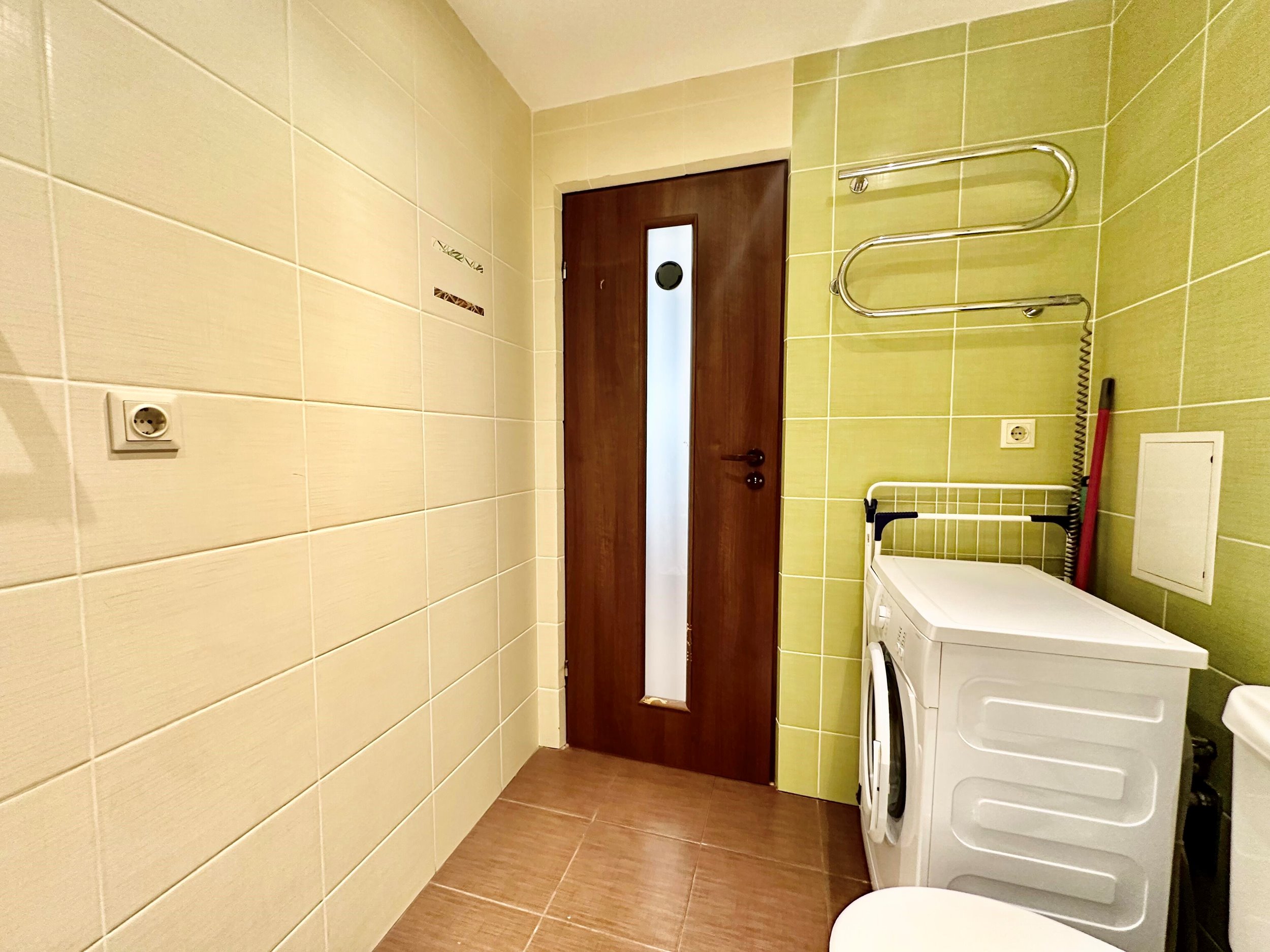 Bute yra visi reikalingiausi baldai: skalbimo mašina, šaldytuvas su šaldikliu, kaitlentė ir t.t.