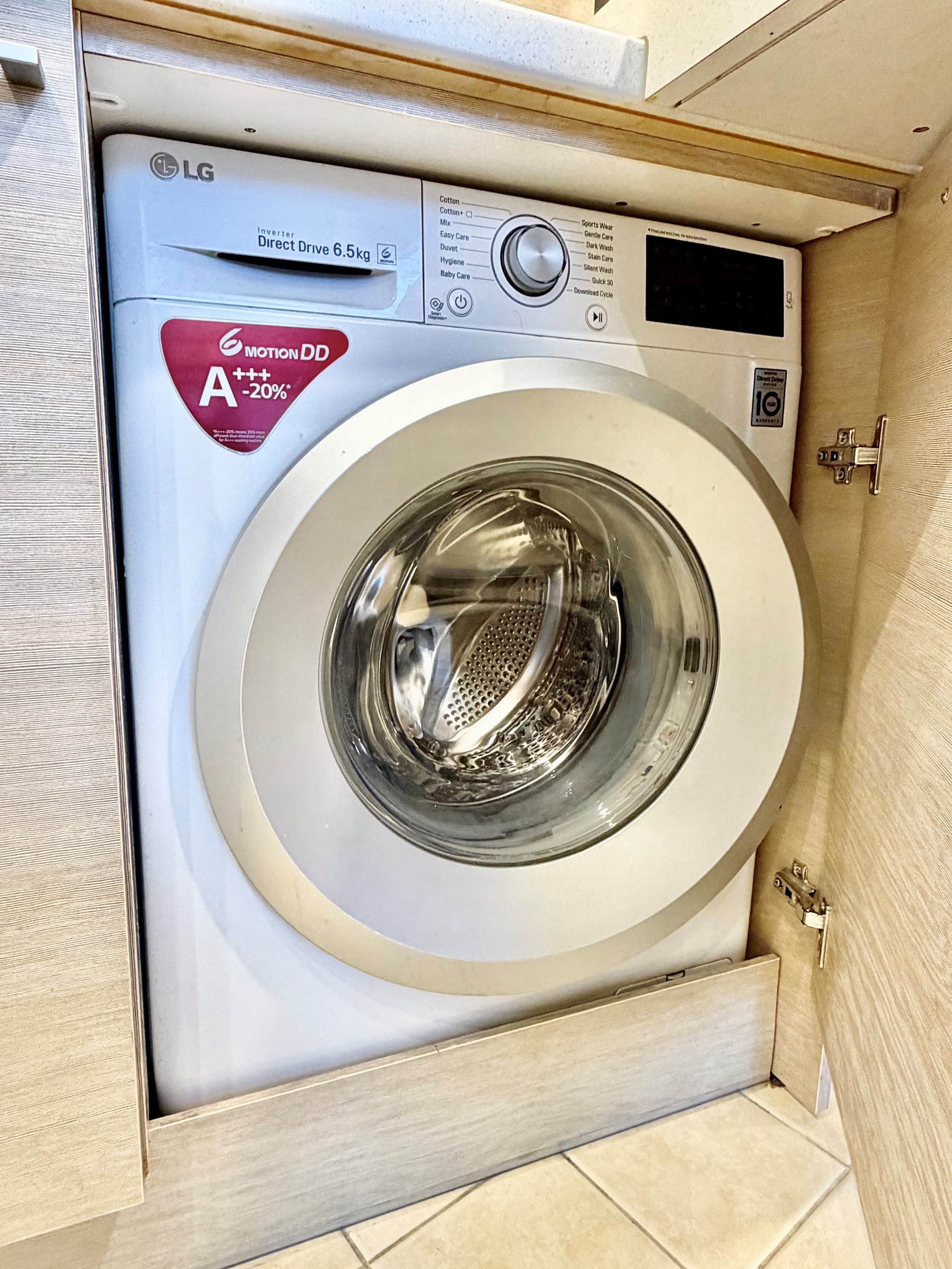 Bute yra visi reikalingiausi baldai: skalbimo mašina, šaldytuvas su šaldikliu, kaitlentė ir t.t.