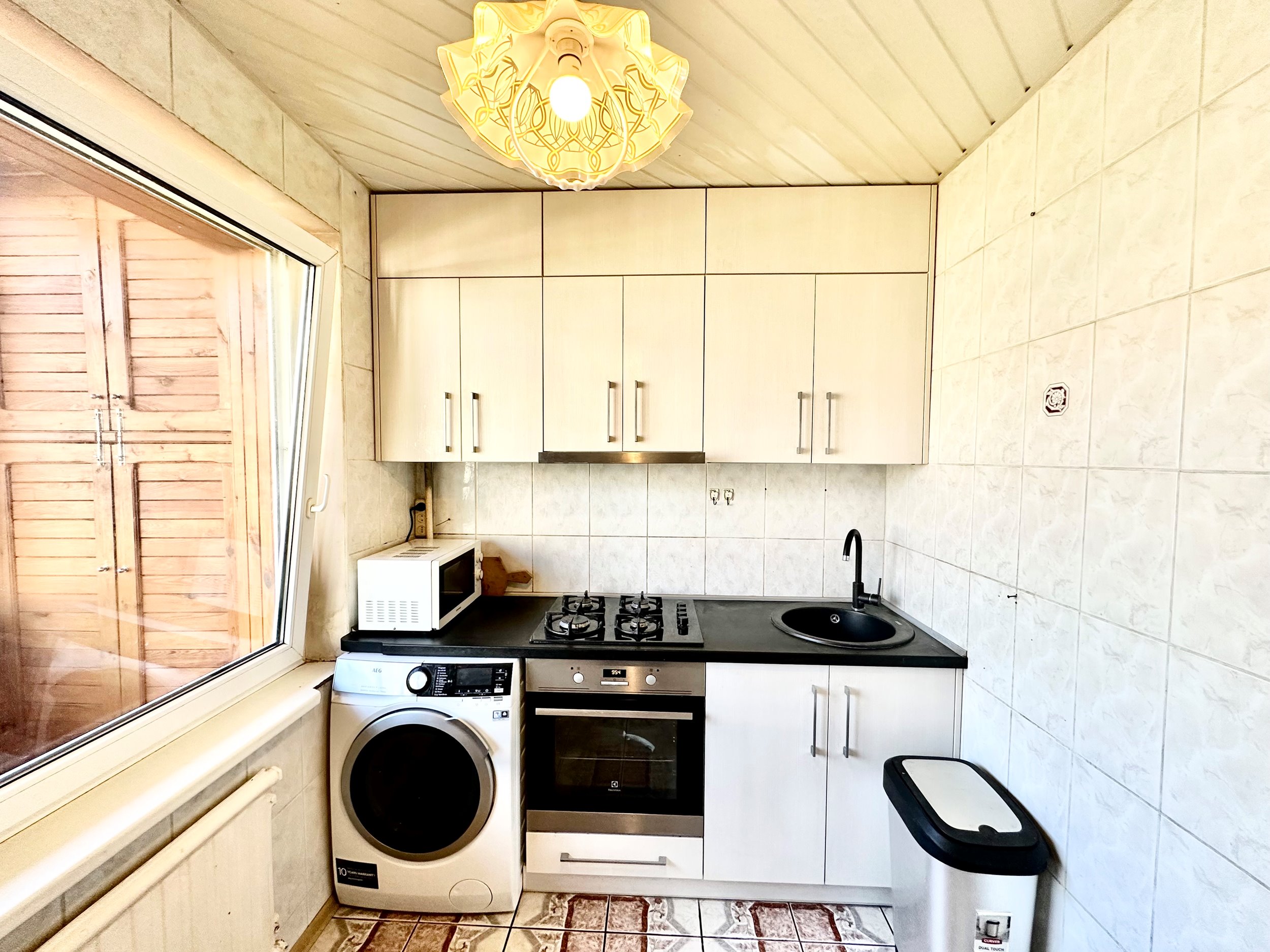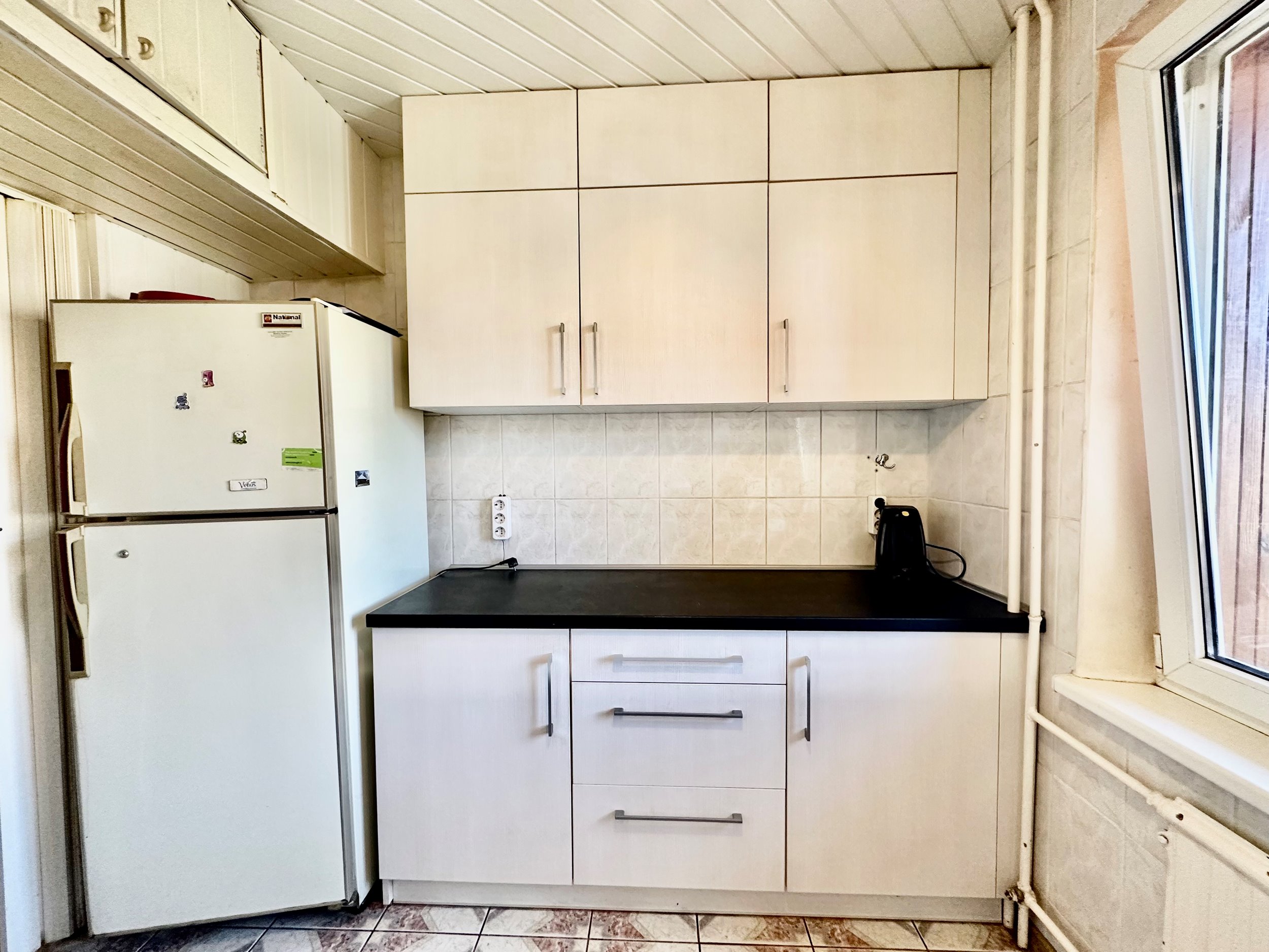 Bute yra visi reikalingiausi baldai: skalbimo mašina, šaldytuvas su šaldikliu, viryklė ir t.t.