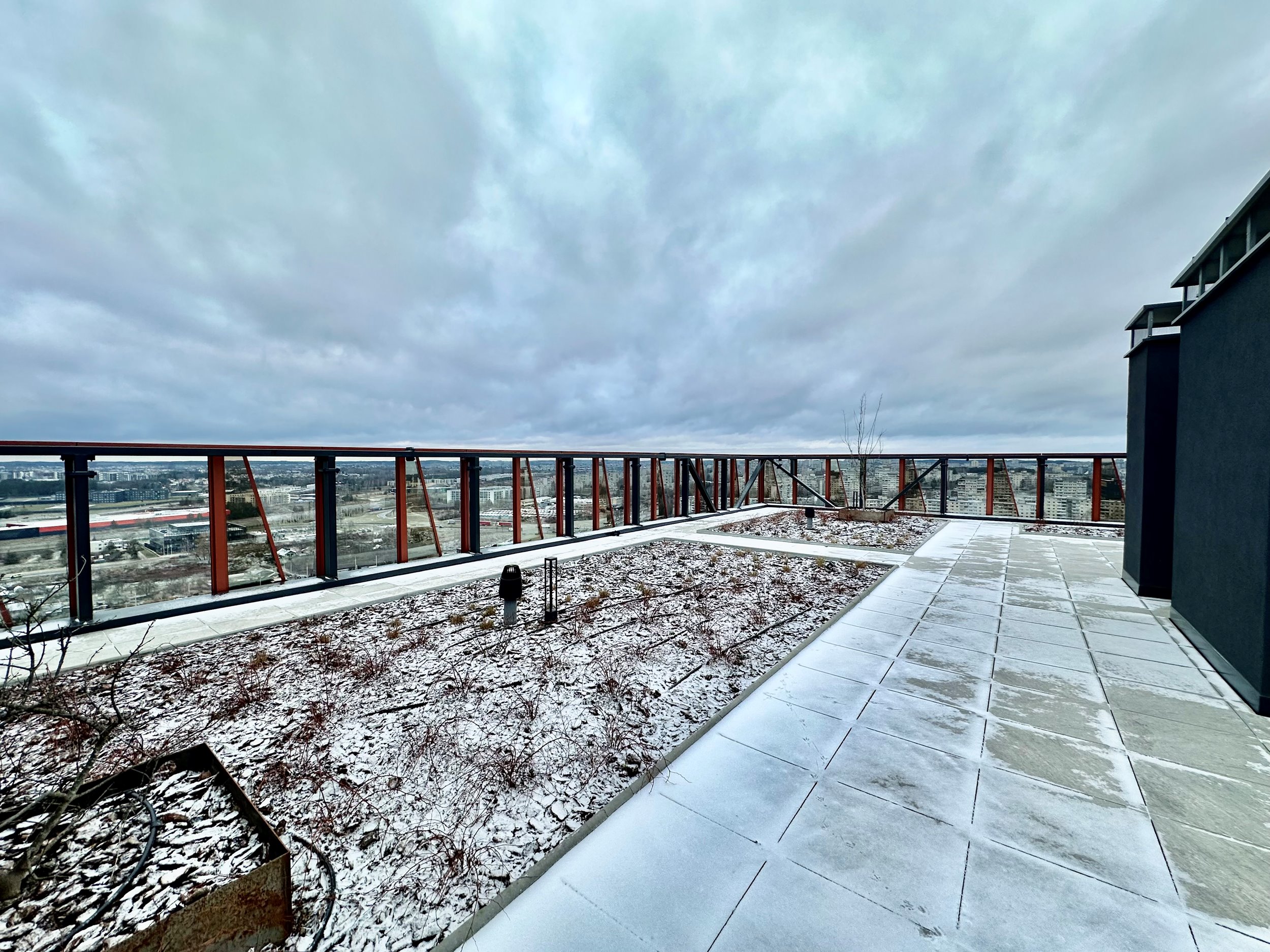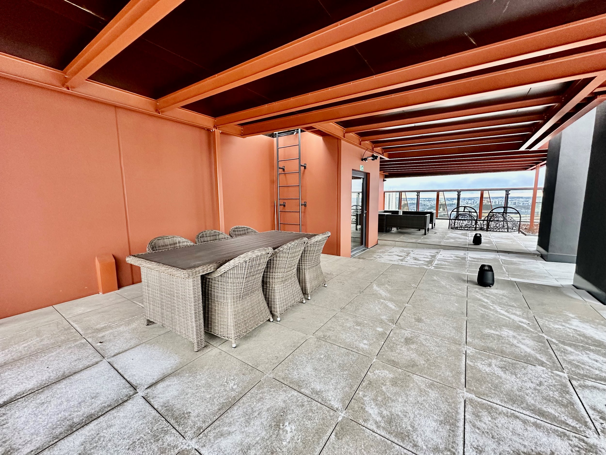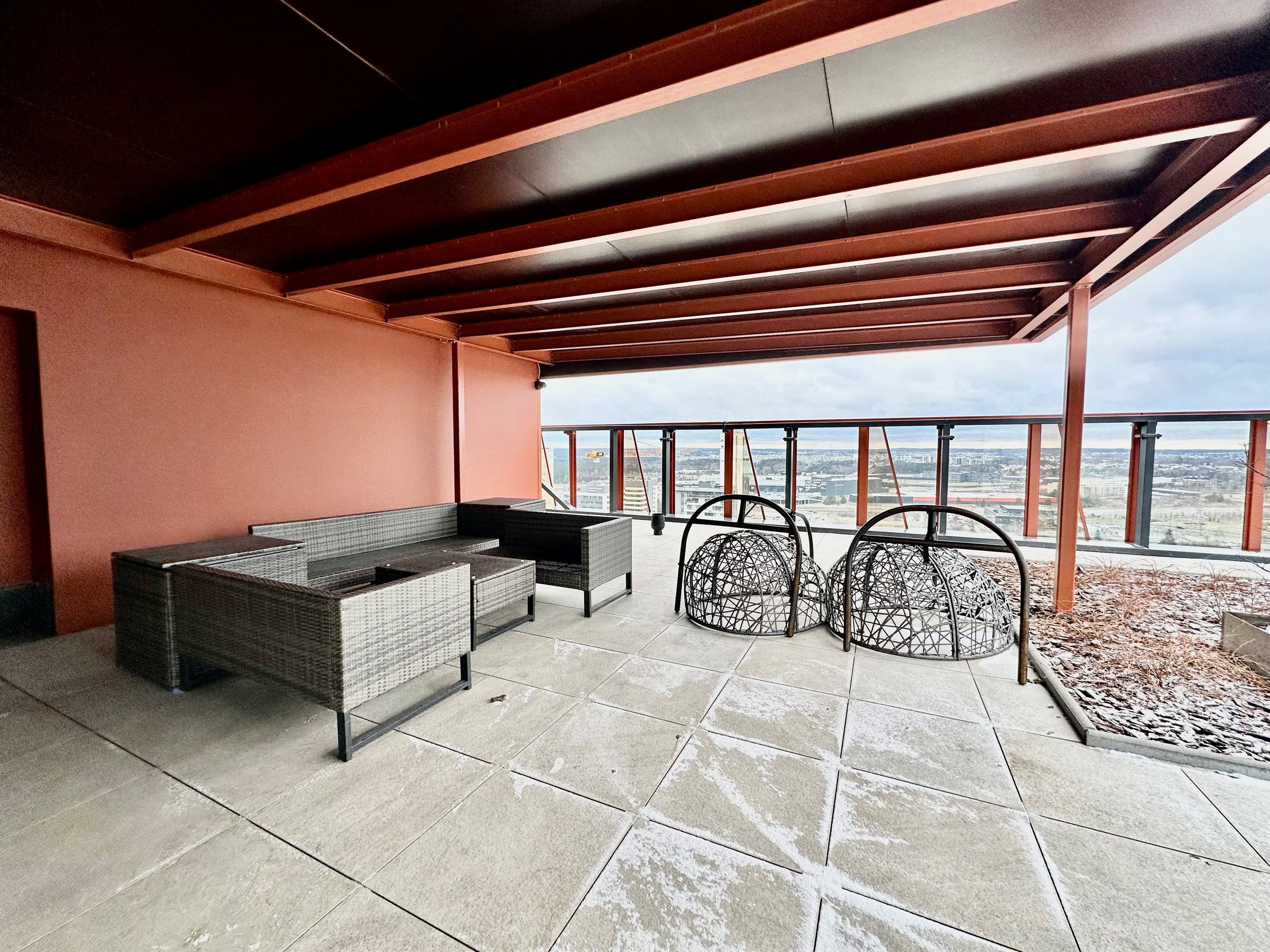 Uždaros terasos su poilsio vietomis ir gražiu vaizdu.