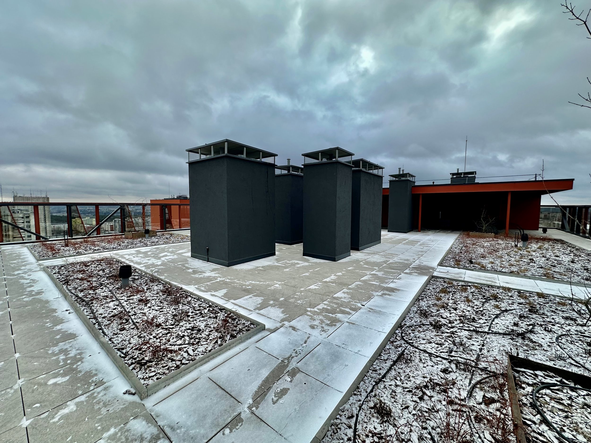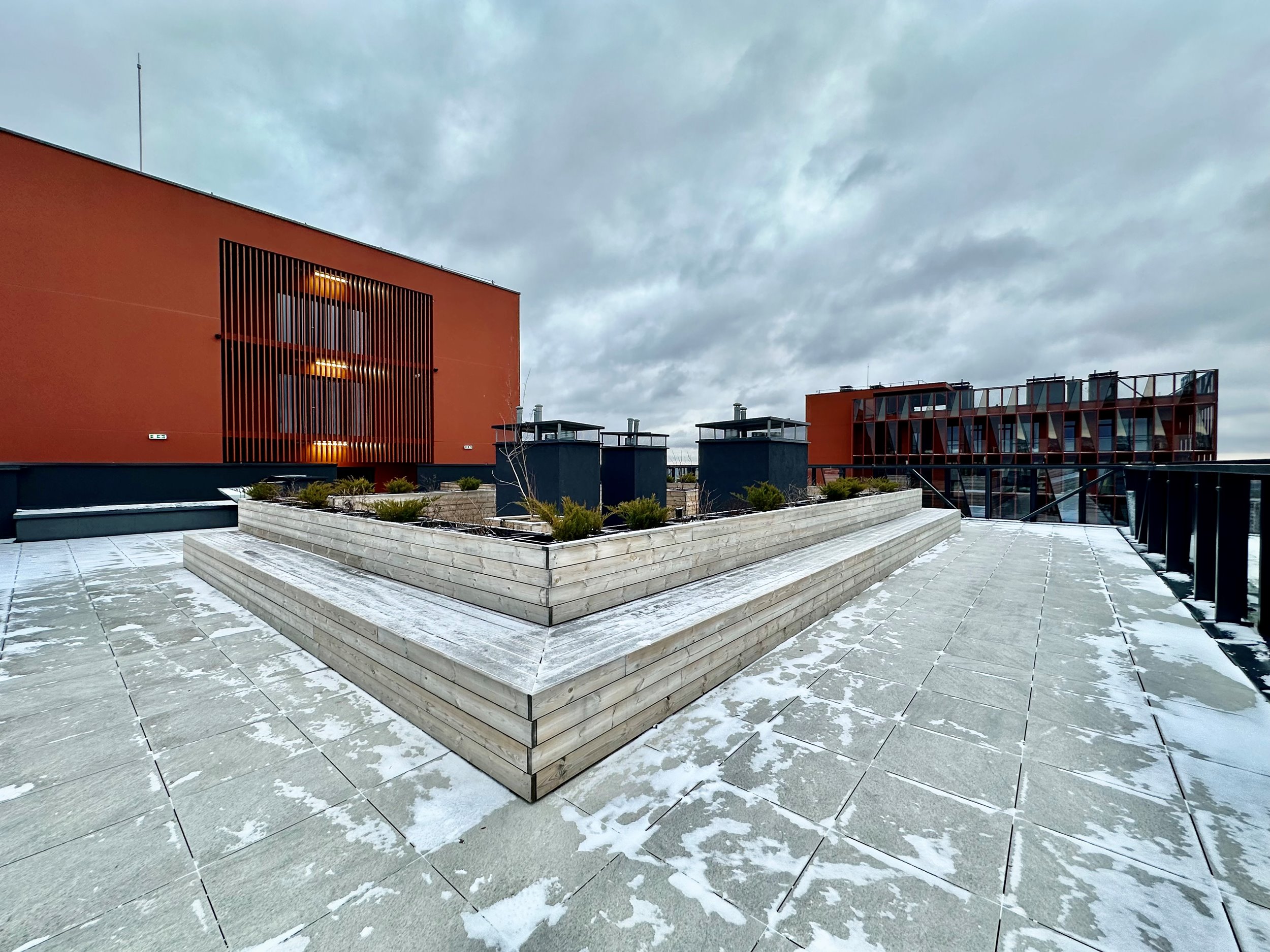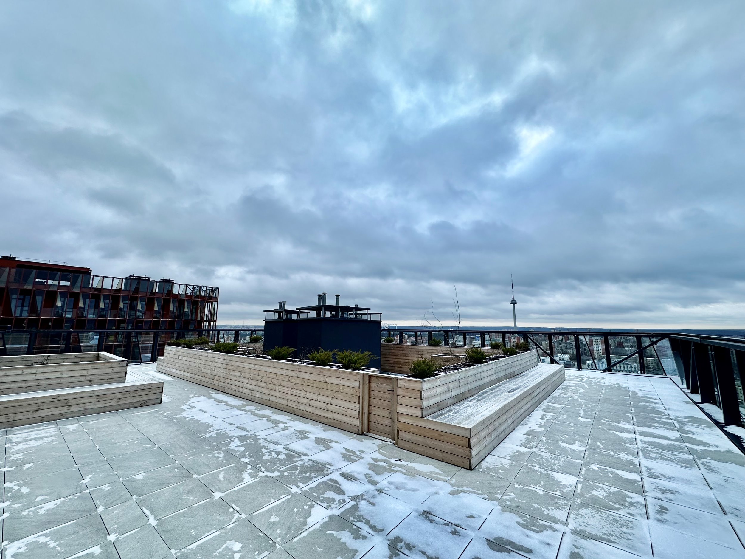 Uždaros terasos su poilsio vietomis ir gražiu vaizdu.