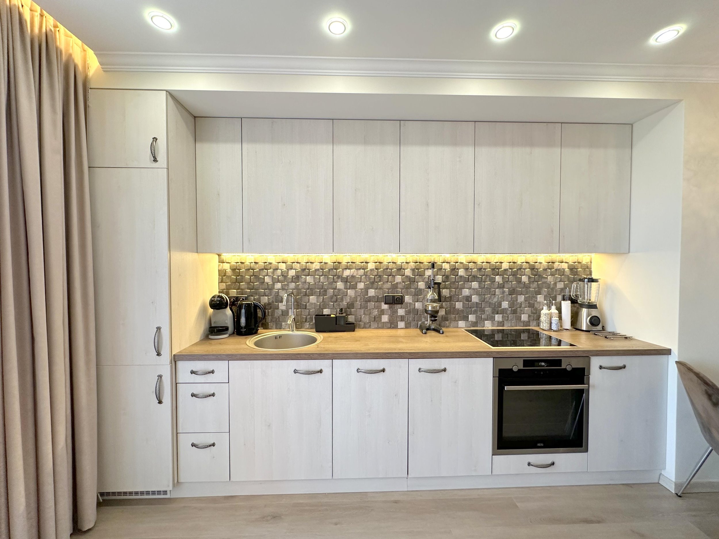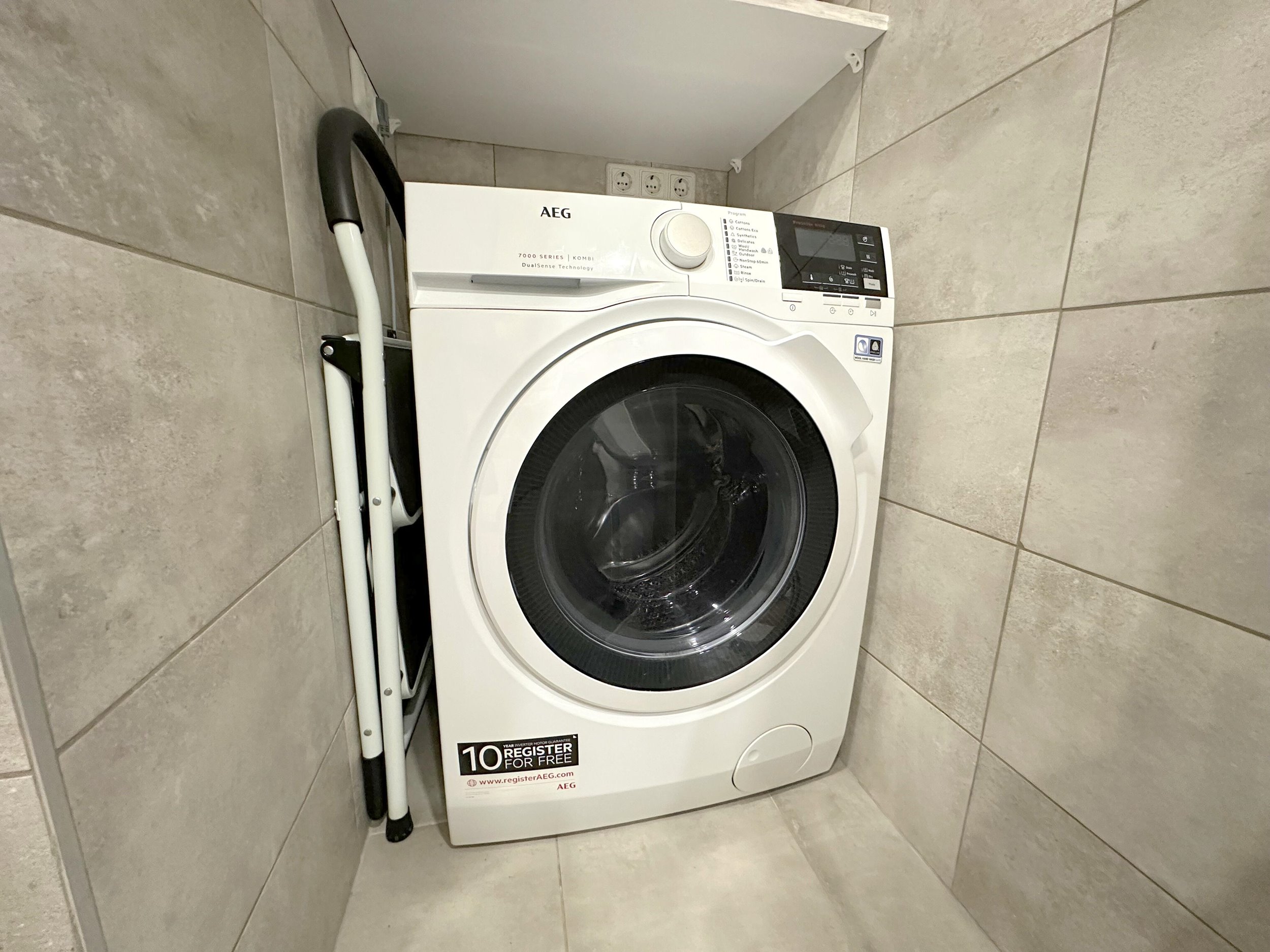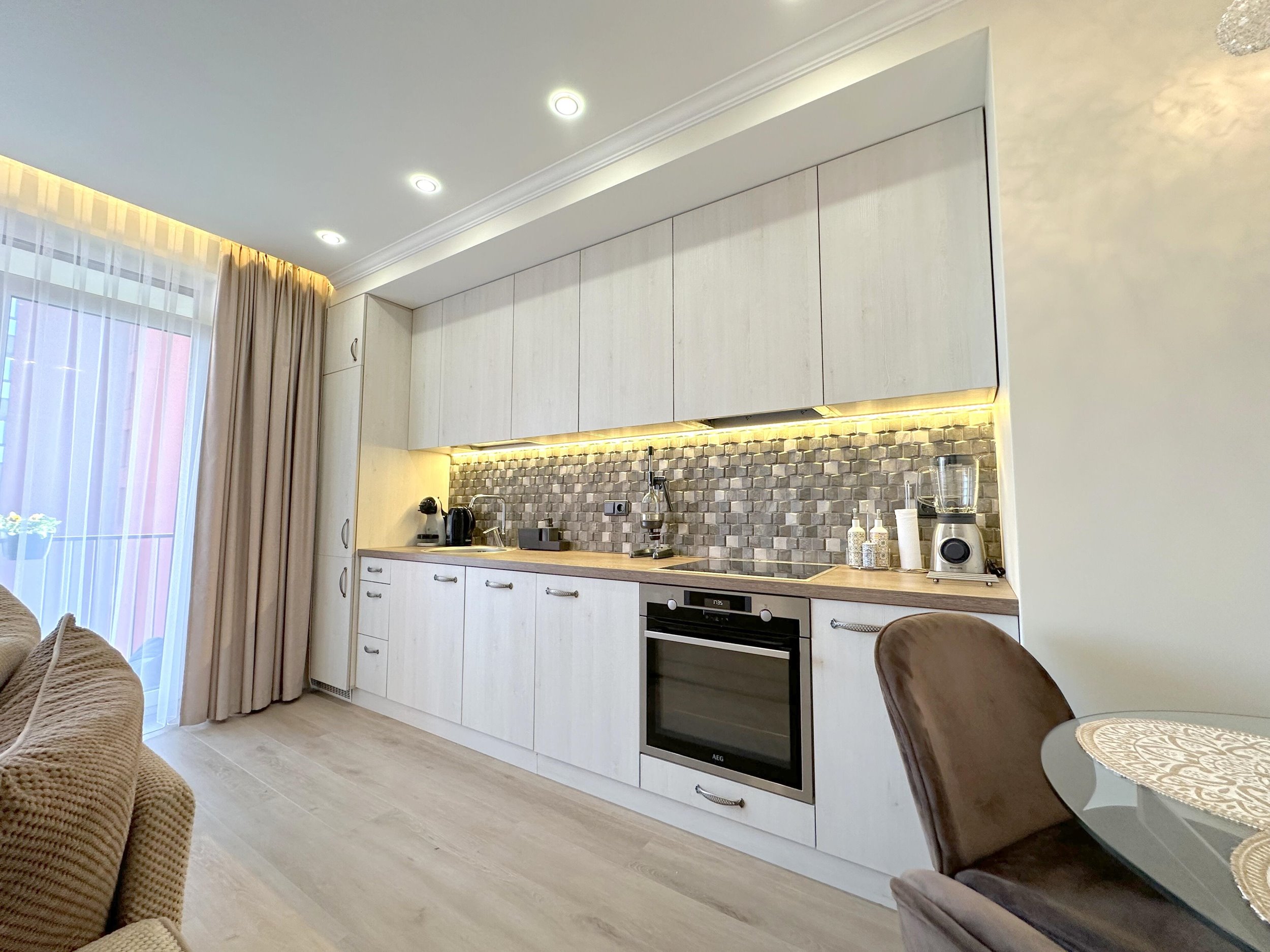 Bute yra visi reikalingiausi baldai, skalbimo mašina su džiovykle, indaplovė, šaldytuvas, viryklė, orkaitė ir t.t.