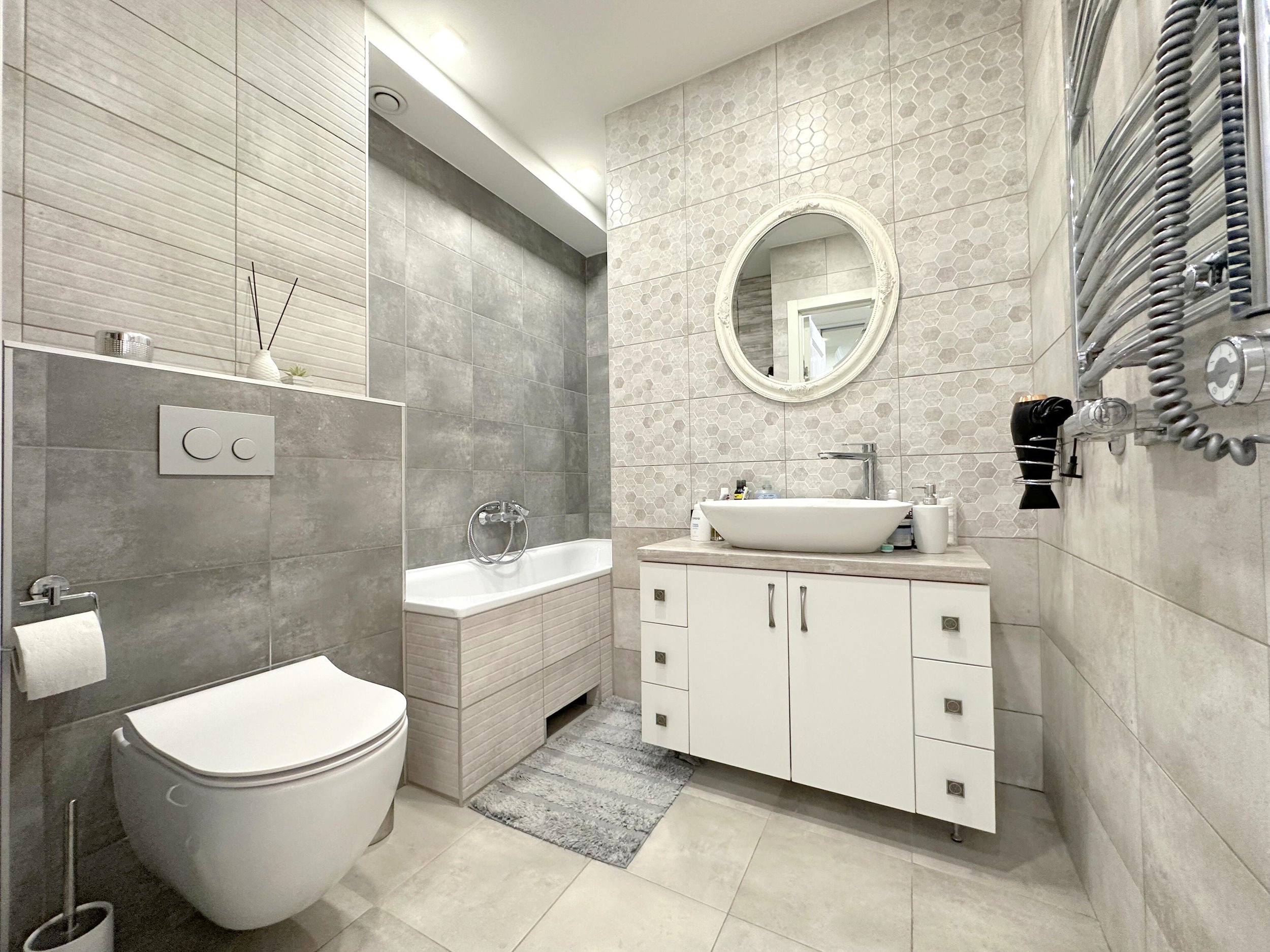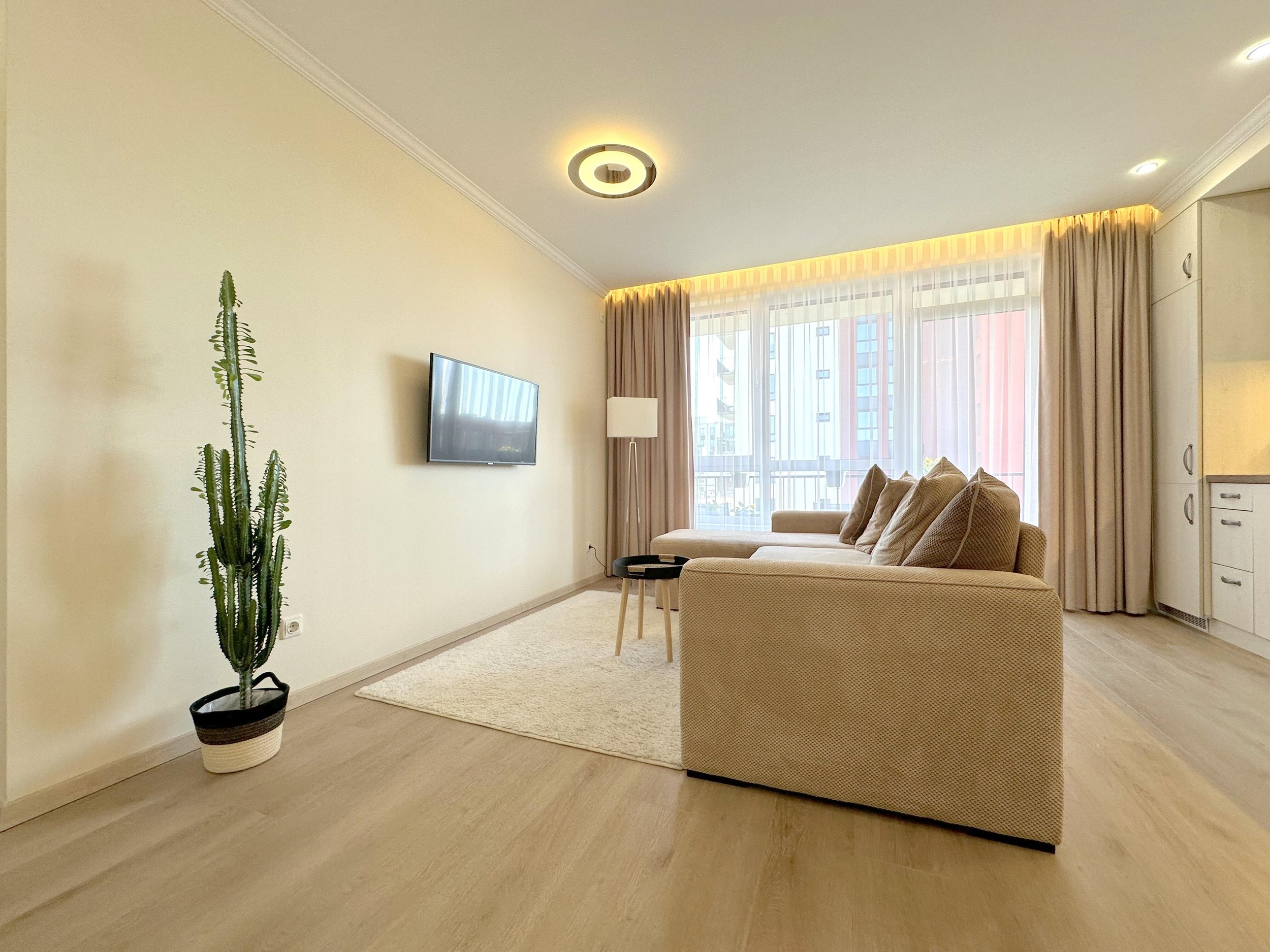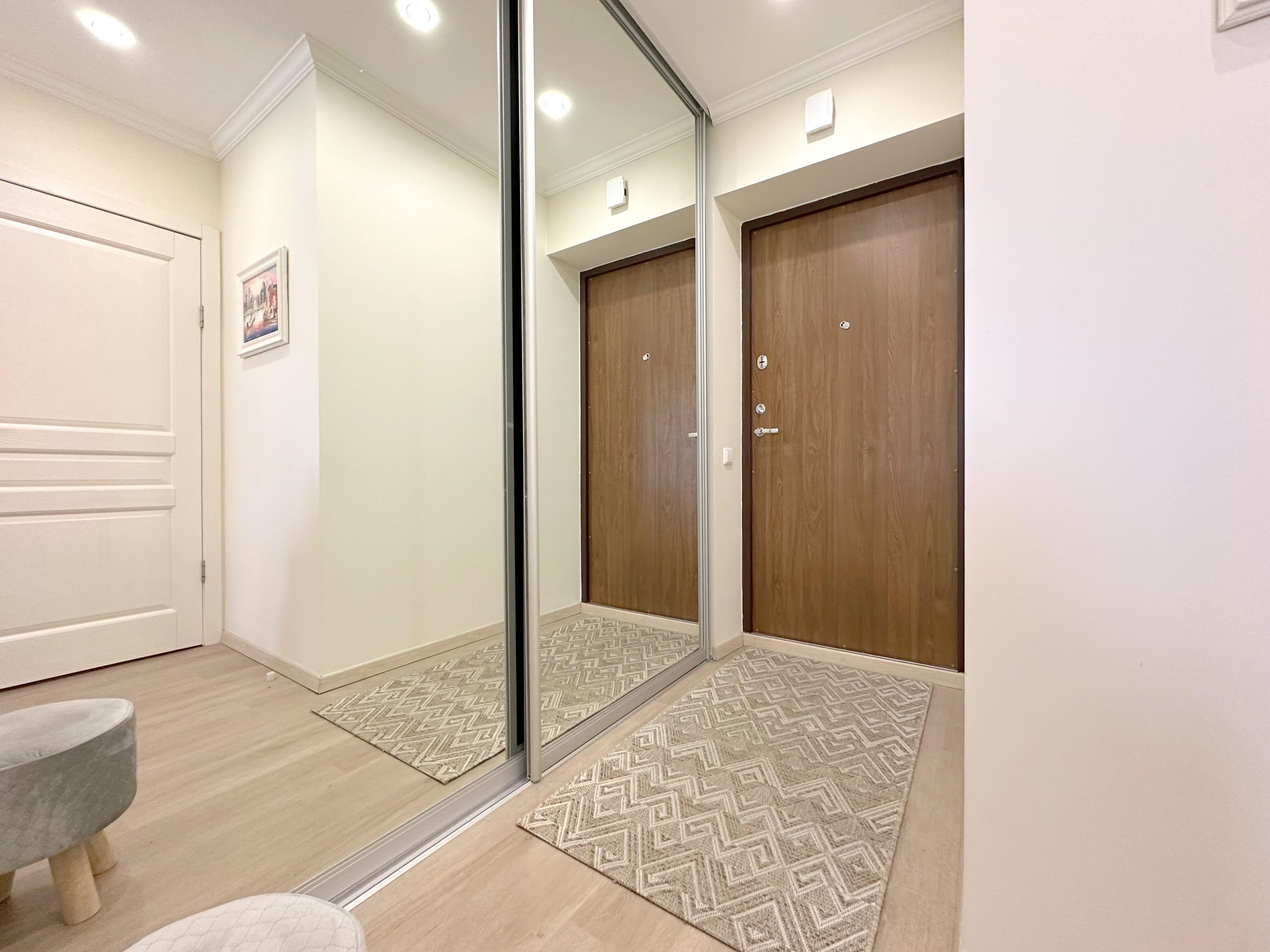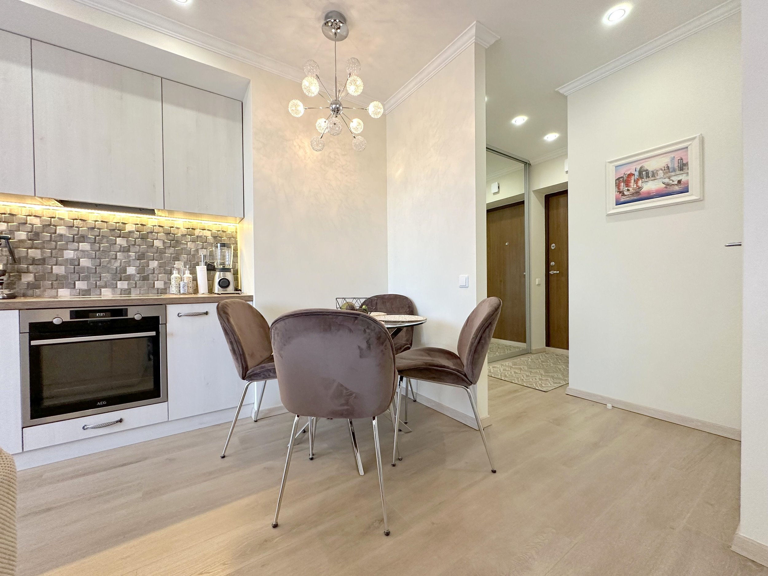 Bute yra visi reikalingiausi baldai, skalbimo mašina su džiovykle, indaplovė, šaldytuvas, viryklė, orkaitė ir t.t.